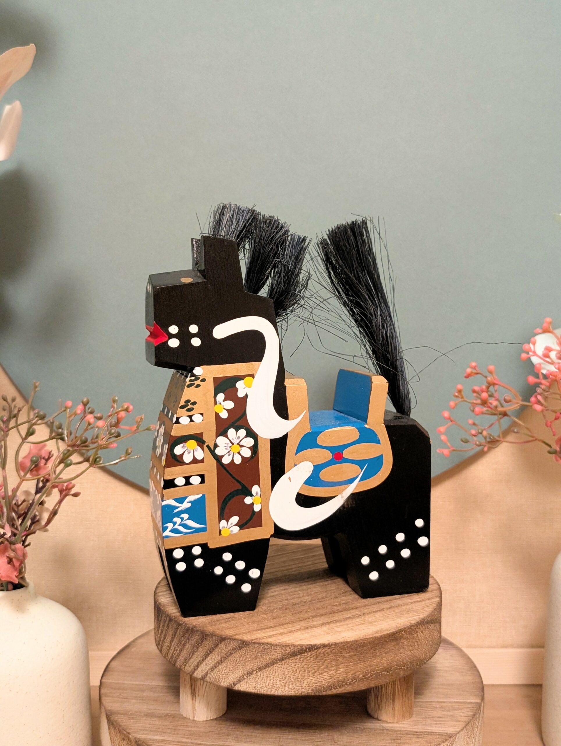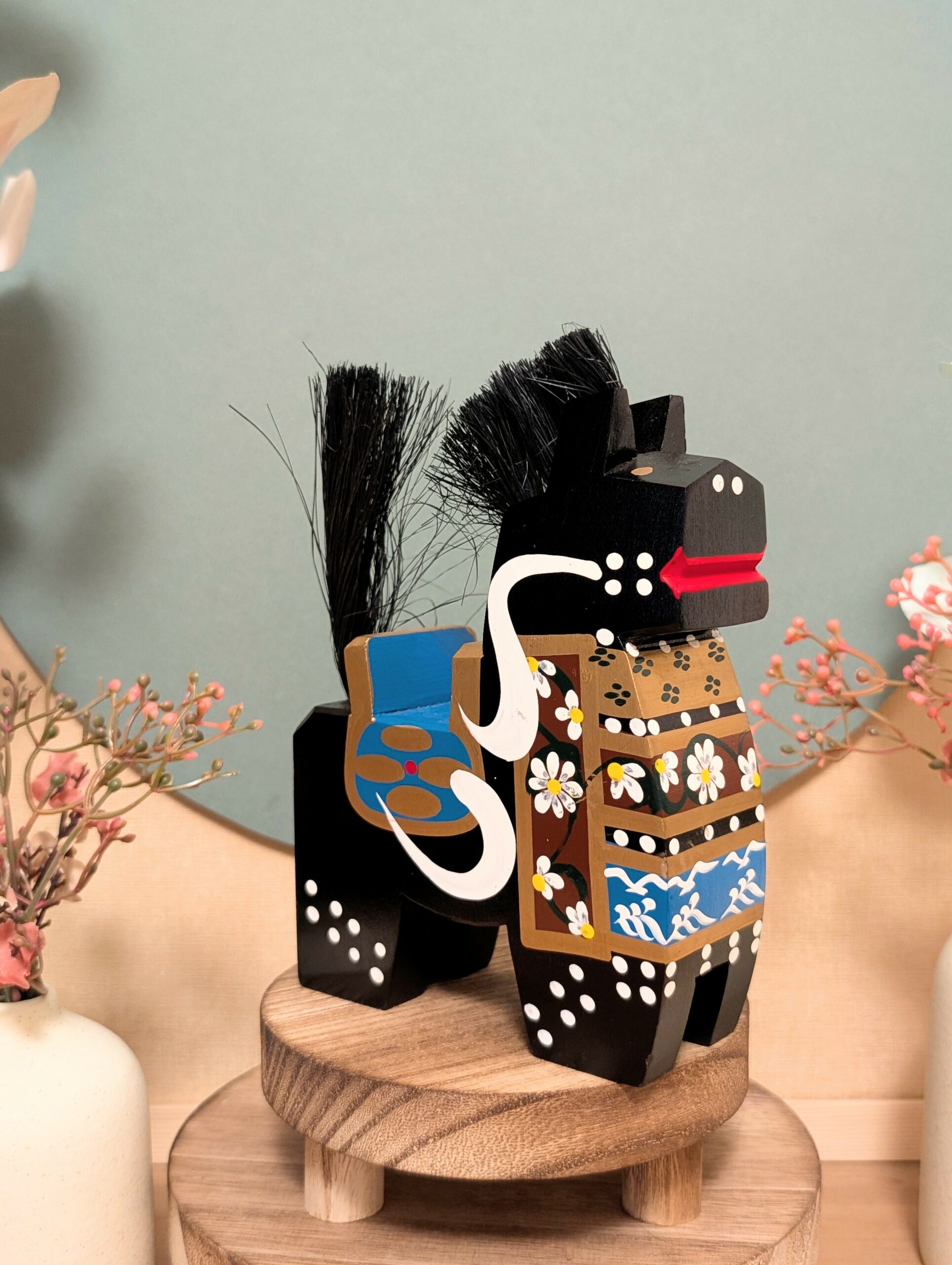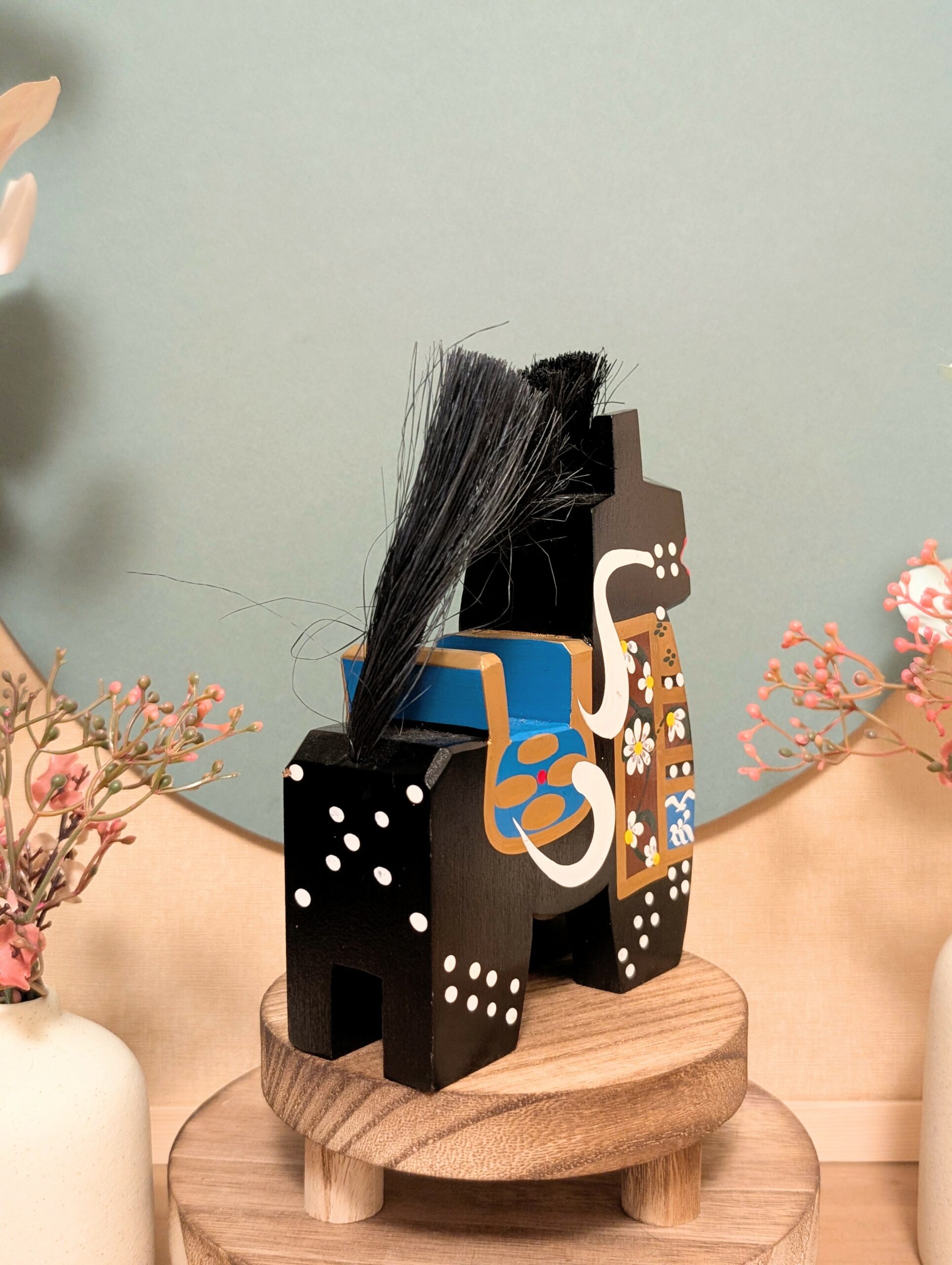 🔹 Chaque facette de ce petit cheval a été sculptée à la main dans un bois noble, puis délicatement peinte avec des motifs floraux et des arabesques.