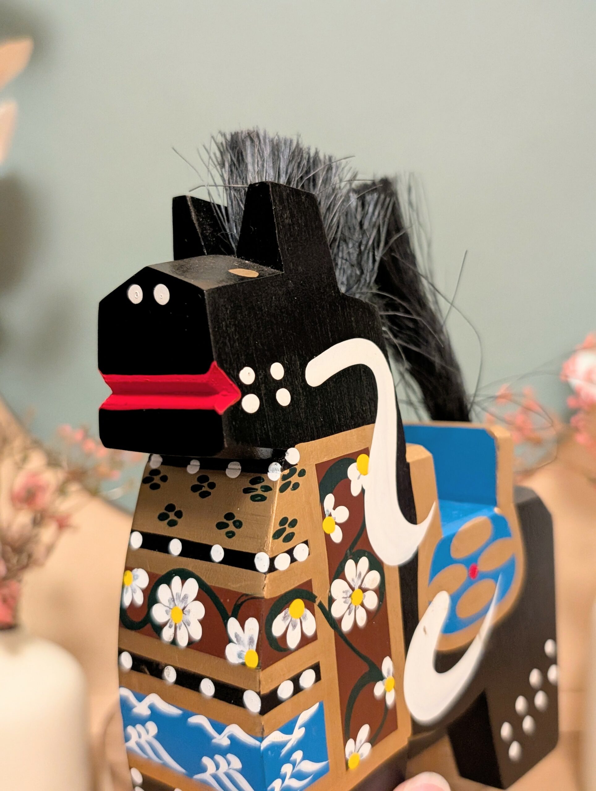 🔹 Chaque facette de ce petit cheval a été sculptée à la main dans un bois noble, puis délicatement peinte avec des motifs floraux et des arabesques.