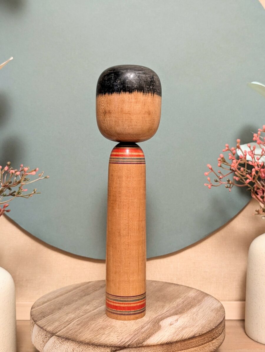 Élégante Kokeshi traditionnelle japonaise réalisée par Bunkichi SATO, maître artisan de l’école Hijiori, originaire de la région montagneuse d’Ōkura.