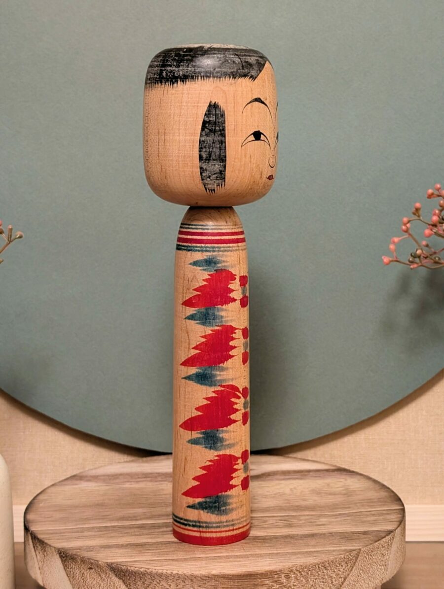 🔹Cette Kokeshi a une tête relativement grande par rapport au corps, ce qui est typique du style Hijiori. La tête est ronde avec un visage expressif, les cheveux présentent une franche “hachi” caractéristique.