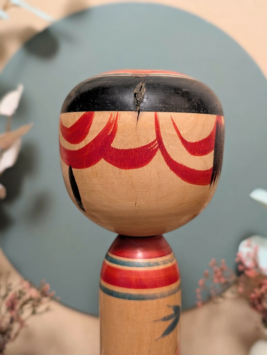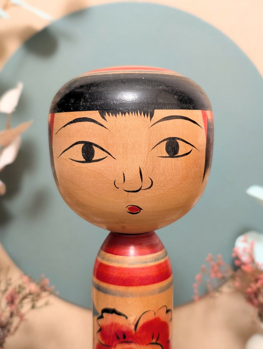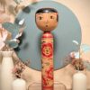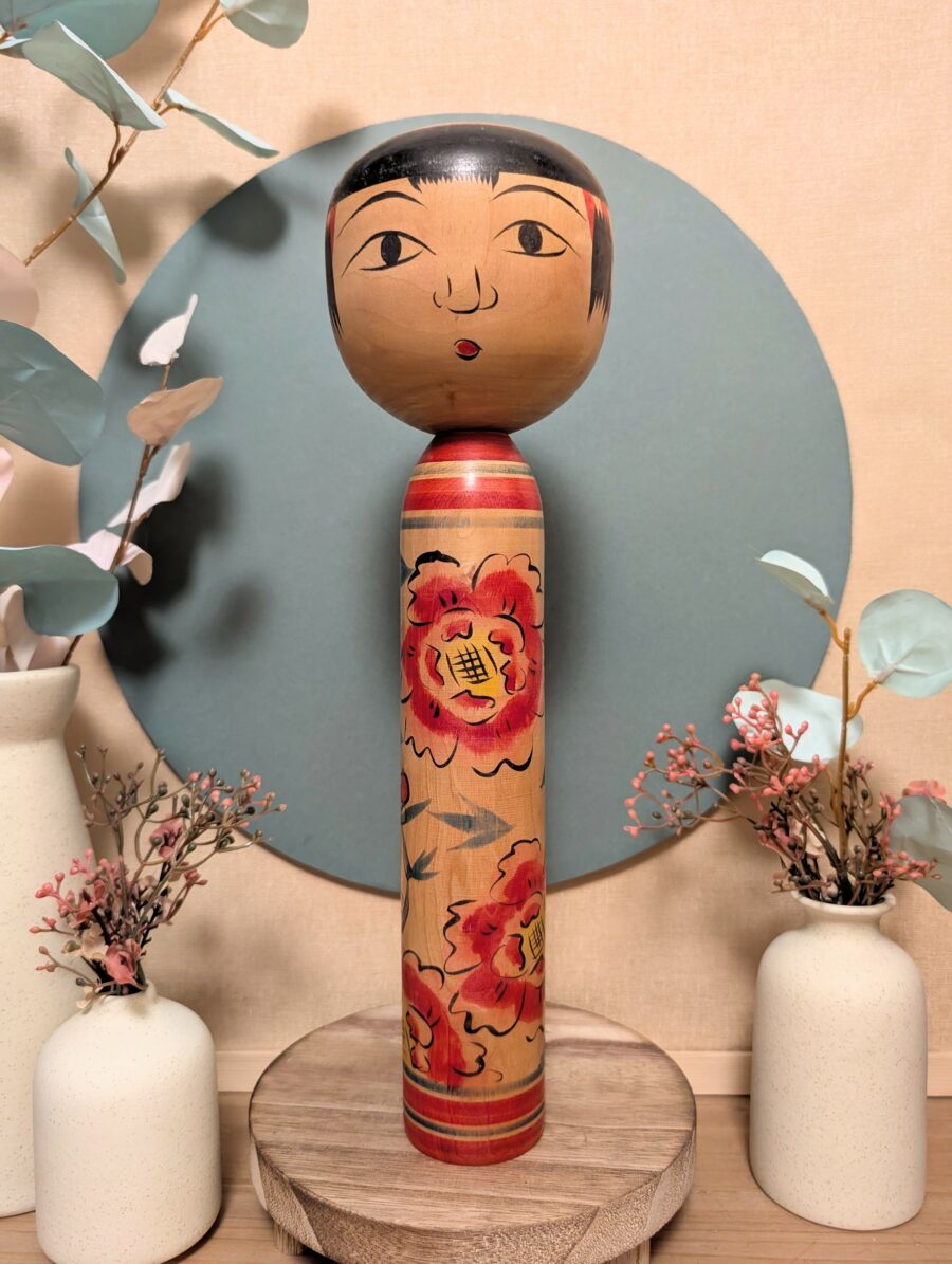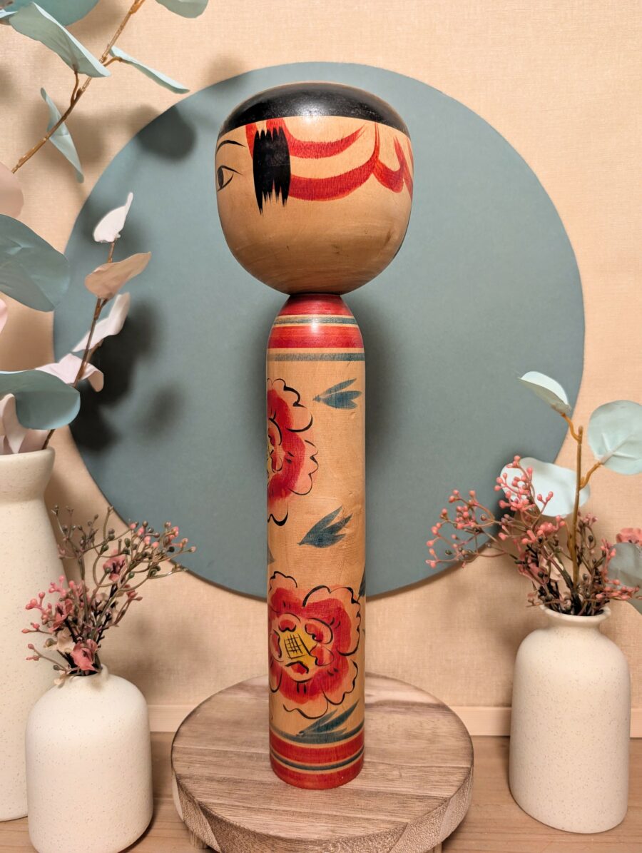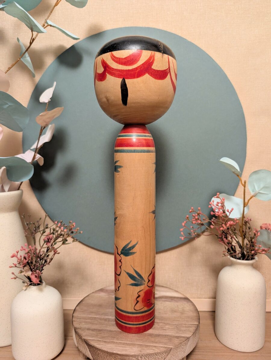 Cette spectaculaire Kokeshi Nakanosawa du maître Hiroshi HONDA se distingue par ses dimensions généreuses et son motif floral éclatant.