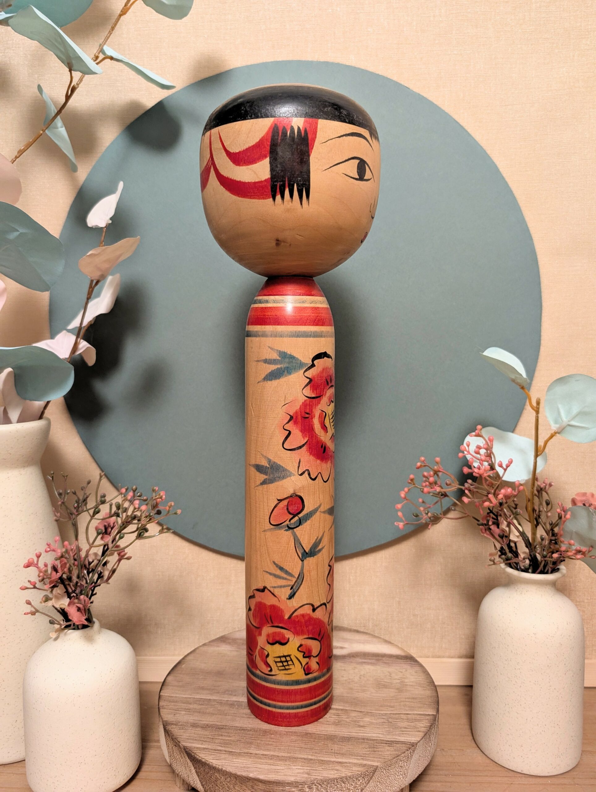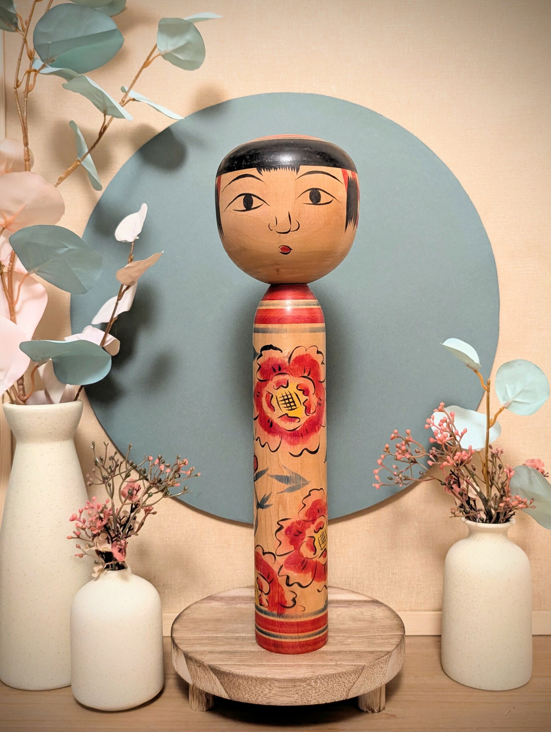 Cette spectaculaire Kokeshi Nakanosawa du maître Hiroshi HONDA se distingue par ses dimensions généreuses et son motif floral éclatant.