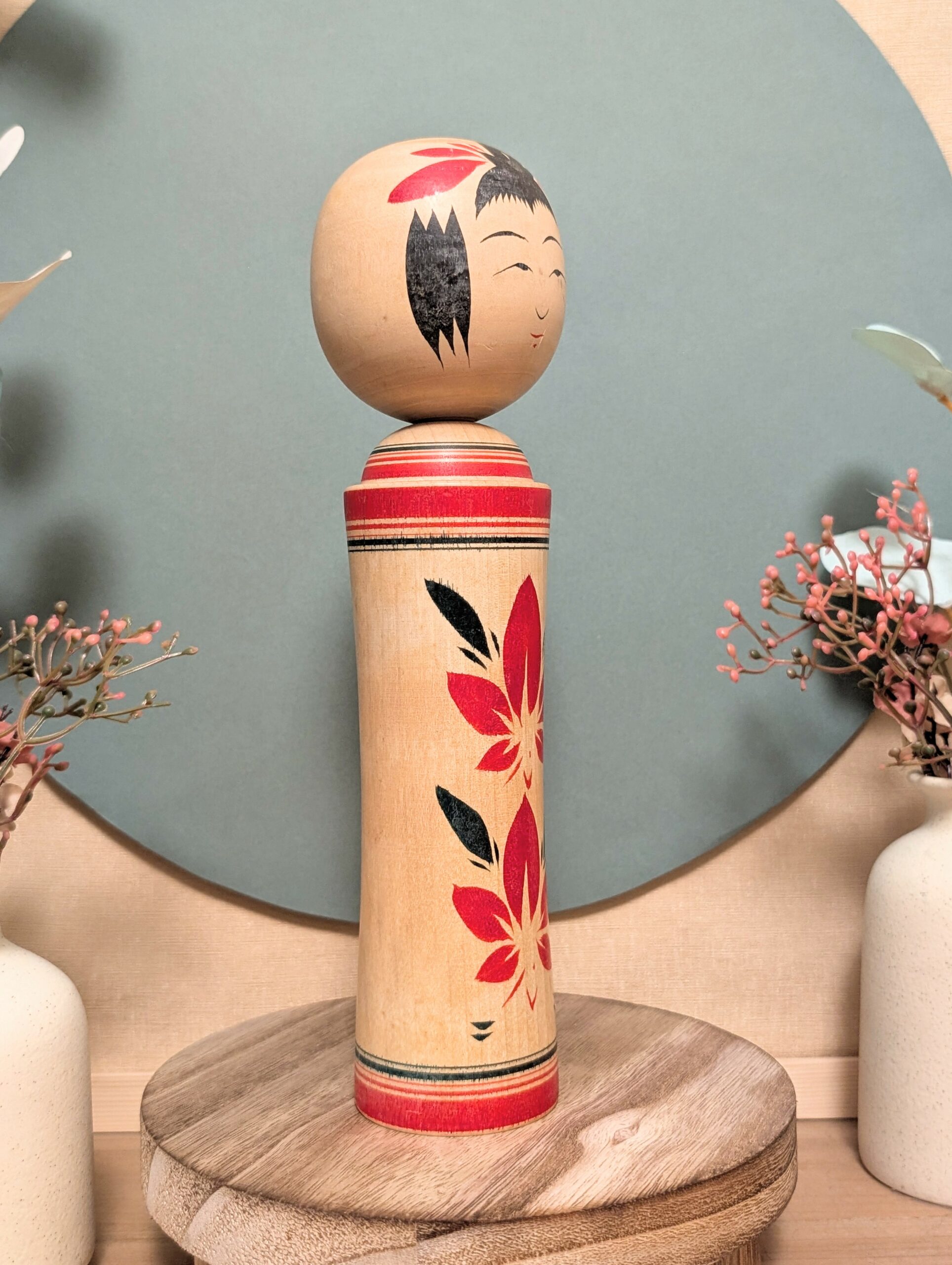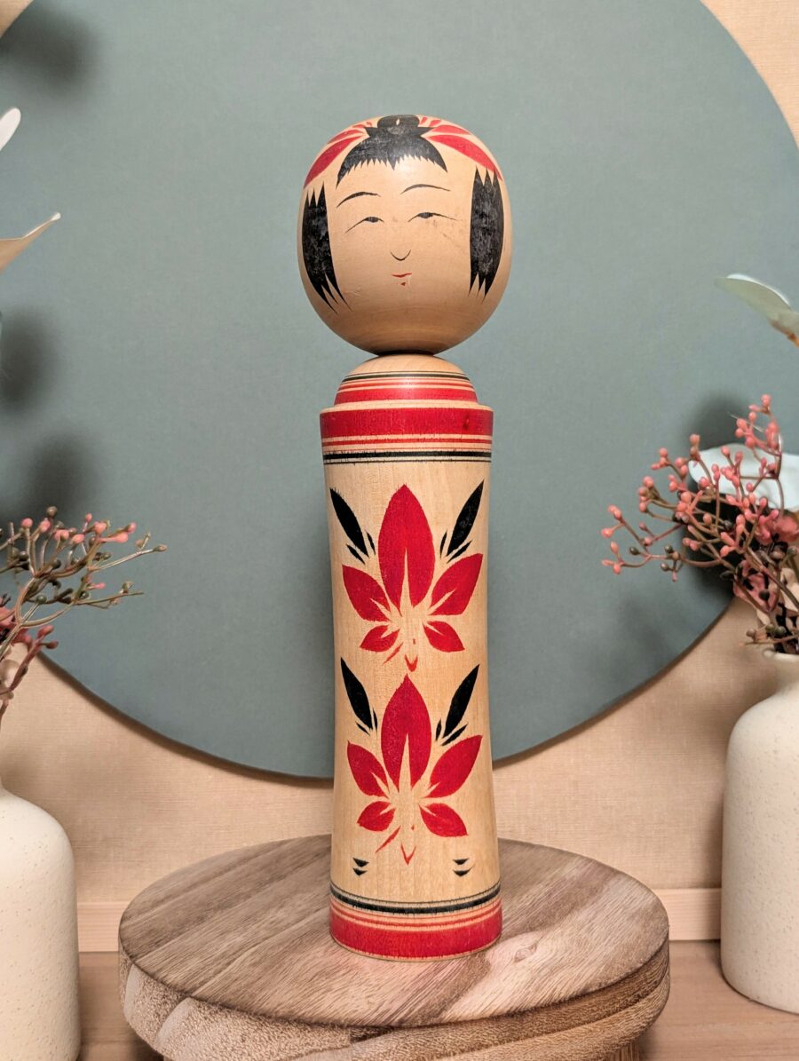 🔹 La poupée présente un corps cylindrique orné de deux grandes feuilles d’érable (momiji) stylisées et peintes à la main.