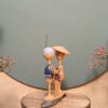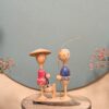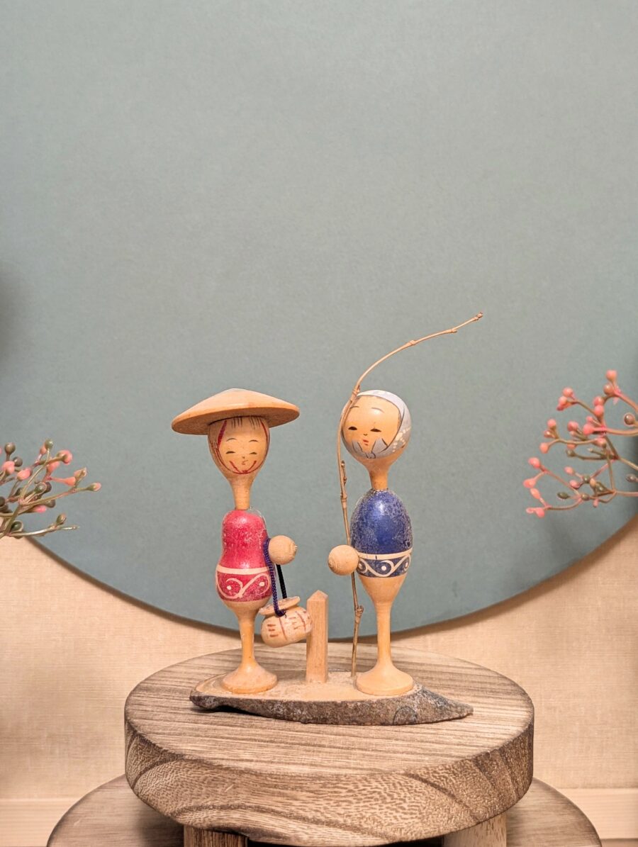 Charmant ensemble de Kokeshi artisanales au style Omiyage représentant une scène de vie rurale japonaise, probablement inspirée de la région historique de Dazaifu.