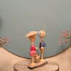 🔹 L’une, vêtue de rouge et coiffée d’un chapeau de paille, tient un petit seau suspendu à une cordelette. L’autre, en bleu avec foulard sur la tête, porte une canne ou une branche, peut-être pour la pêche.