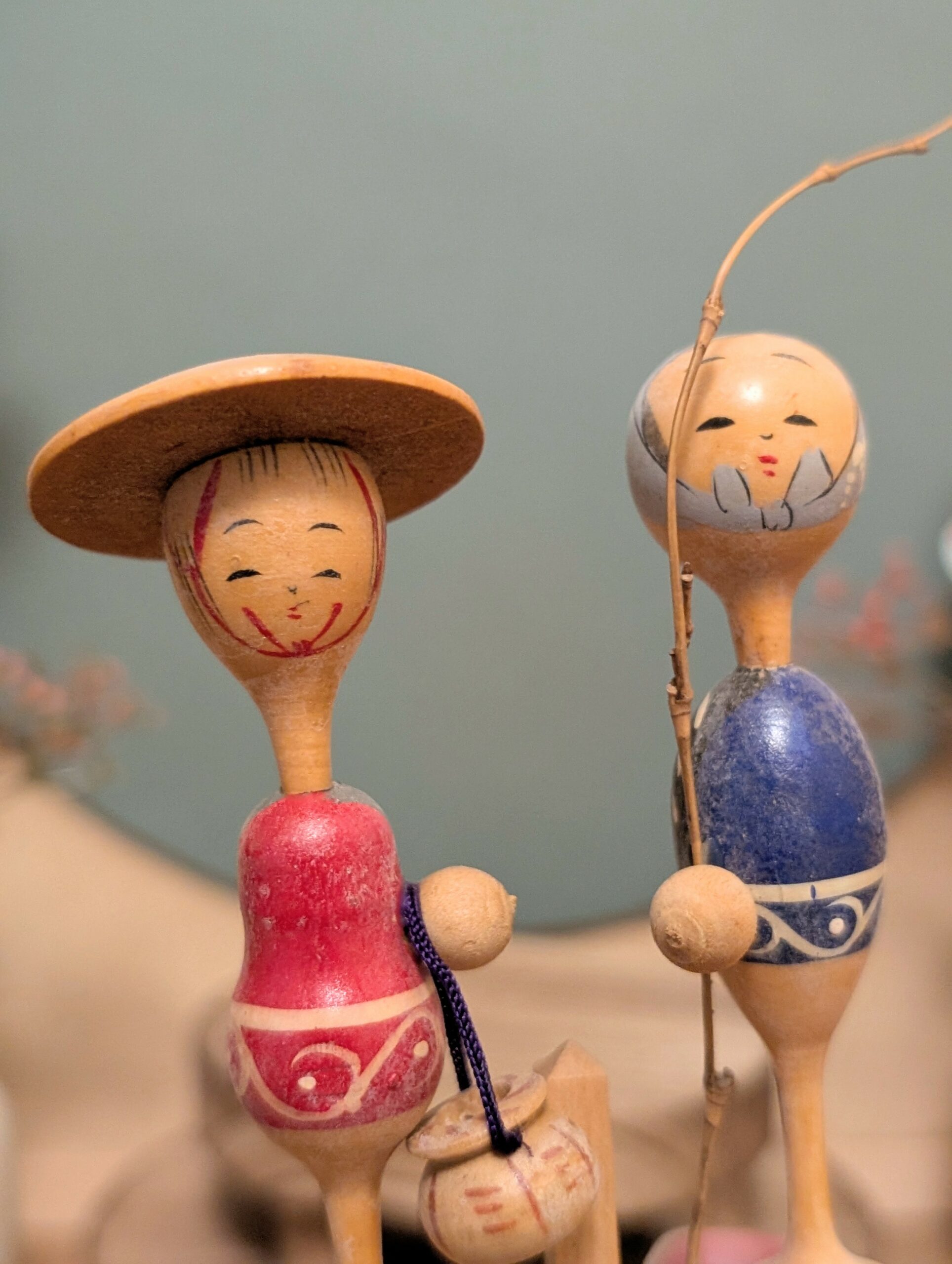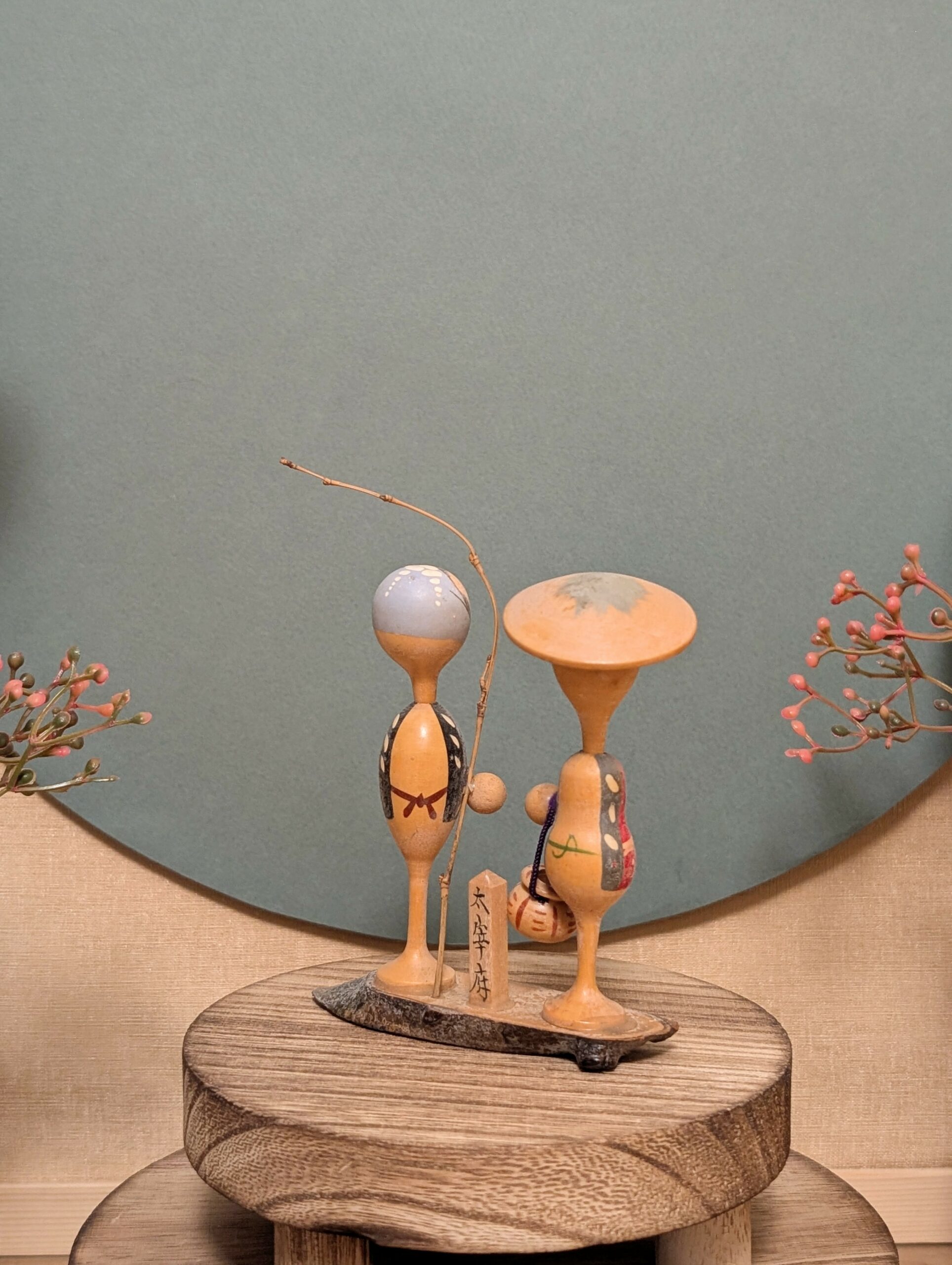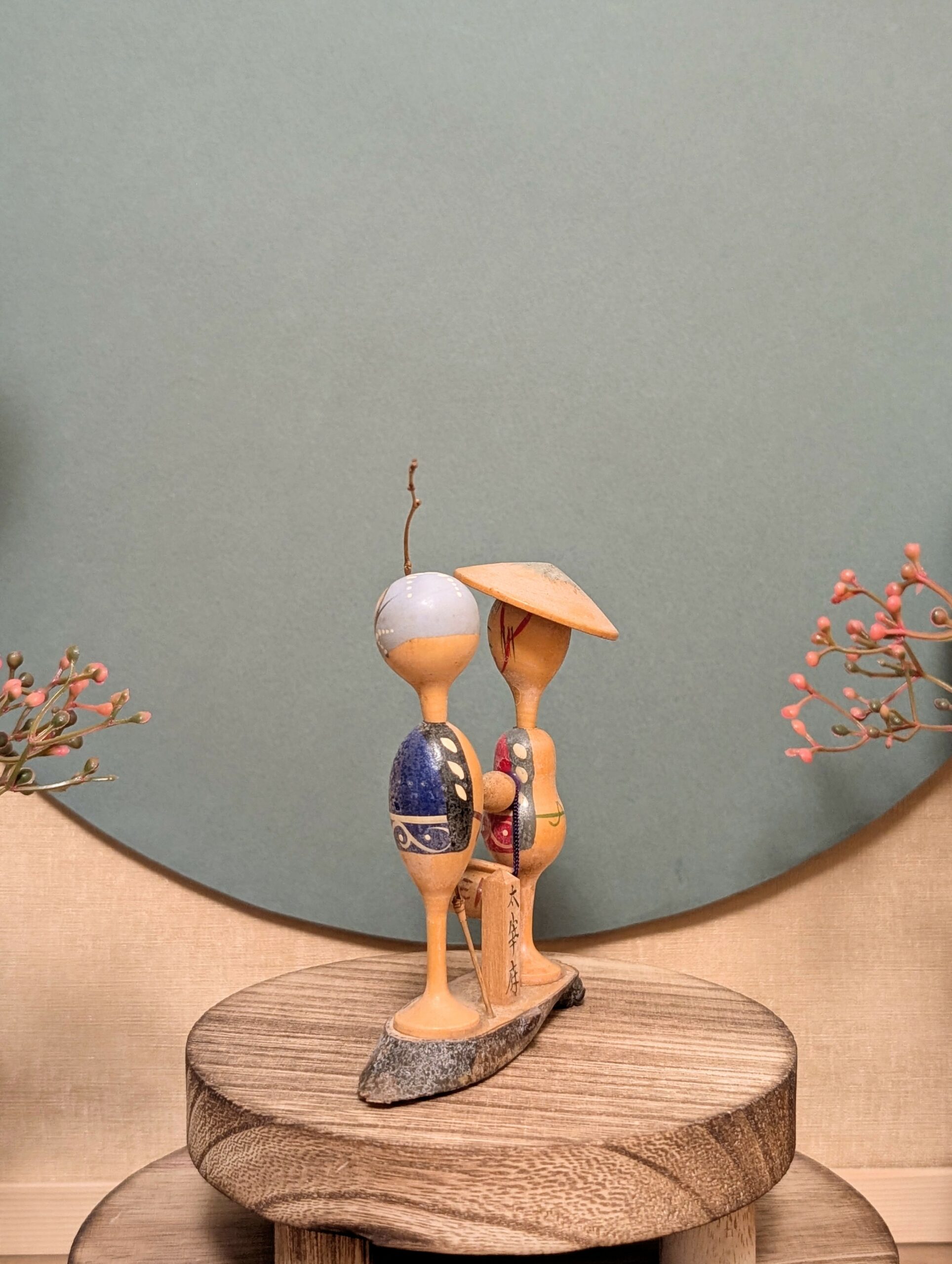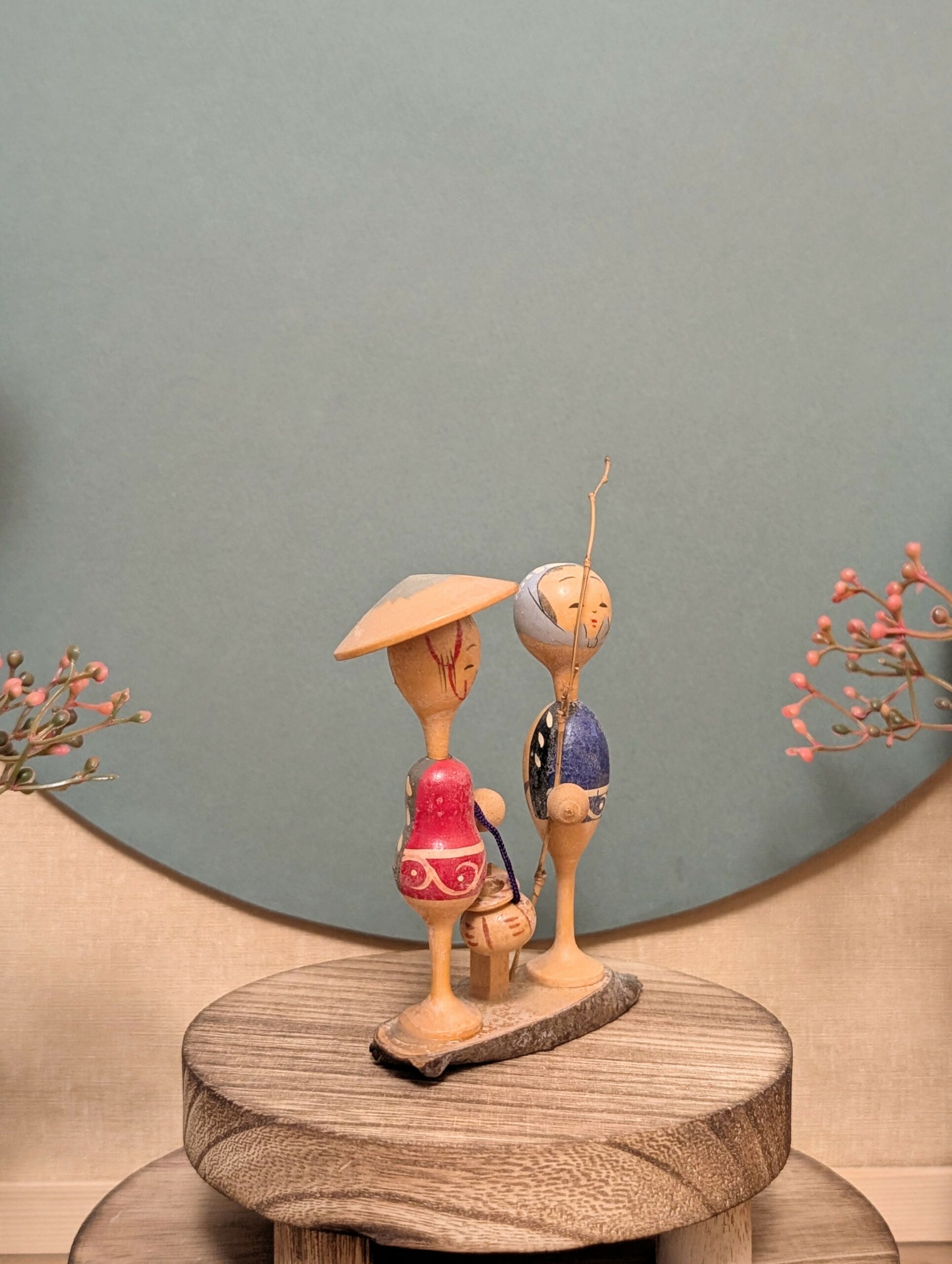 Charmant ensemble de Kokeshi artisanales au style Omiyage représentant une scène de vie rurale japonaise, probablement inspirée de la région historique de Dazaifu.
