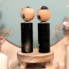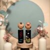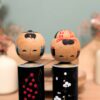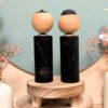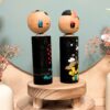 Ce charmant duo de Kokeshi Omiyage se compose de deux figurines en bois assorties, peintes à la main, représentant un couple stylisé.