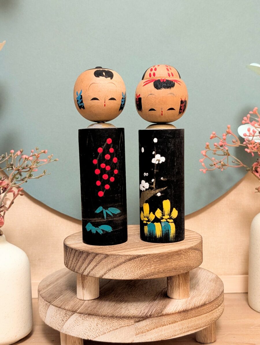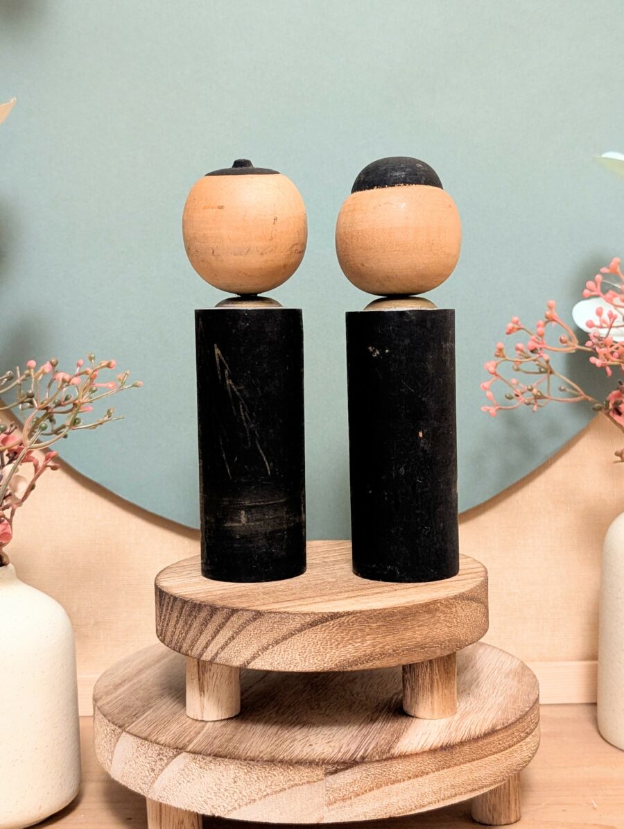 Ces kokeshi présentent les marques naturelles du temps et de l’usage, discrètes et cohérentes avec leur âge, qui participent pleinement à leur charme vintage et à leur authenticité. Un joli duo décoratif, idéal pour une étagère, un bureau ou une collection de poupées japonaises traditionnelles.
