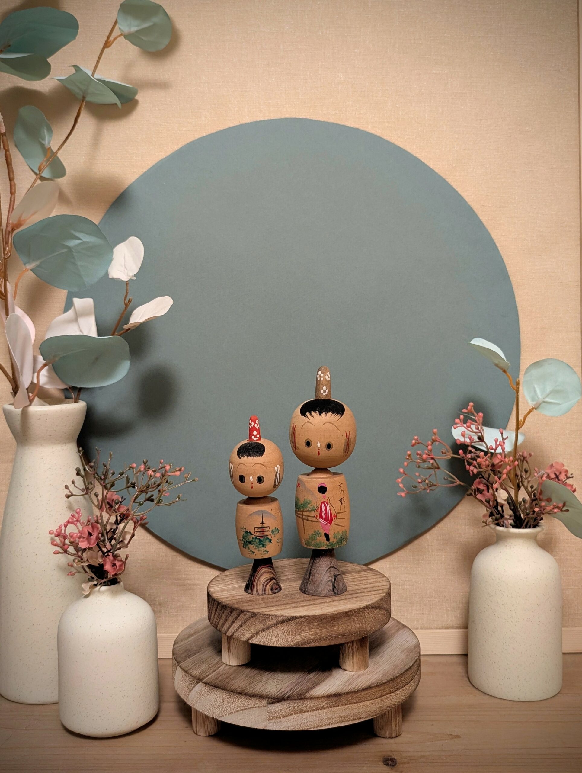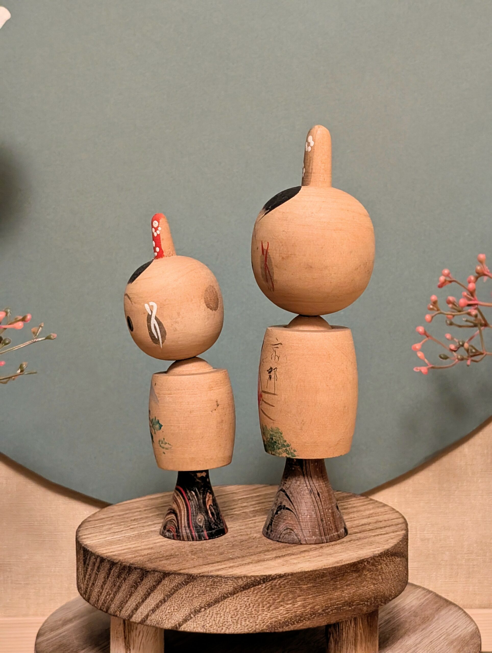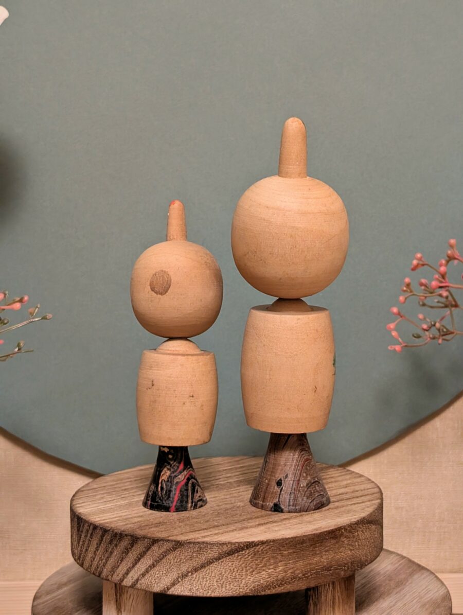 Ces deux pièces, avec leurs visages au style rétro et leurs bases en bois naturel veinées, incarnent parfaitement le charme des Kokeshi Souvenirs d’après-guerre : simples, colorées et pleines de douceur.