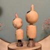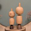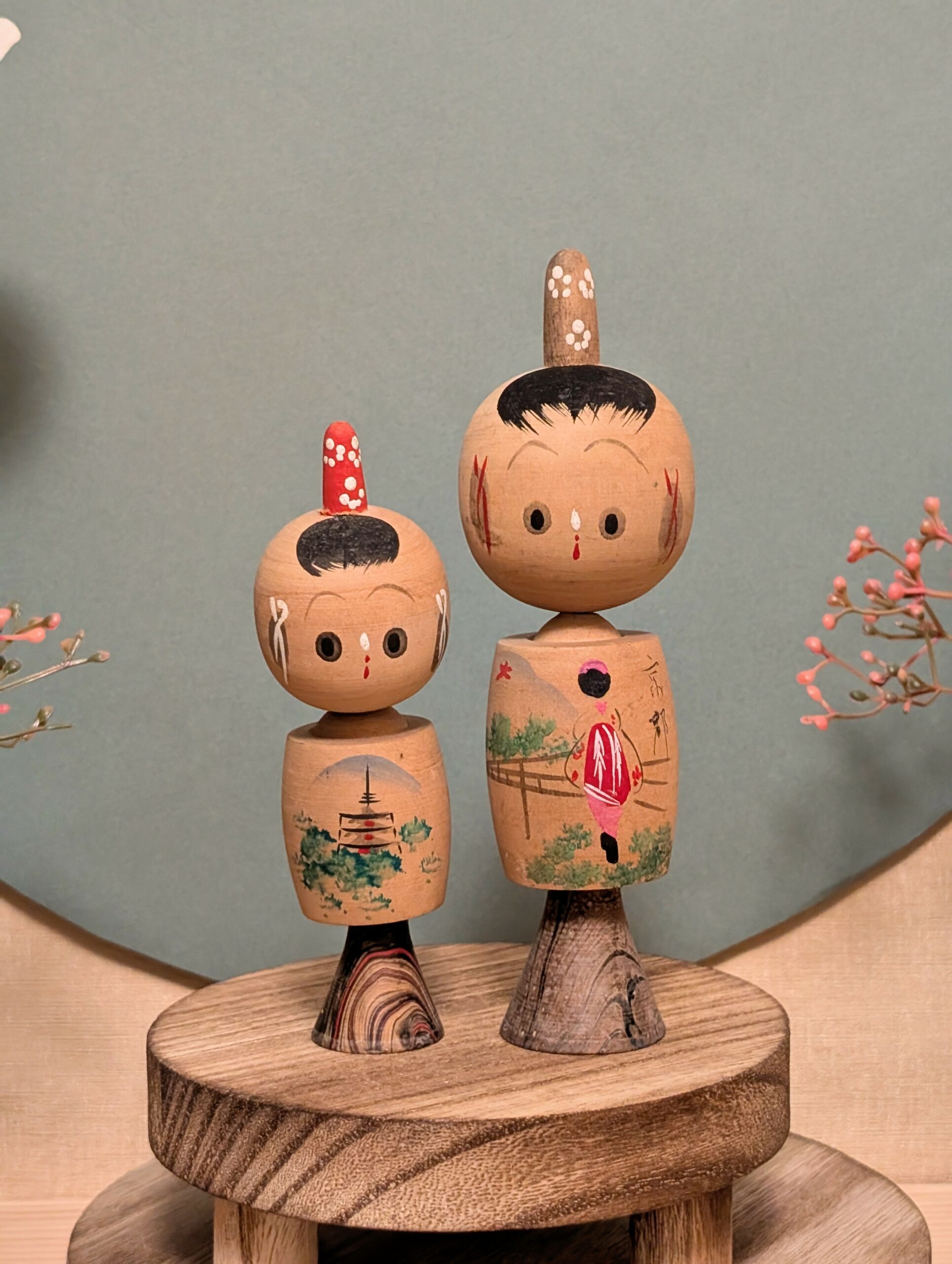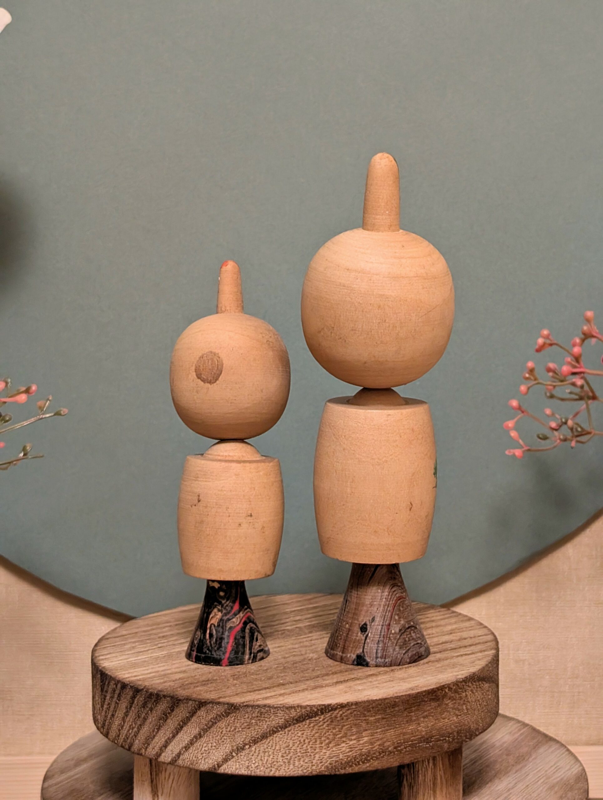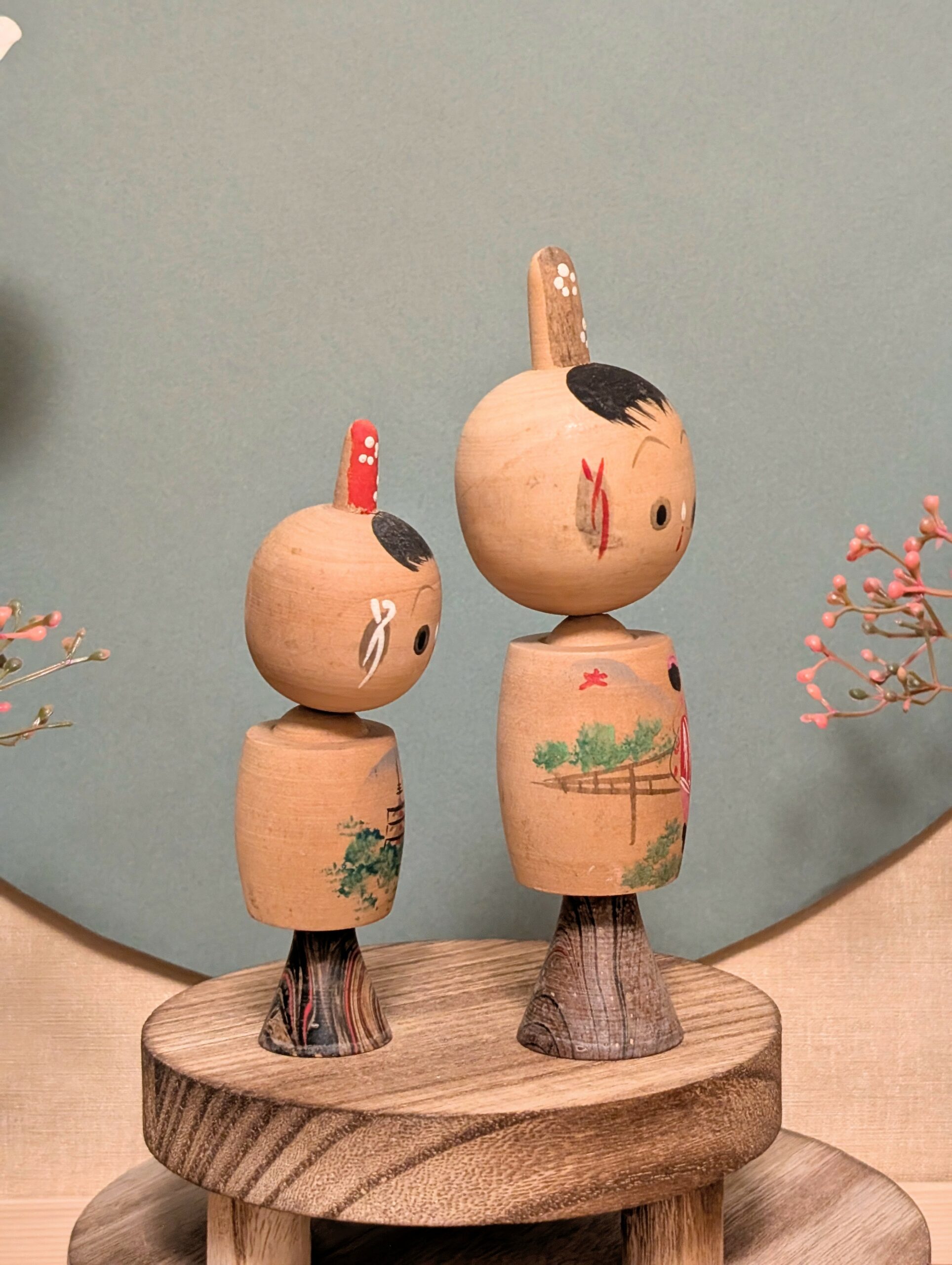 Ces deux pièces, avec leurs visages au style rétro et leurs bases en bois naturel veinées, incarnent parfaitement le charme des Kokeshi Souvenirs d’après-guerre : simples, colorées et pleines de douceur.