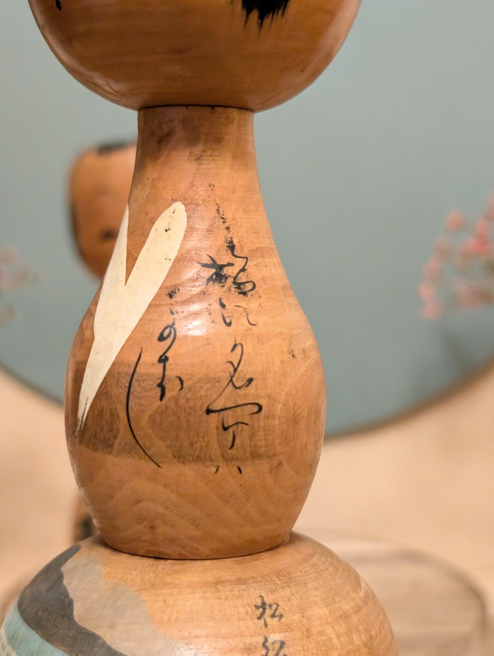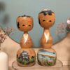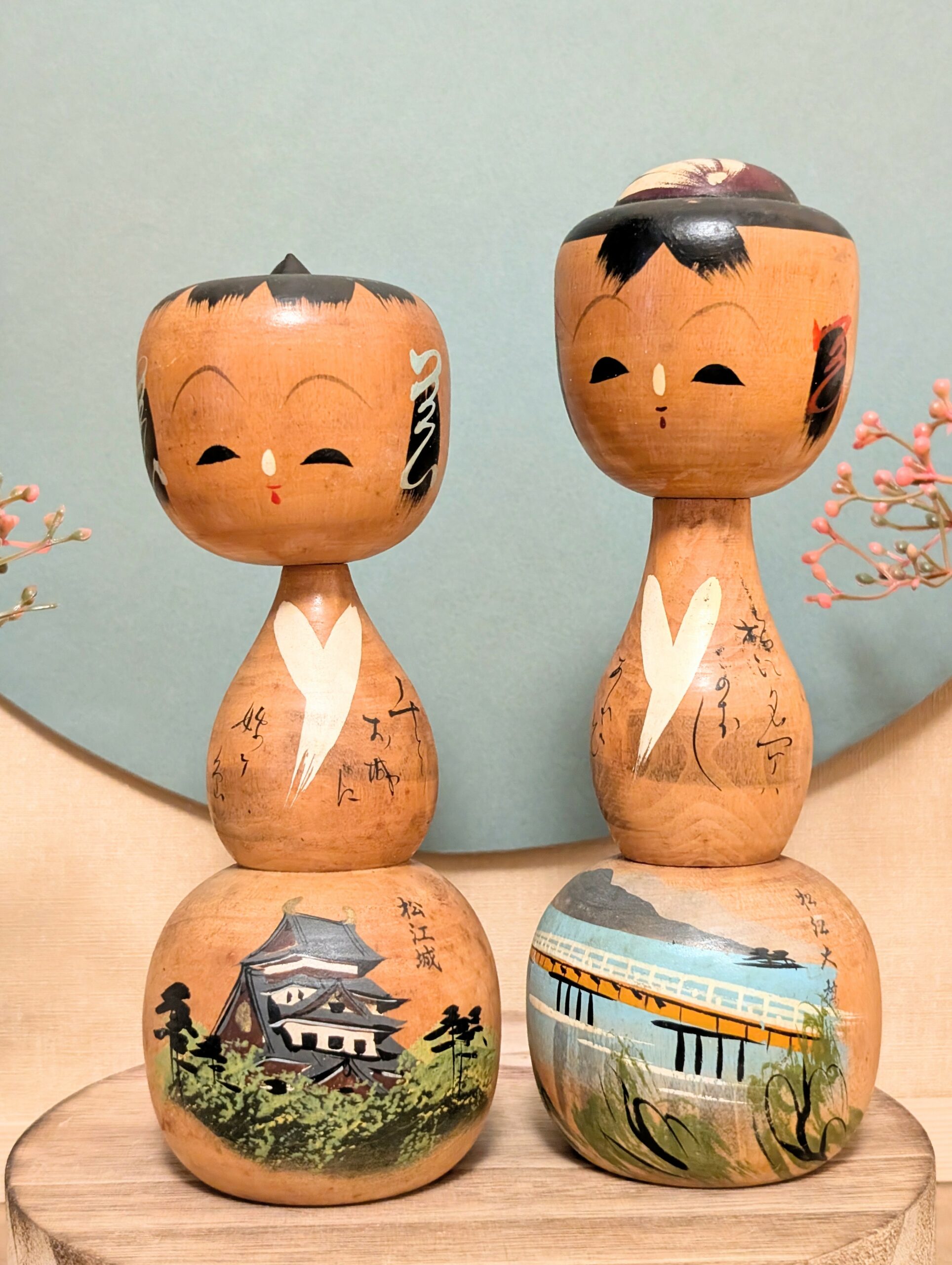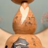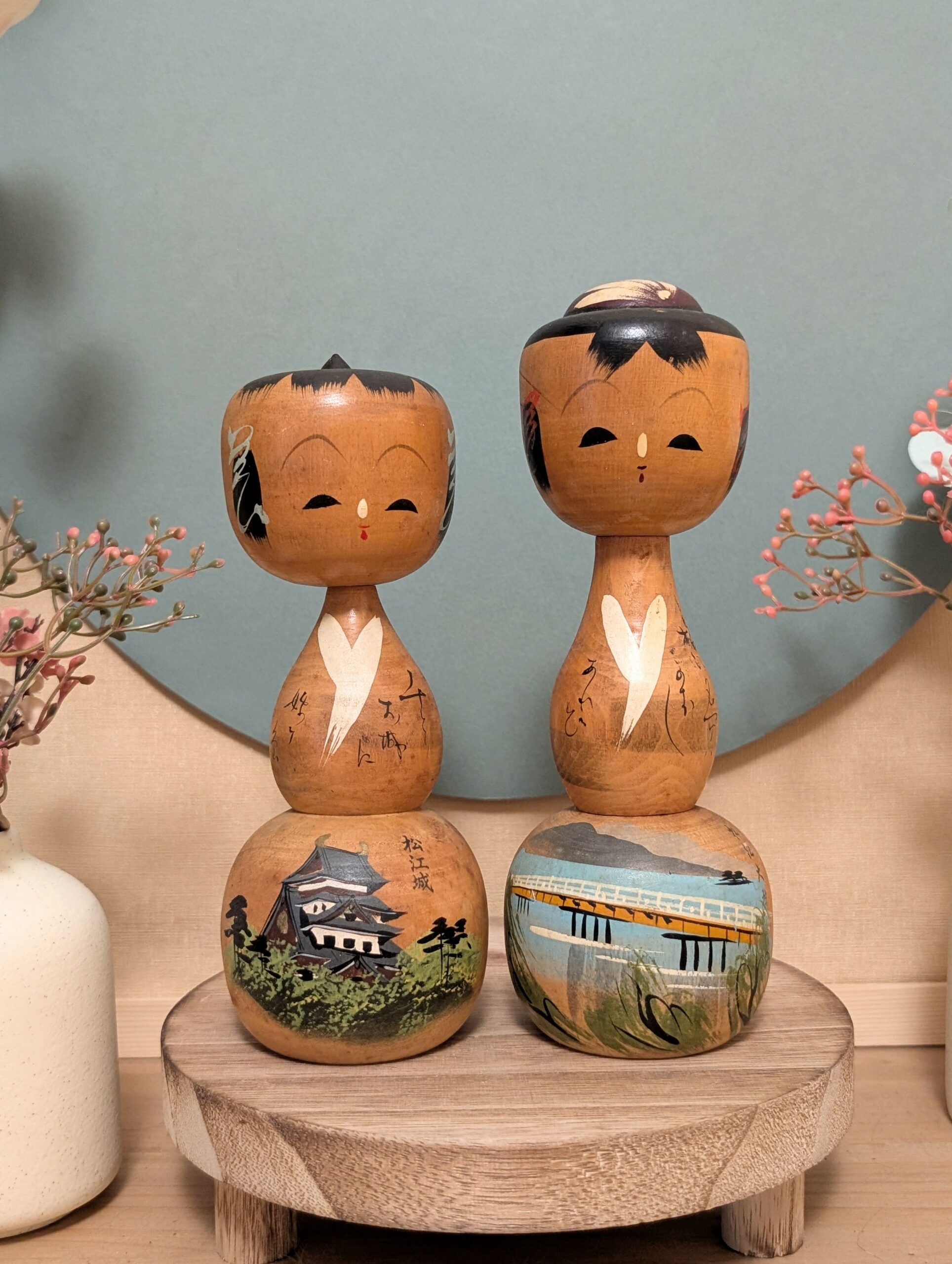 Ces Kokeshi représentent un pan du Japon d’après-guerre, où les artisans locaux créaient des souvenirs uniques pour les visiteurs. Leur charme rétro, leurs scènes pittoresques et leur forme en calebasse en font des pièces idéales pour une collection de Kokeshi Omiyage ou d’art populaire japonais.