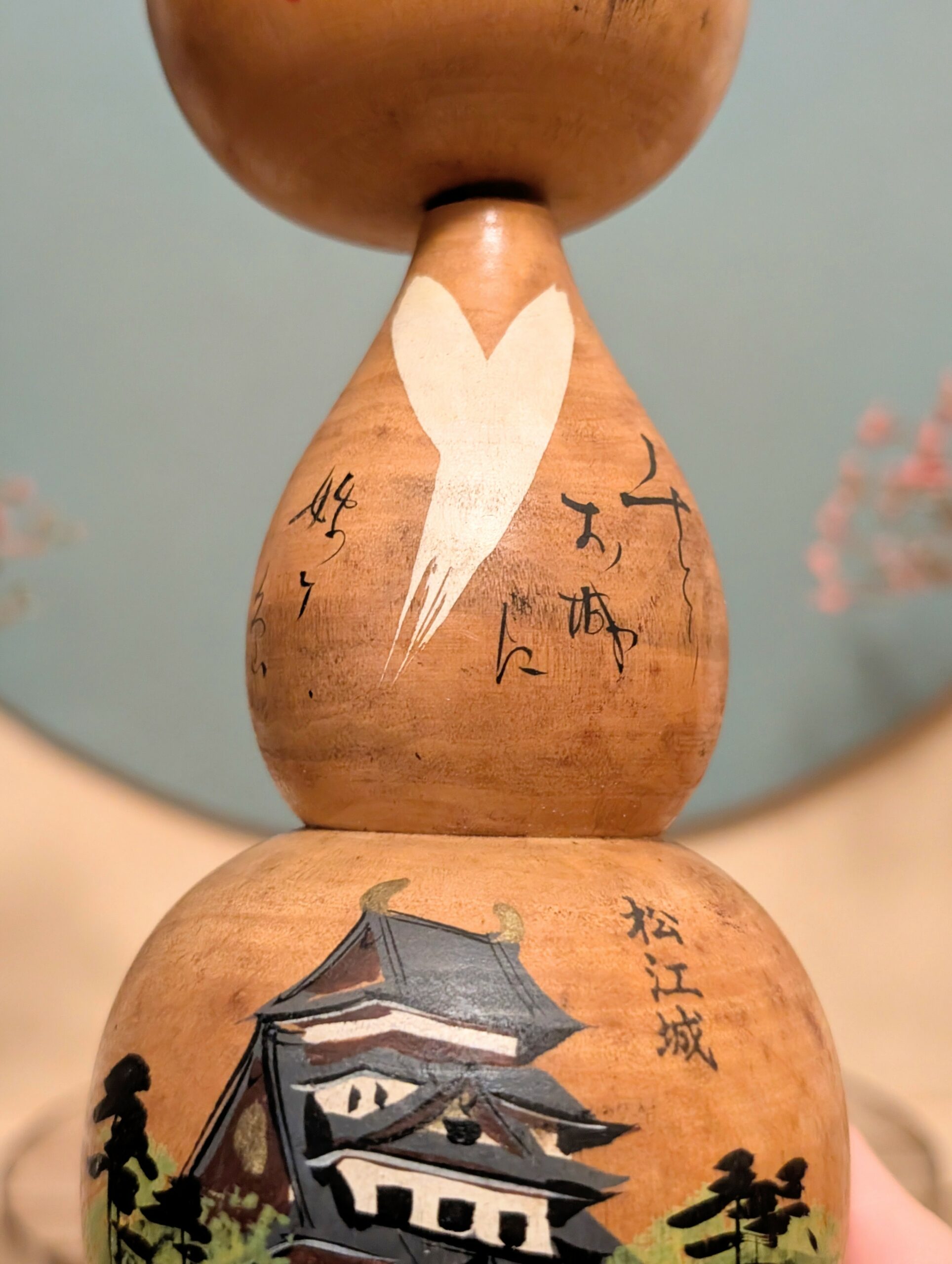 🔹 Chaque Kokeshi arbore un col blanc et une scène emblématique de Matsue :