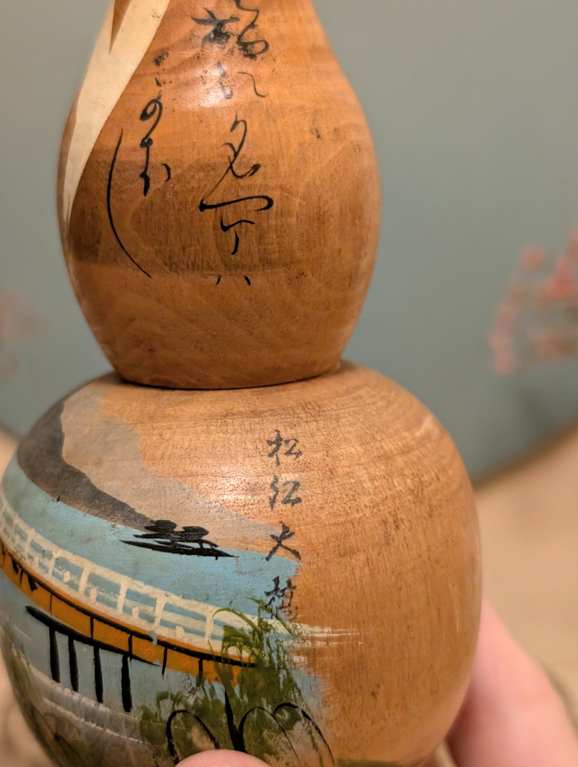 Ces Kokeshi représentent un pan du Japon d’après-guerre, où les artisans locaux créaient des souvenirs uniques pour les visiteurs. Leur charme rétro, leurs scènes pittoresques et leur forme en calebasse en font des pièces idéales pour une collection de Kokeshi Omiyage ou d’art populaire japonais.