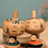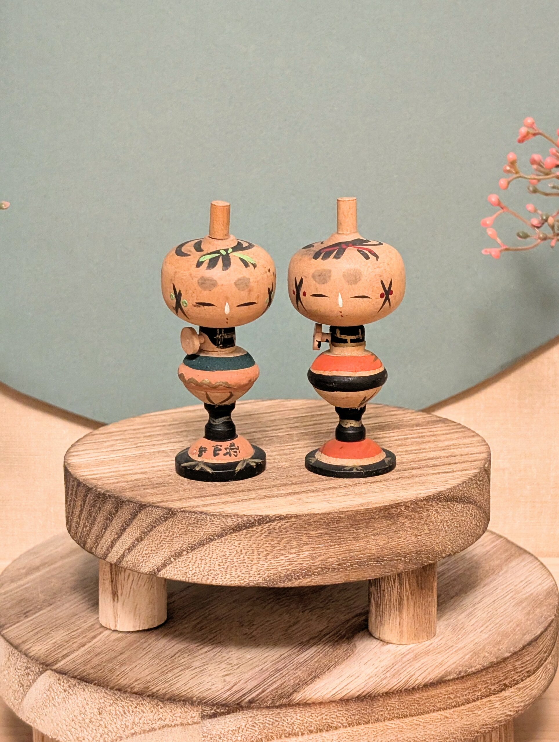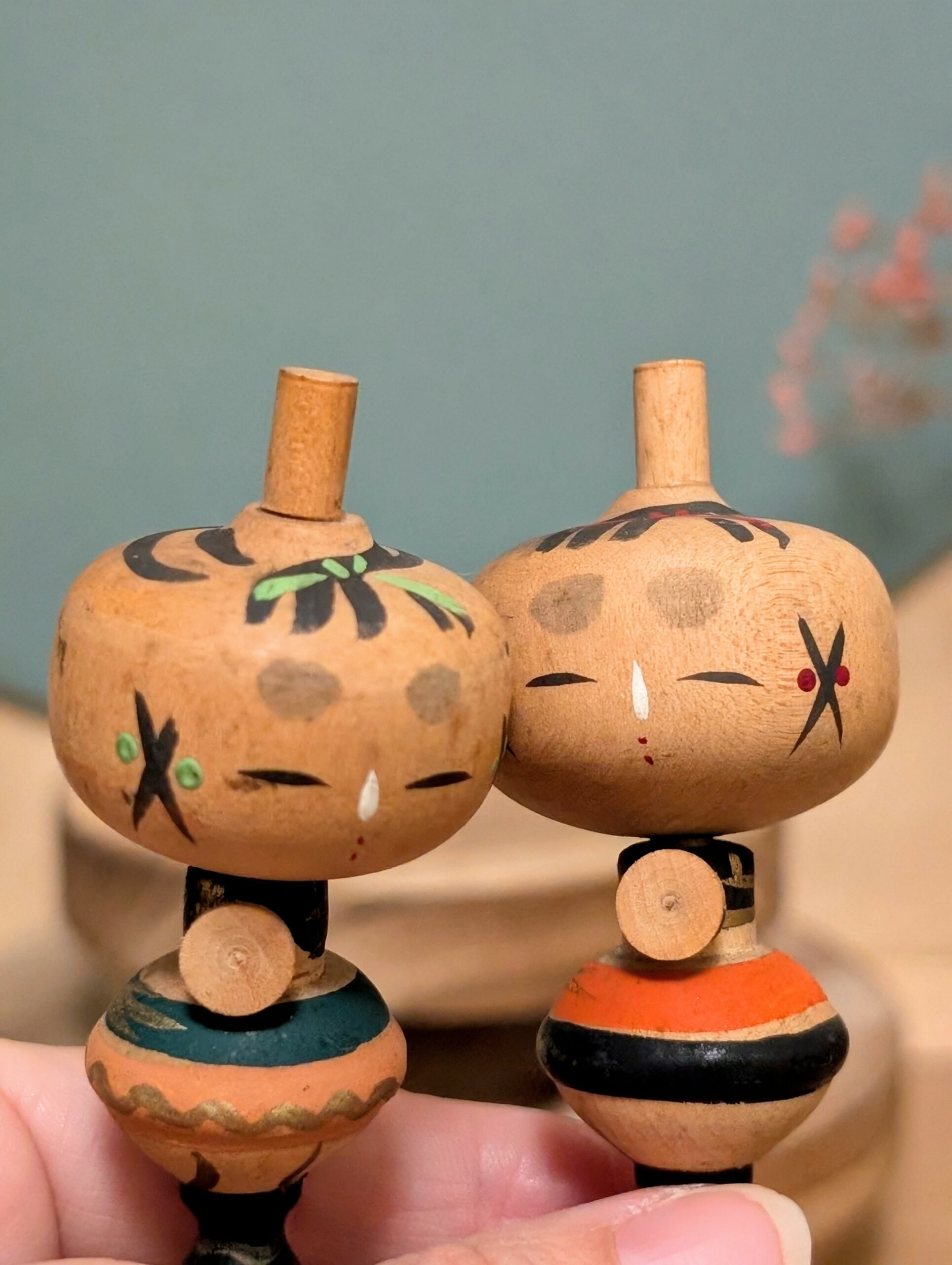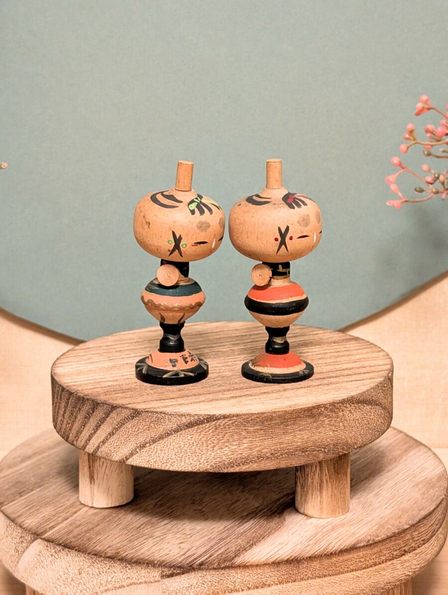 Il s’agit probablement de créations inspirées des styles traditionnels de Kokeshi, adaptées ici dans une version miniature et ludique. Ces modèles étaient souvent vendus en paire, représentant un couple harmonieux ou une offrande symbolique.