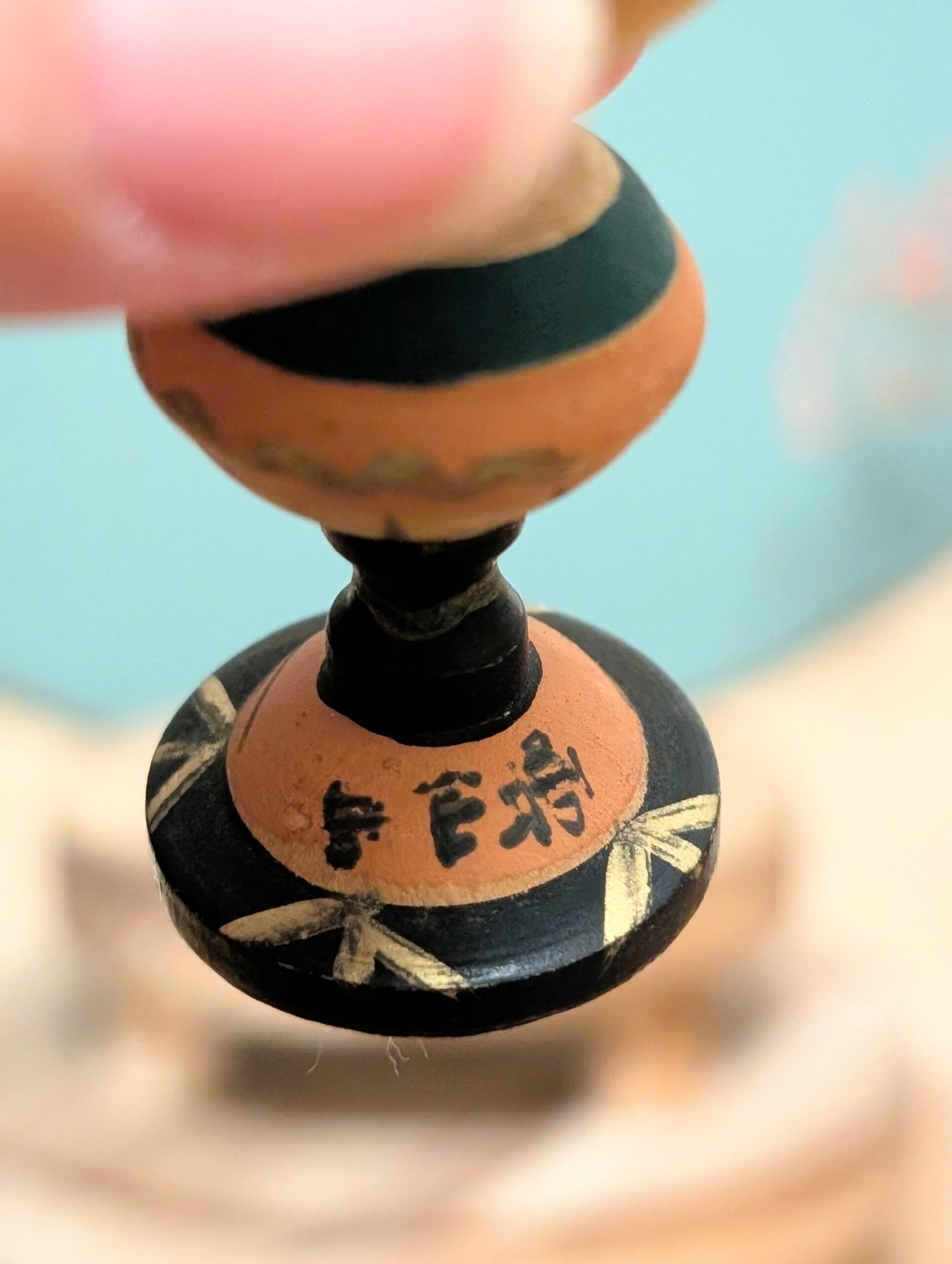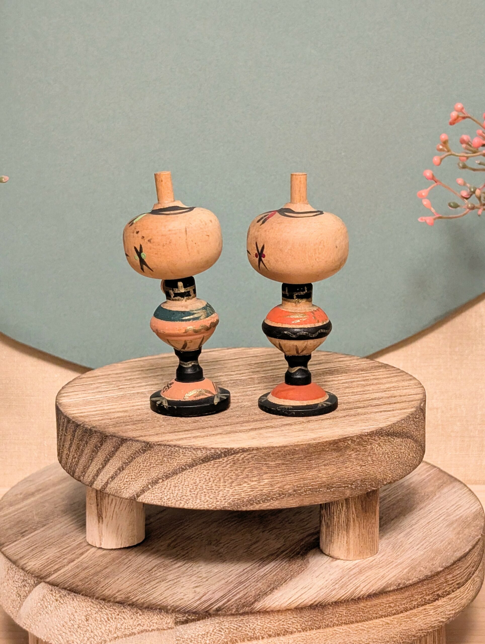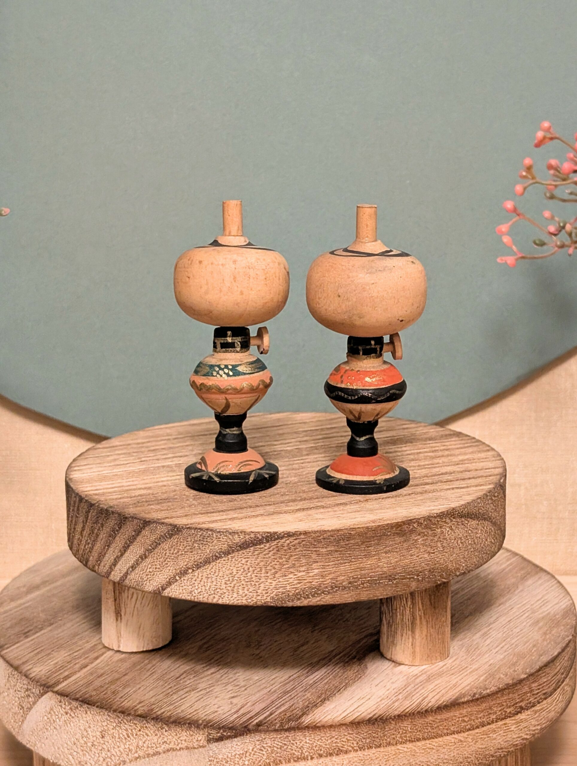 Il s’agit probablement de créations inspirées des styles traditionnels de Kokeshi, adaptées ici dans une version miniature et ludique. Ces modèles étaient souvent vendus en paire, représentant un couple harmonieux ou une offrande symbolique.