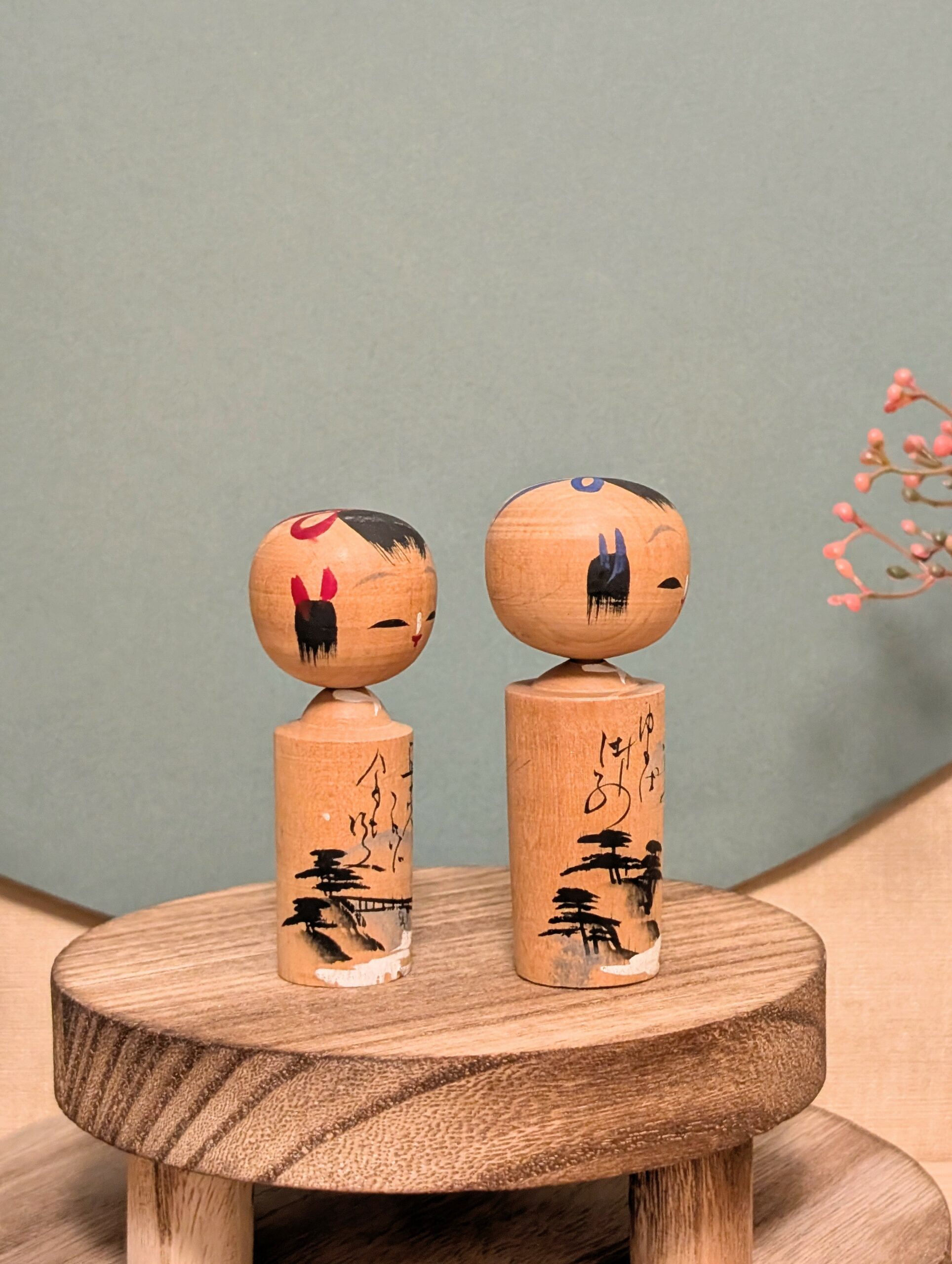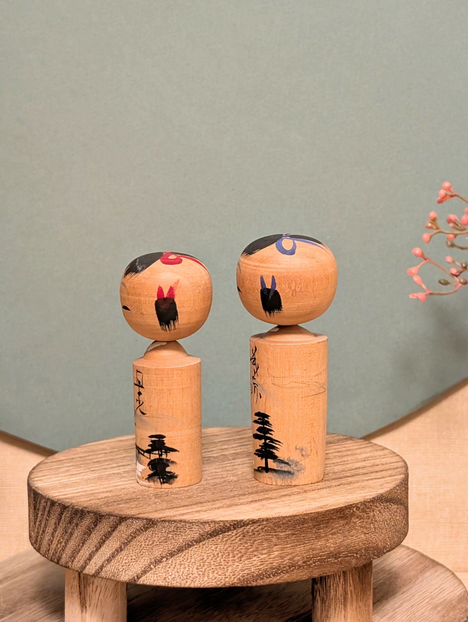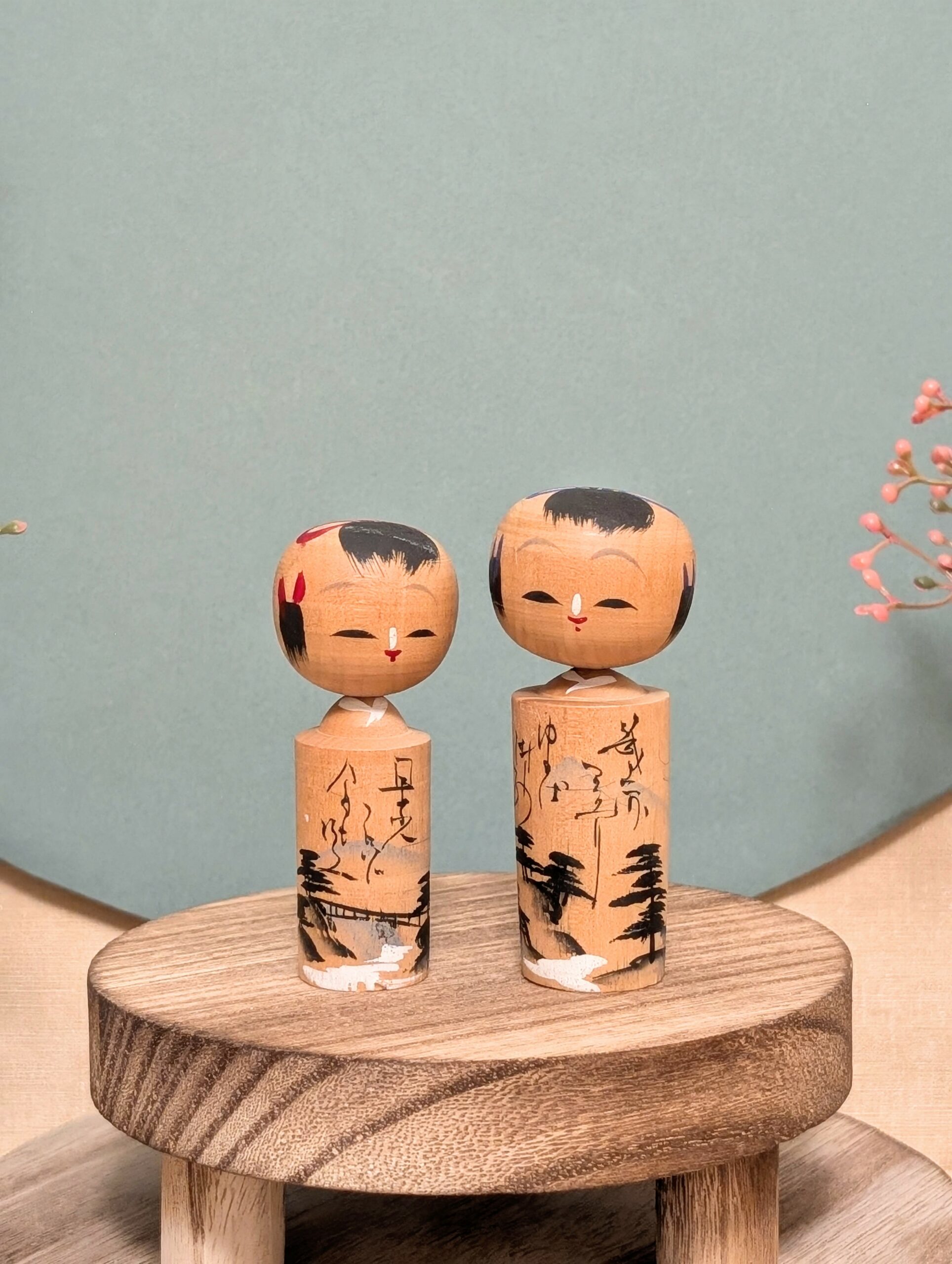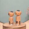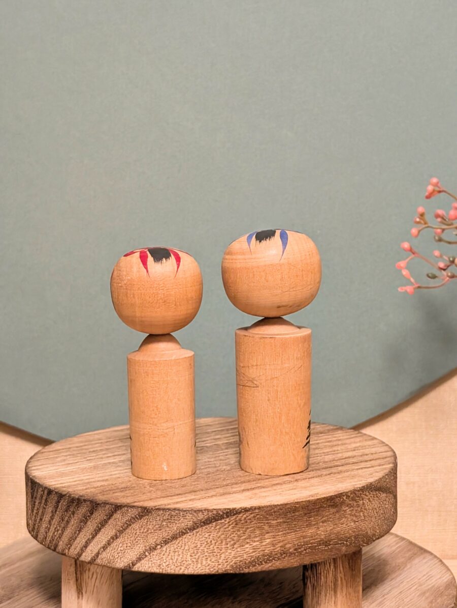 Ces deux petites Kokeshi Omiyage forment un charmant duo à l’expression douce et paisible.