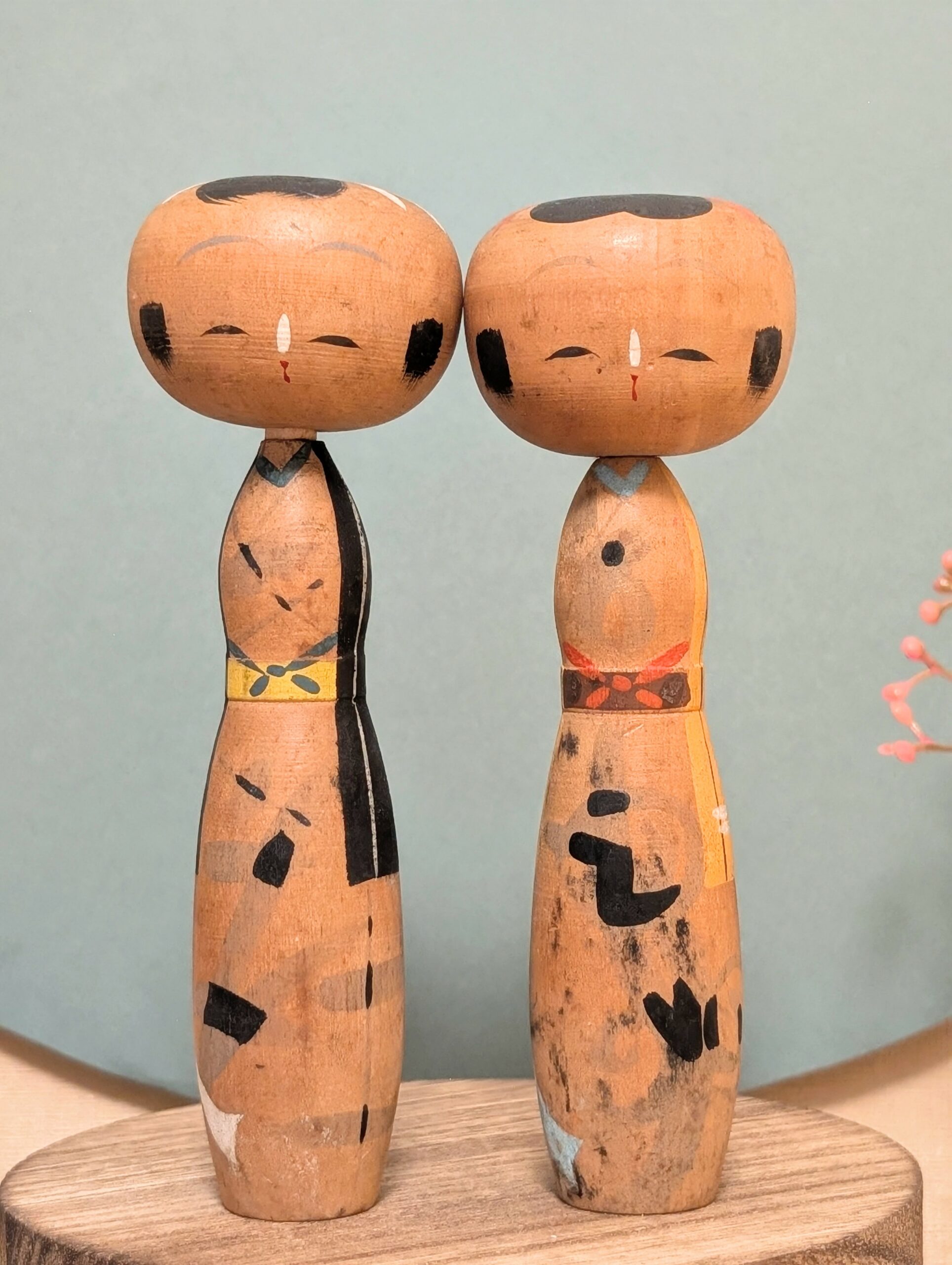🔹 Fabriquées en bois tourné, ces poupées affichent un style naïf et expressif typique de cette période où les Kokeshi étaient souvent ramenées comme souvenirs de voyage dans les régions thermales du Japon.