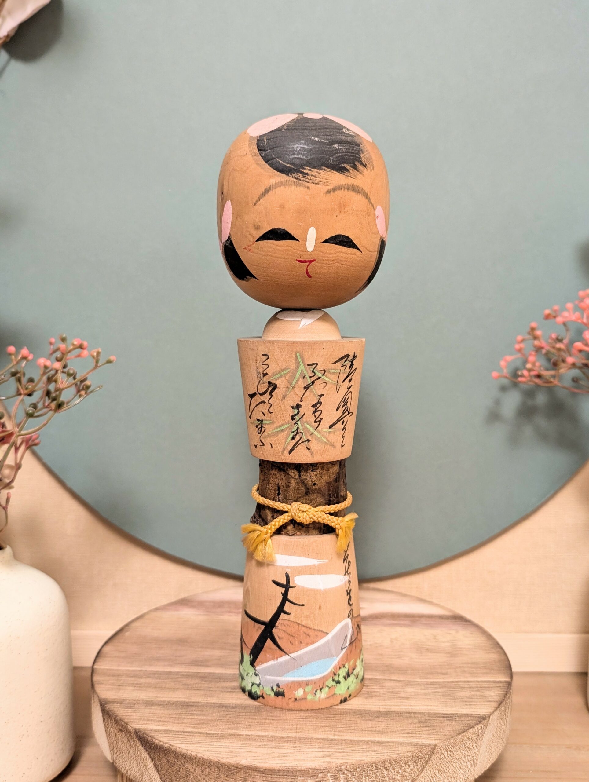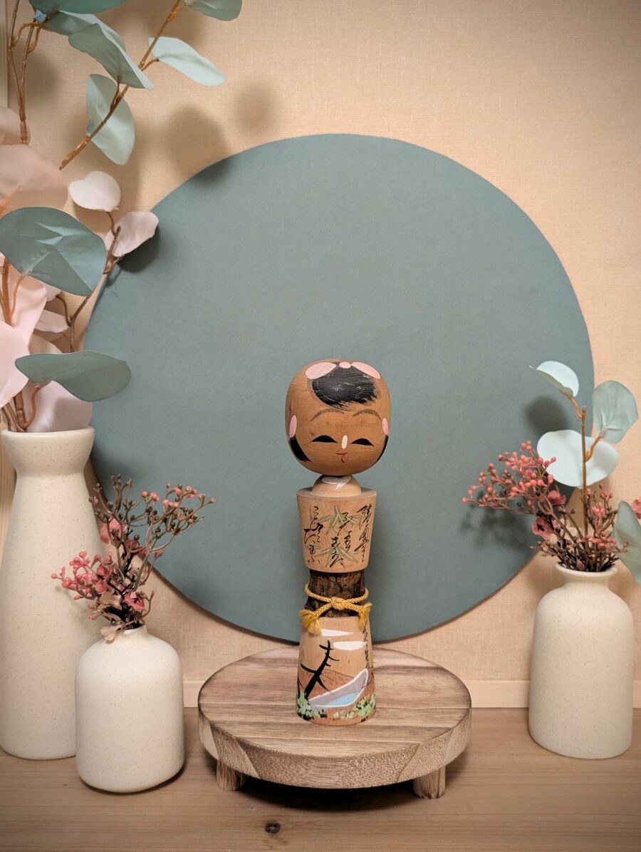 🔹La Kokeshi est ornée d’un paysage de Lac, et des inscriptions qui sont probablement un Tanka japonais.