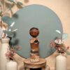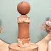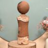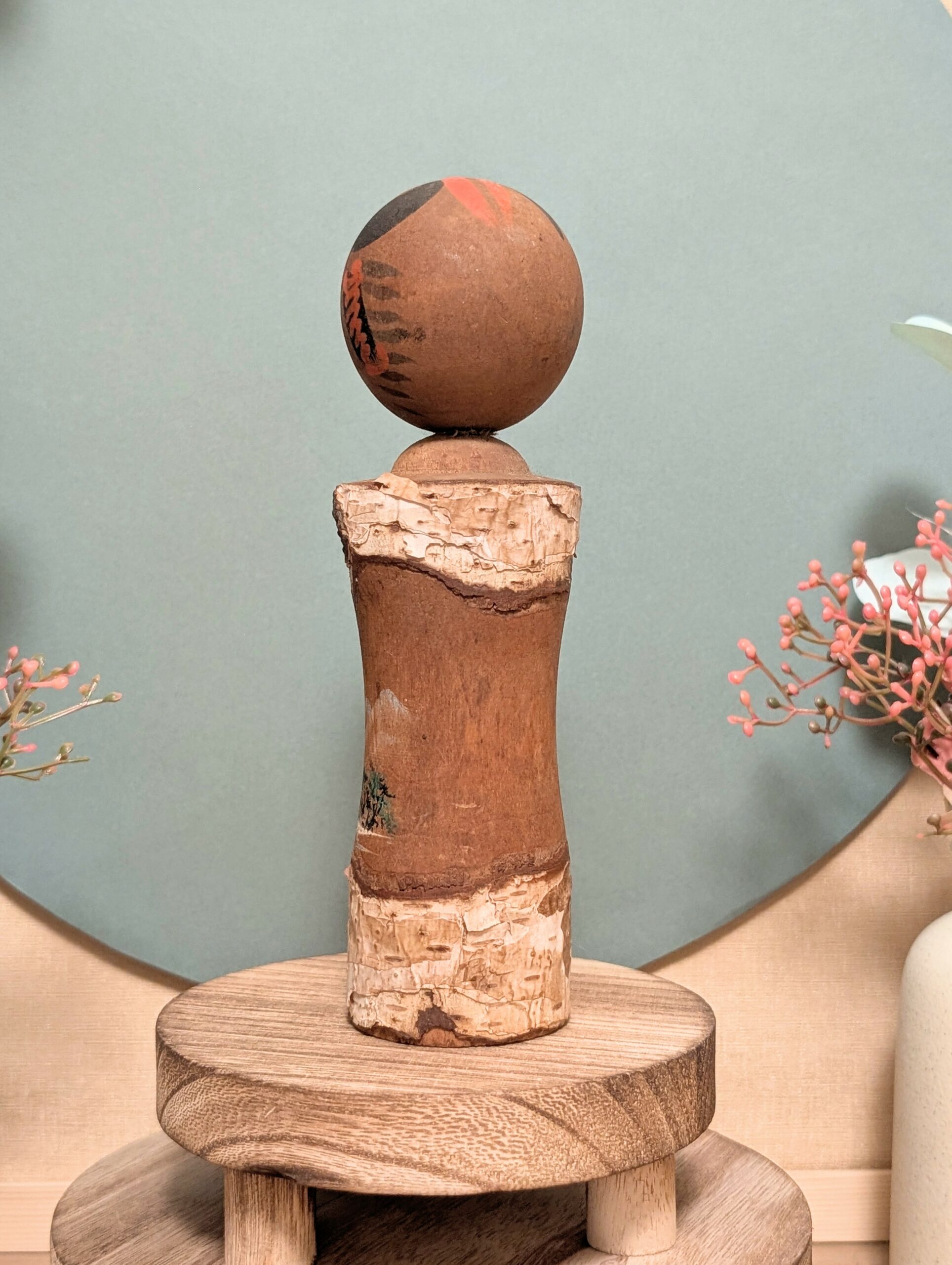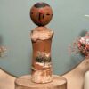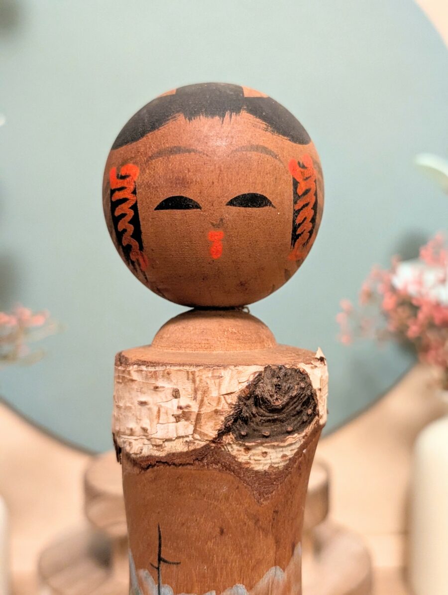 🔹 Sa tête, en bois tourné, présente un visage stylisé au trait noir et des motifs vifs traditionnels rappelant les coiffures des Kokeshi du Tōhoku.