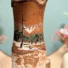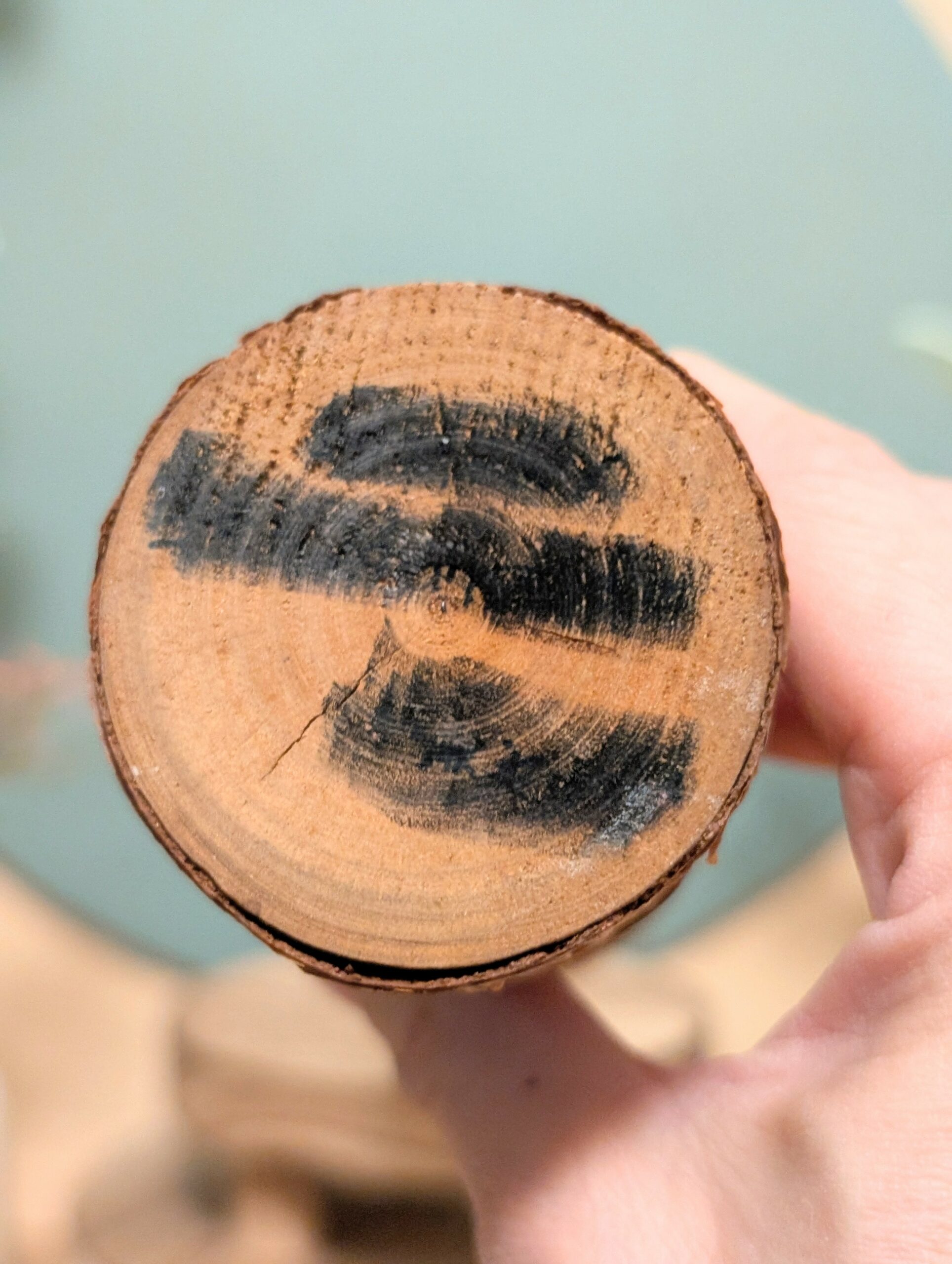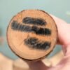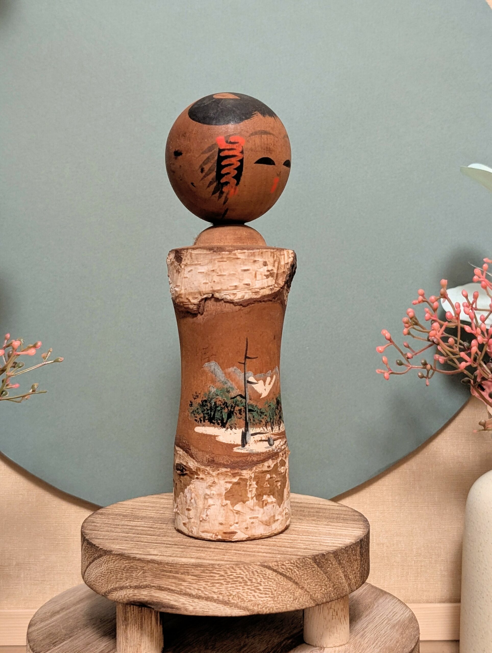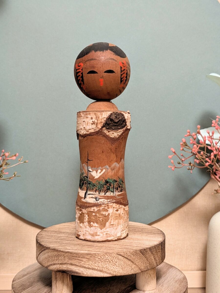 Charmante Kokeshi japonaise artisanale, réalisée à partir d’un morceau de tronc d’arbre (boulot) conservant son écorce, décoré d’un paysage de montagne et de pins peint à la main.