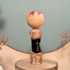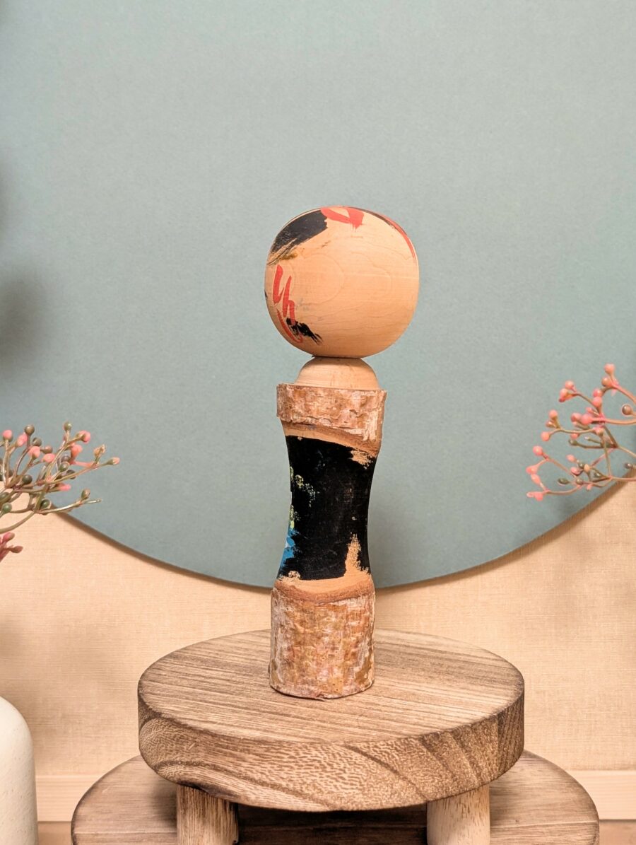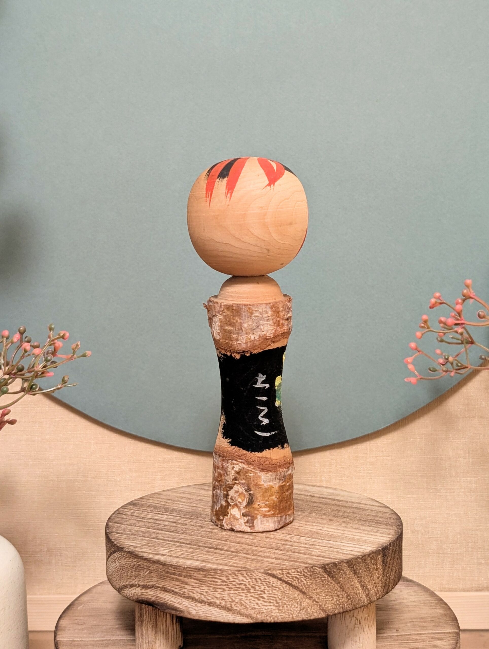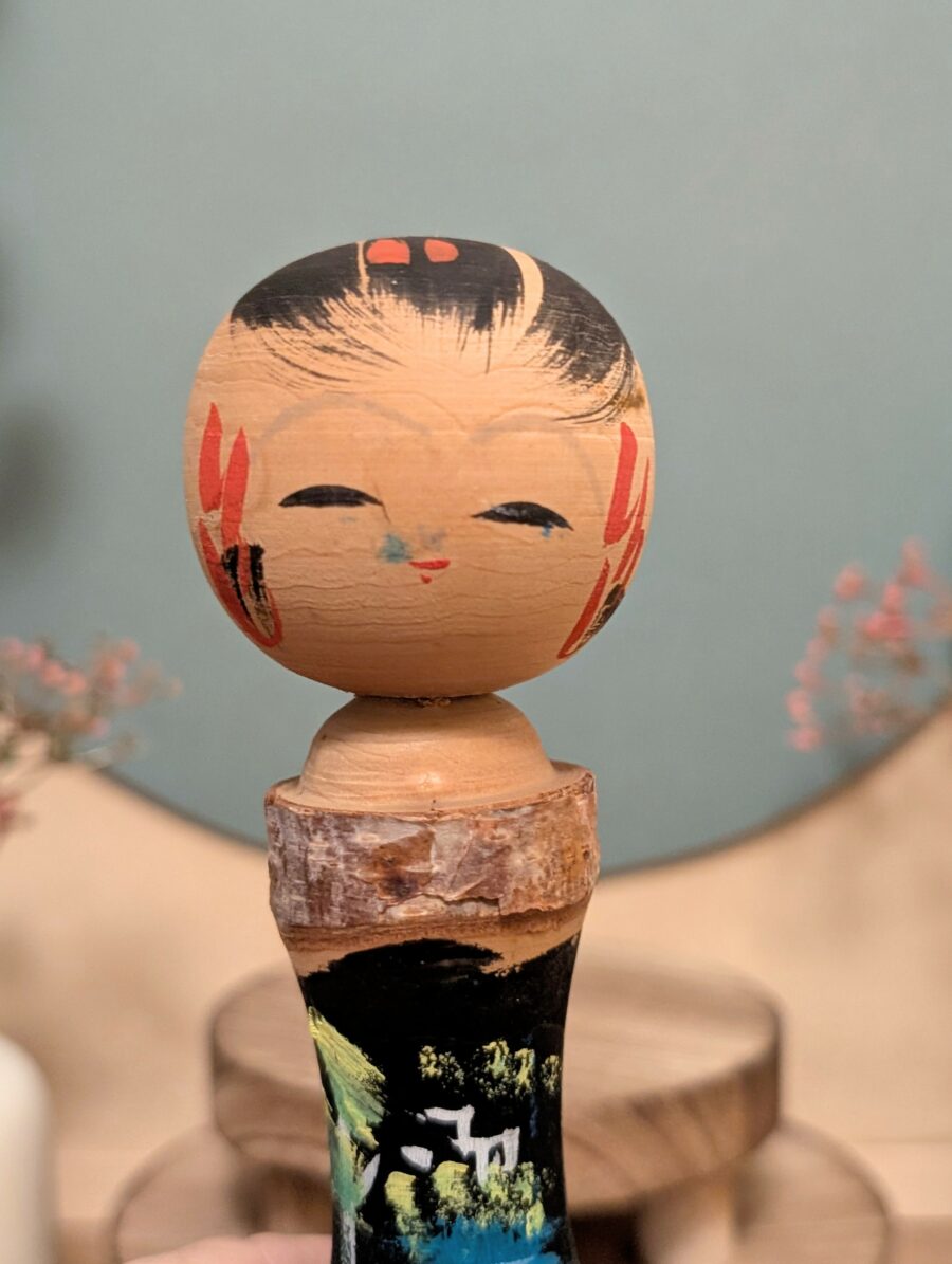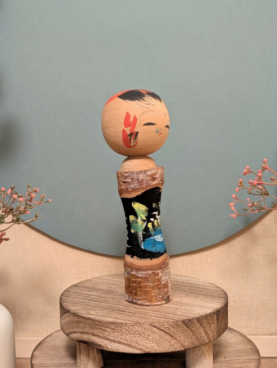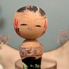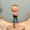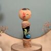 Charmante Kokeshi japonaise de type Omiyage, reconnaissable à son style plus libre et décoratif que les Kokeshi traditionnelles.