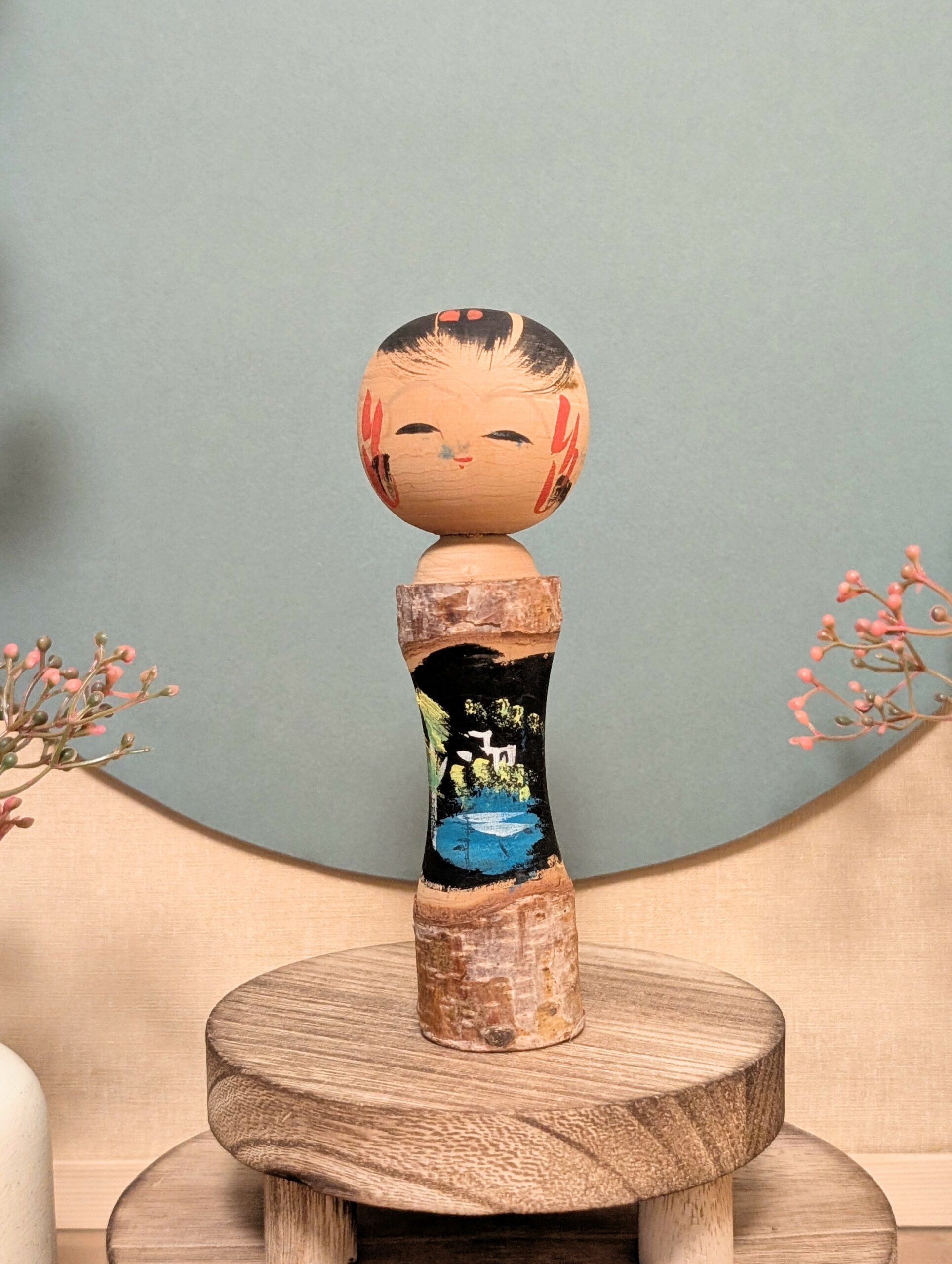 Charmante Kokeshi japonaise de type Omiyage, reconnaissable à son style plus libre et décoratif que les Kokeshi traditionnelles.