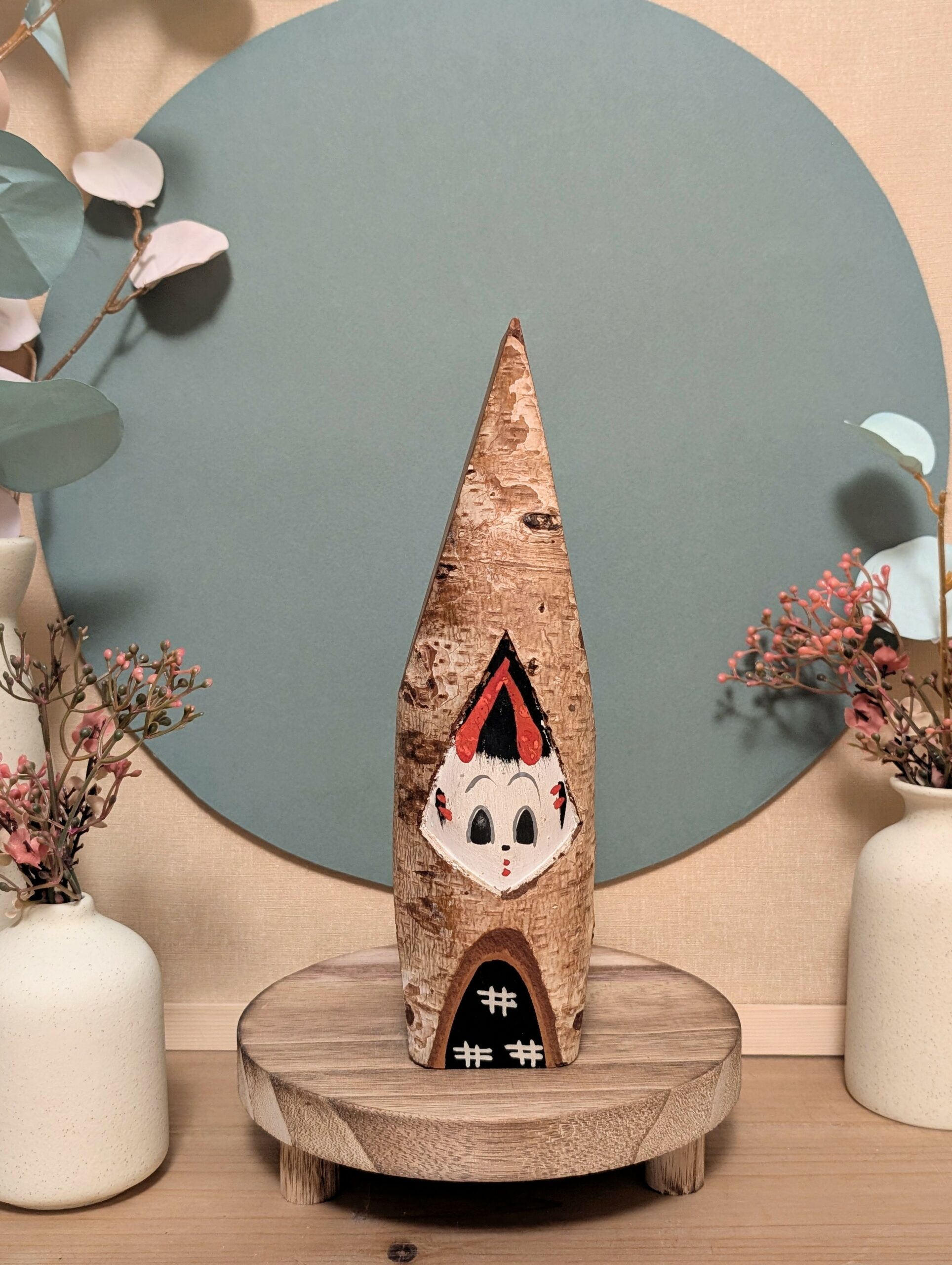 🔹 Fabriquée en bois de bouleau, elle arbore une silhouette conique qui rappelle un bonnet hivernal, tandis que son visage enfantin exprime la pureté et l’innocence associées aux paysages enneigés du nord du Japon.