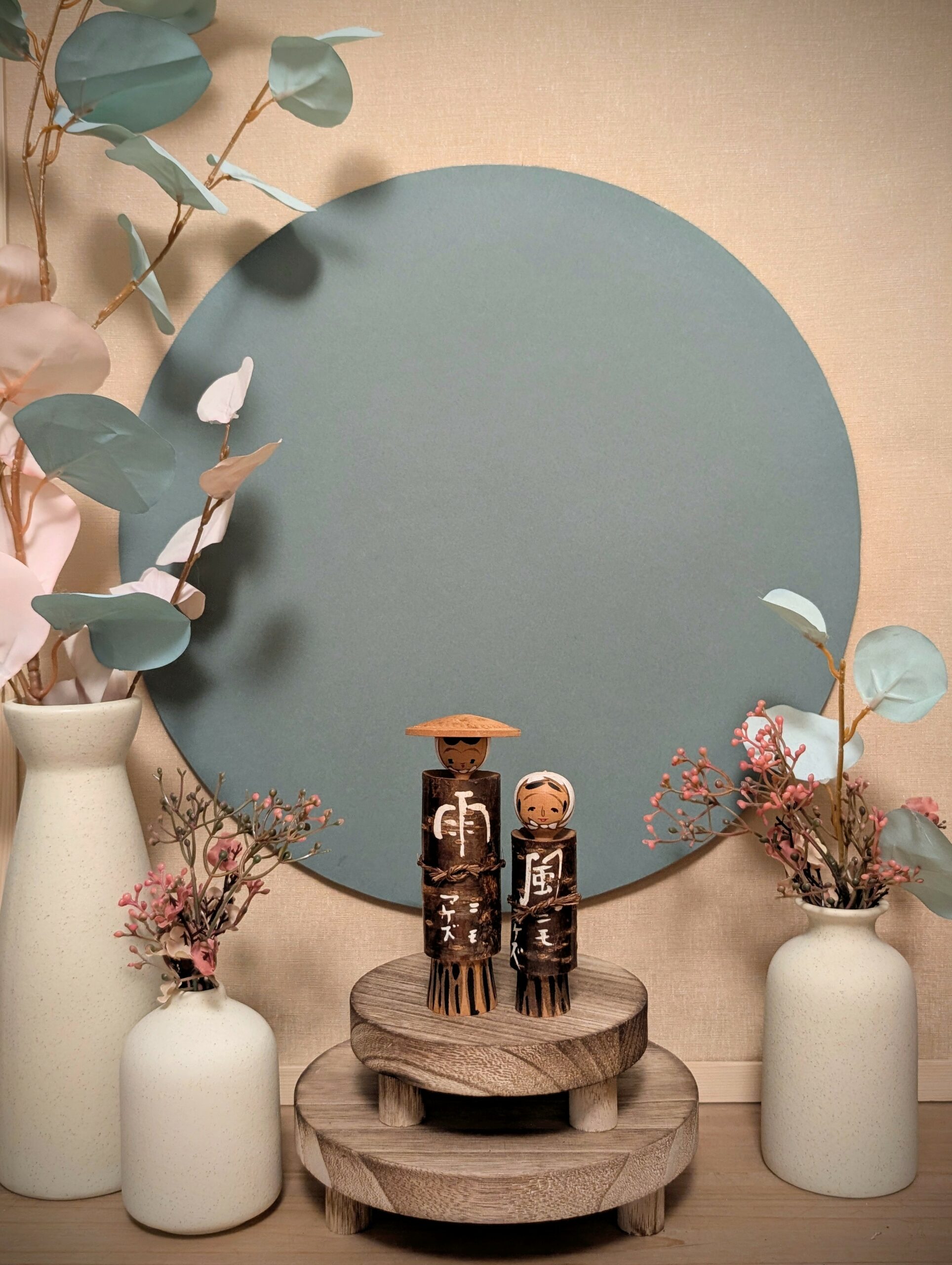 🔹 Chaque figurine est entourée d’une fine cordelette naturelle qui vient souligner la taille de chaque Kokeshi.
