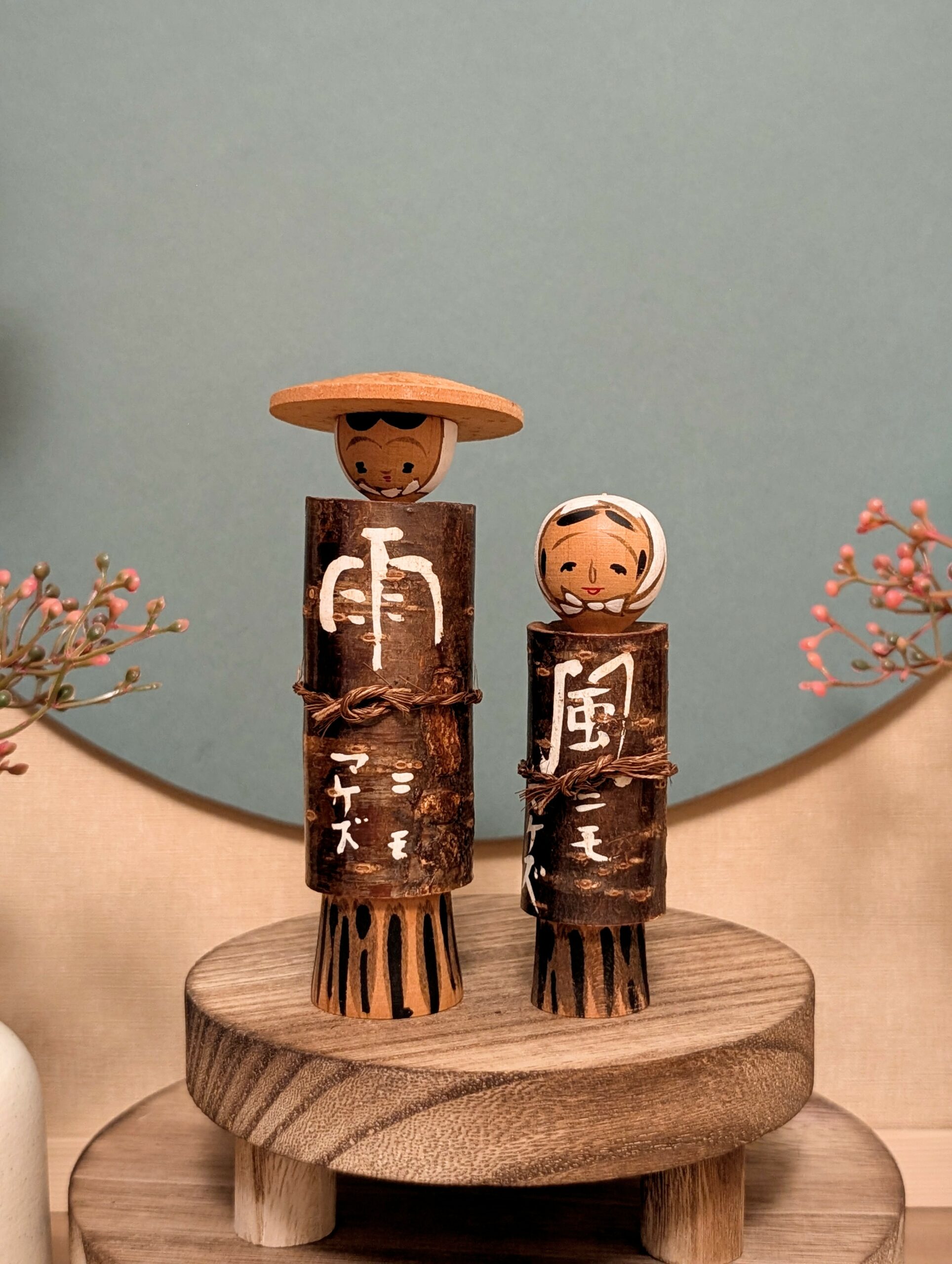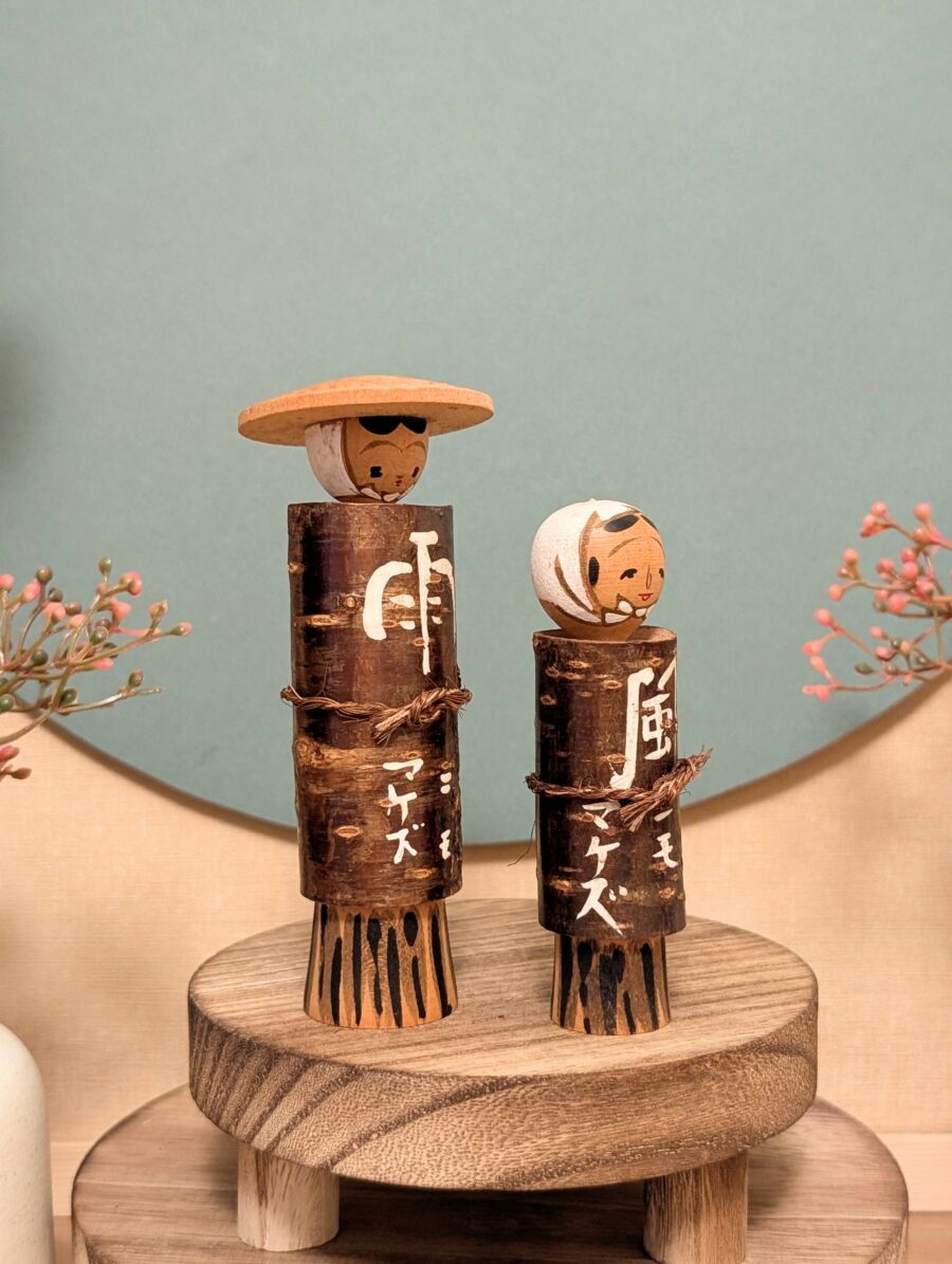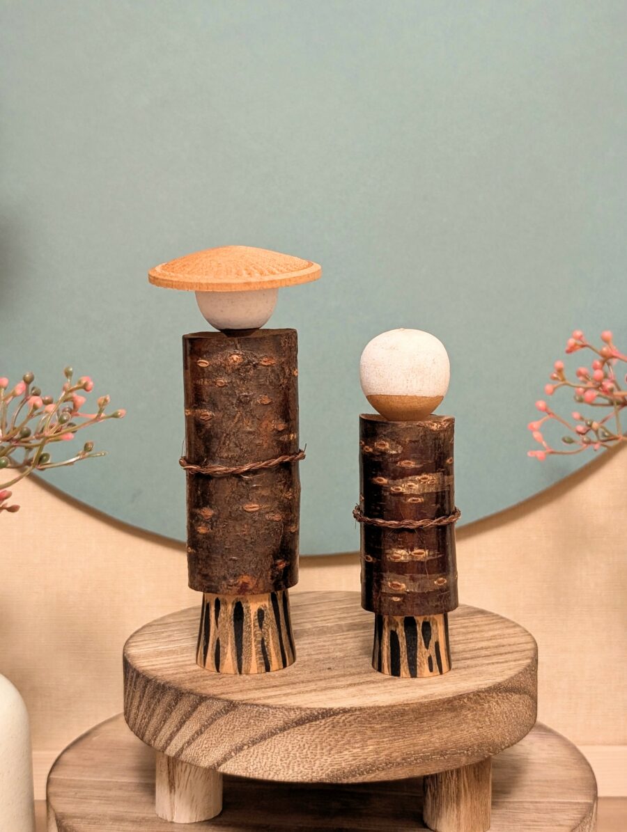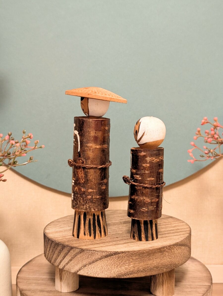 Découvrez ce charmant duo de Kokeshi Omiyage, sculptées à la main et habillées de leur écorce naturelle, qui viendra apporter chaleur et poésie à votre intérieur.