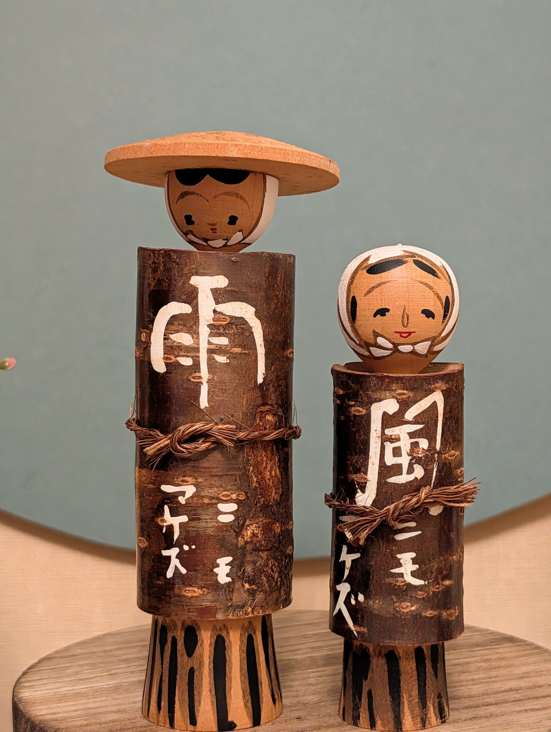 🔹 Sur le buste de la première, on distingue le caractère 雨 suivi de la locution ニモマケズ, tandis que la seconde porte 風ニモマケズ–, des vers issus du célèbre poème de Kenji MIYAZAWA, « Ni battu par la pluie, ni vaincu par le vent ». Ces inscriptions, appliquées à la peinture blanche, soulignent la résilience et l’optimisme face aux aléas de la vie.
