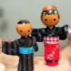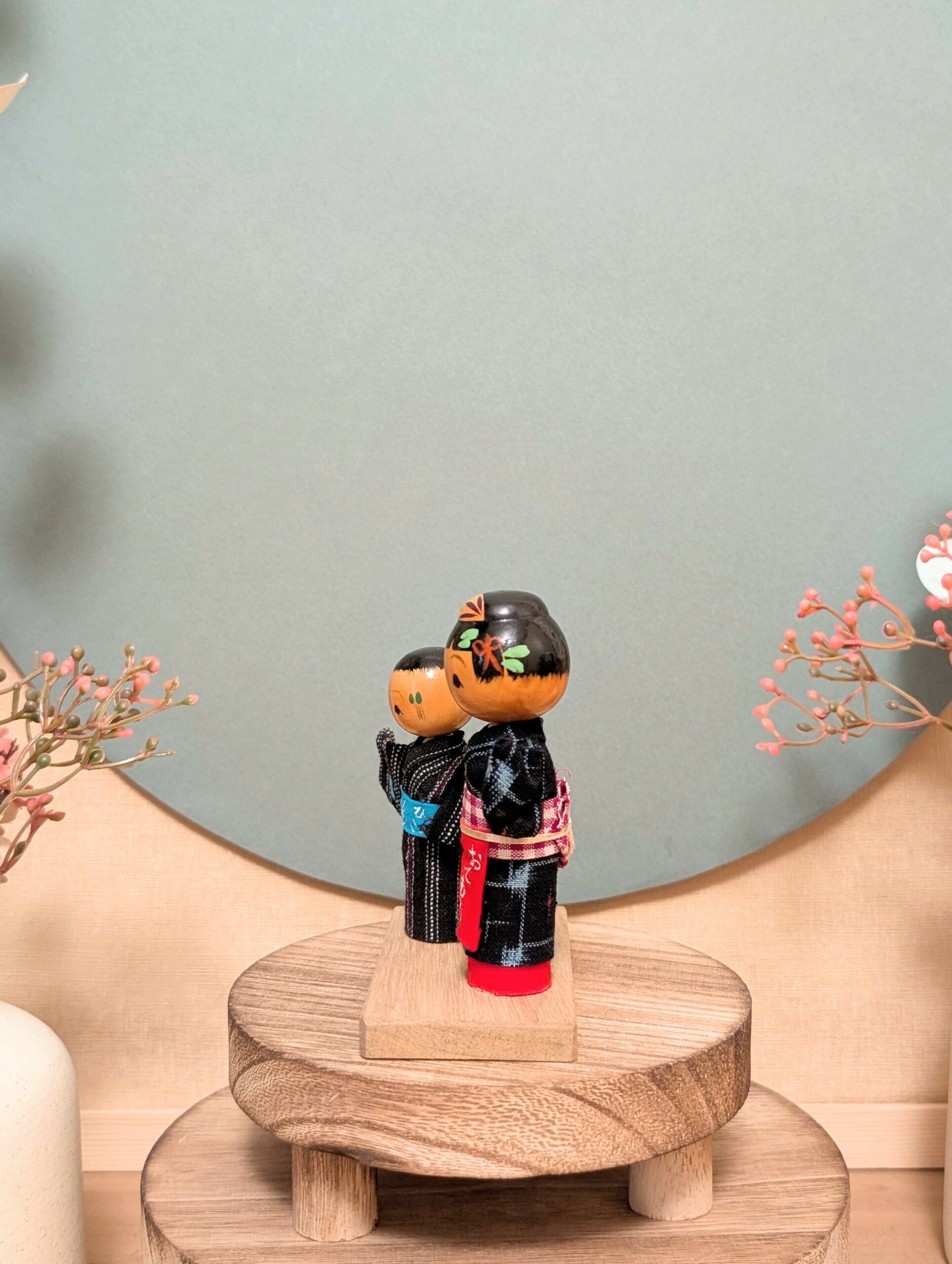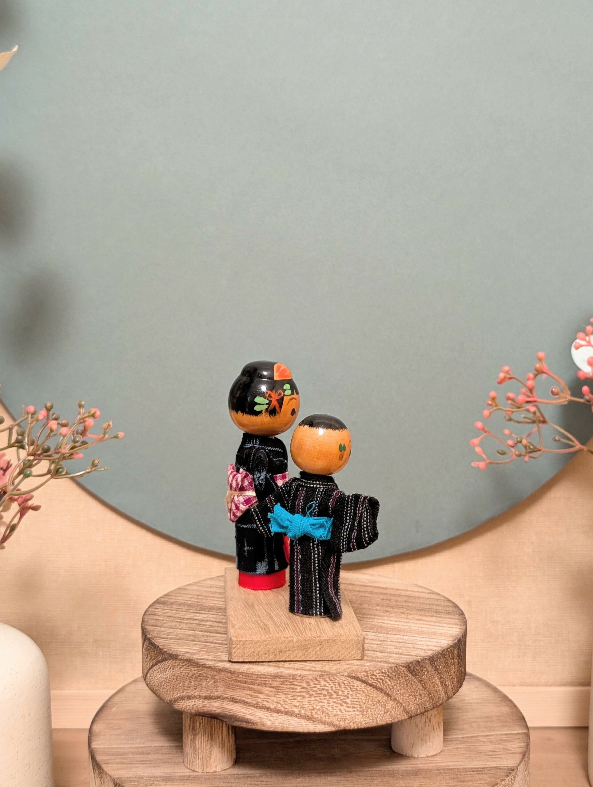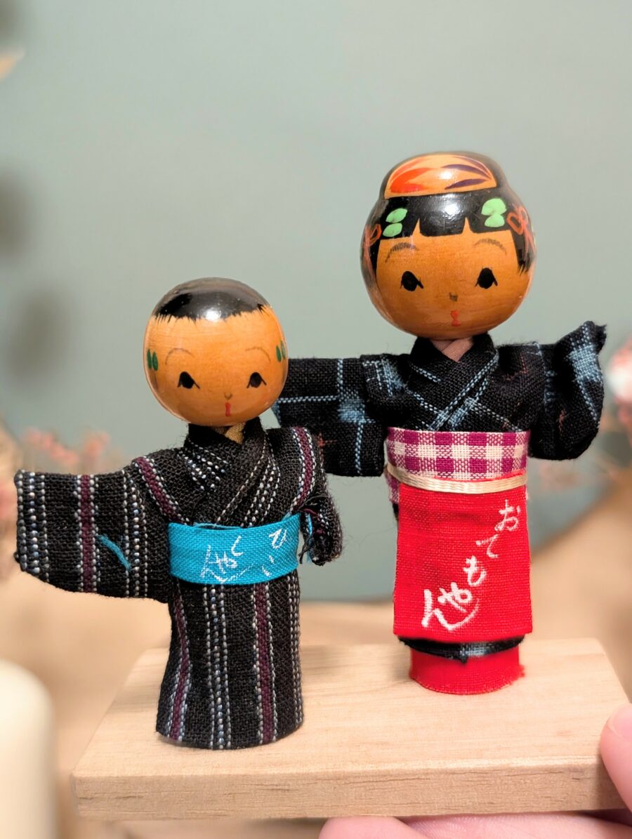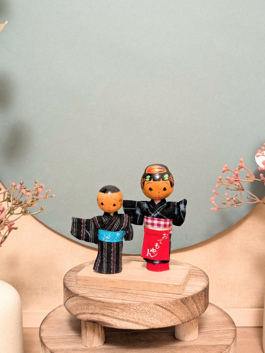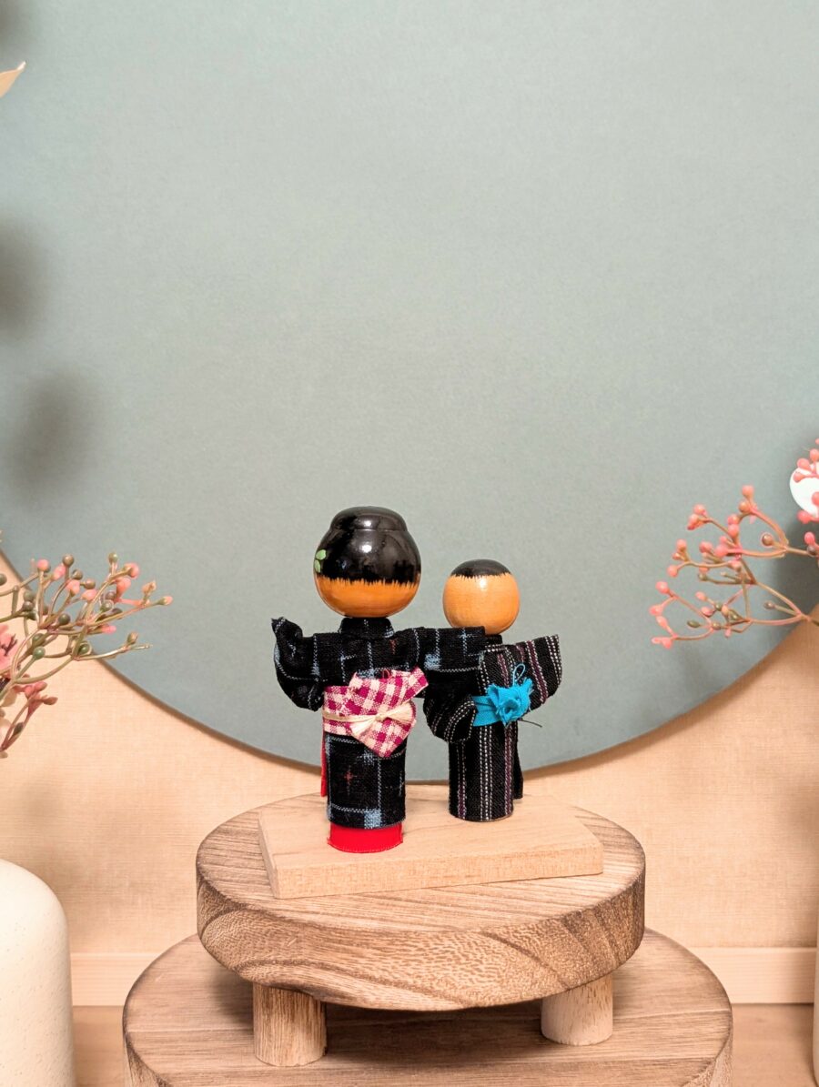 Voici une jolie composition de Kokeshi Omiyage (souvenirs artisanaux japonais), représentant un couple vêtu de yukata traditionnels en tissu.