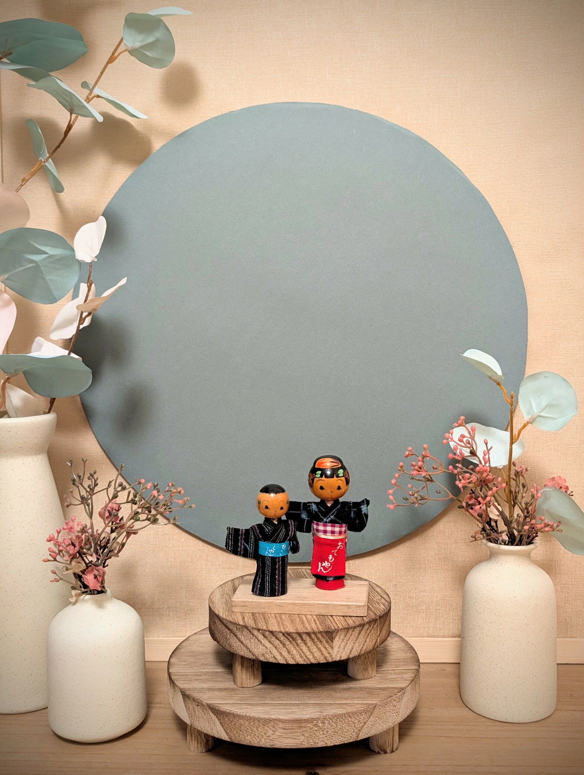 Voici une jolie composition de Kokeshi Omiyage (souvenirs artisanaux japonais), représentant un couple vêtu de yukata traditionnels en tissu.