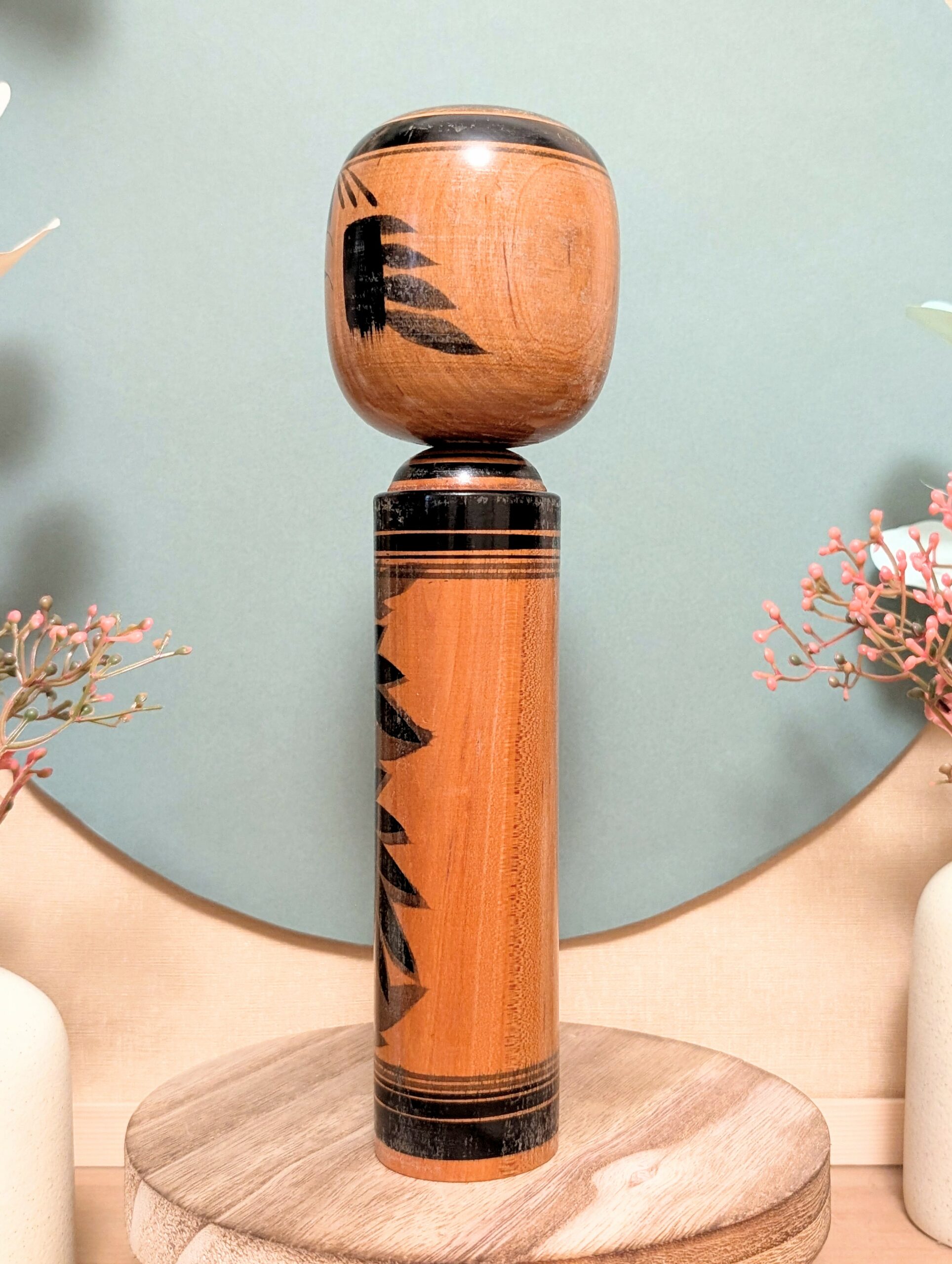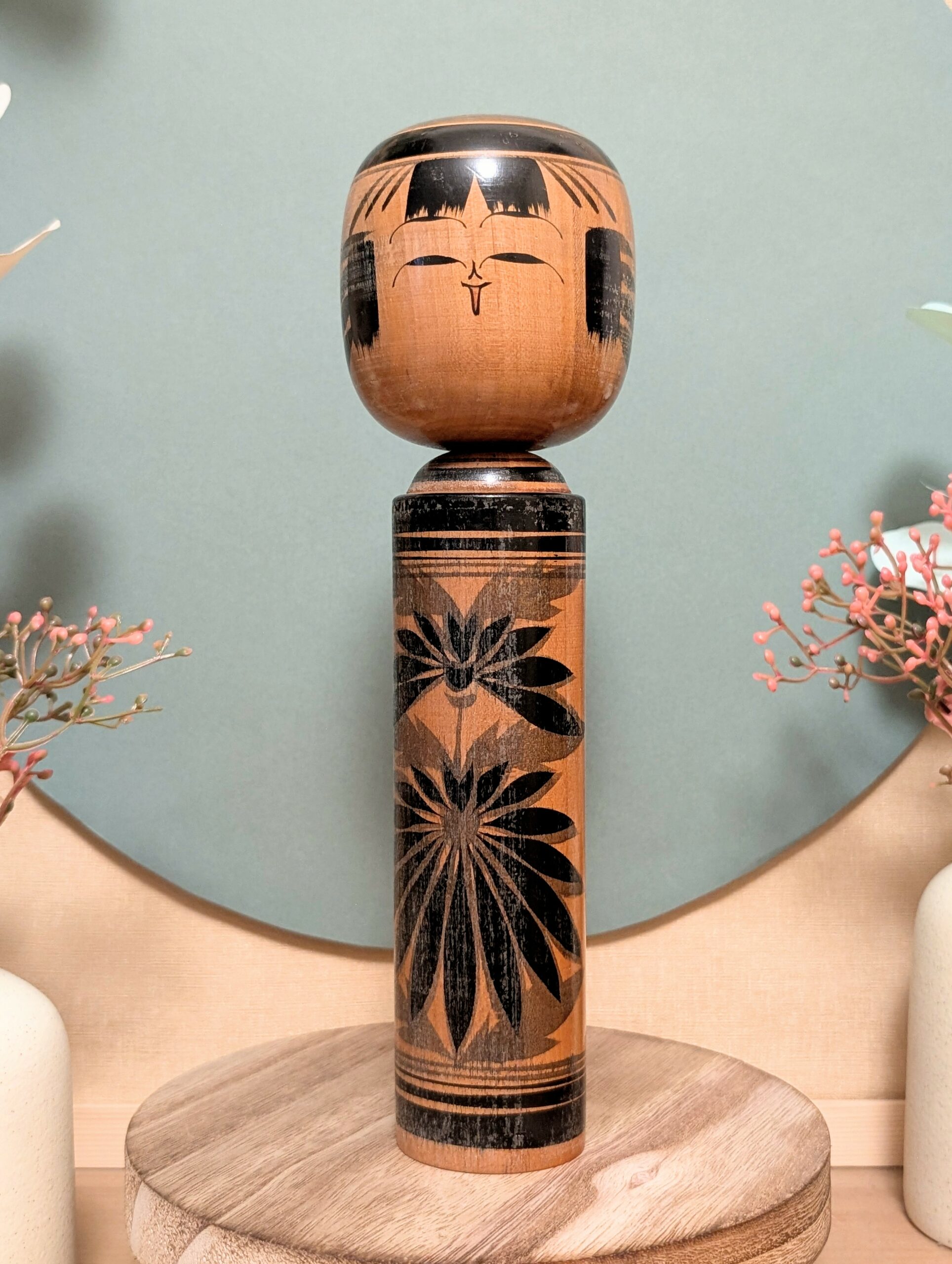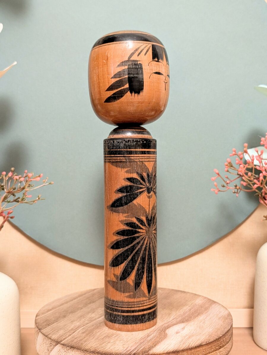 Cette élégante Kokeshi Shingata, signée mais d’auteur non identifié, séduit par son graphisme audacieux et sa présence sobre et intemporelle.
