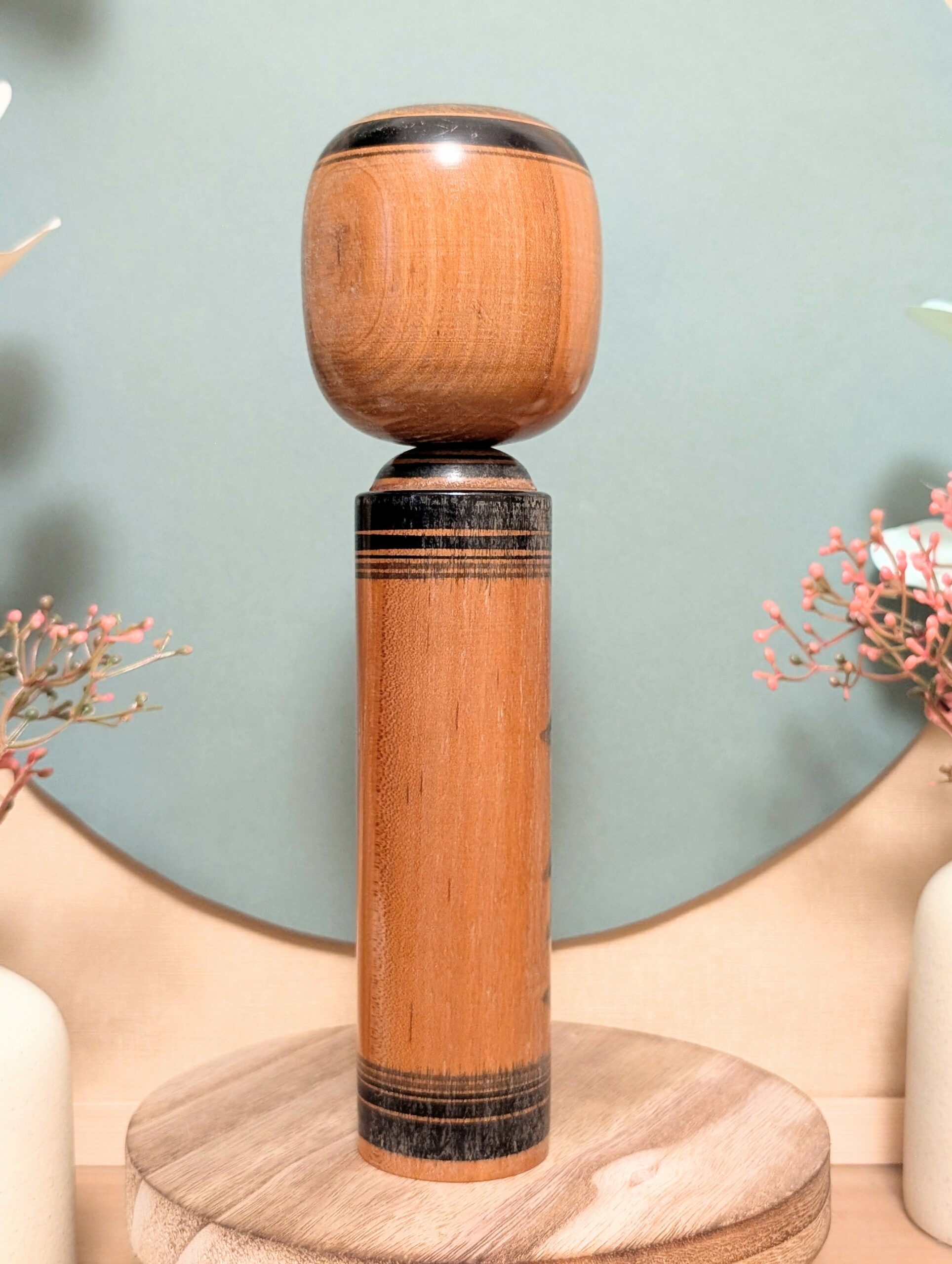 Une Kokeshi d’une grande élégance graphique, entre sculpture et design, où la simplicité du noir révèle toute la chaleur du bois et la finesse du trait artisanal.