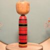 🔹 Son design minimaliste met en valeur un visage doux et épuré, aux yeux délicatement tracés, tandis que le corps, peint dans un rouge profond souligné de bandes noires avec des motifs de fleurs stylisées gravée dans le bois, offre un contraste graphique typique des créations d’après-guerre.