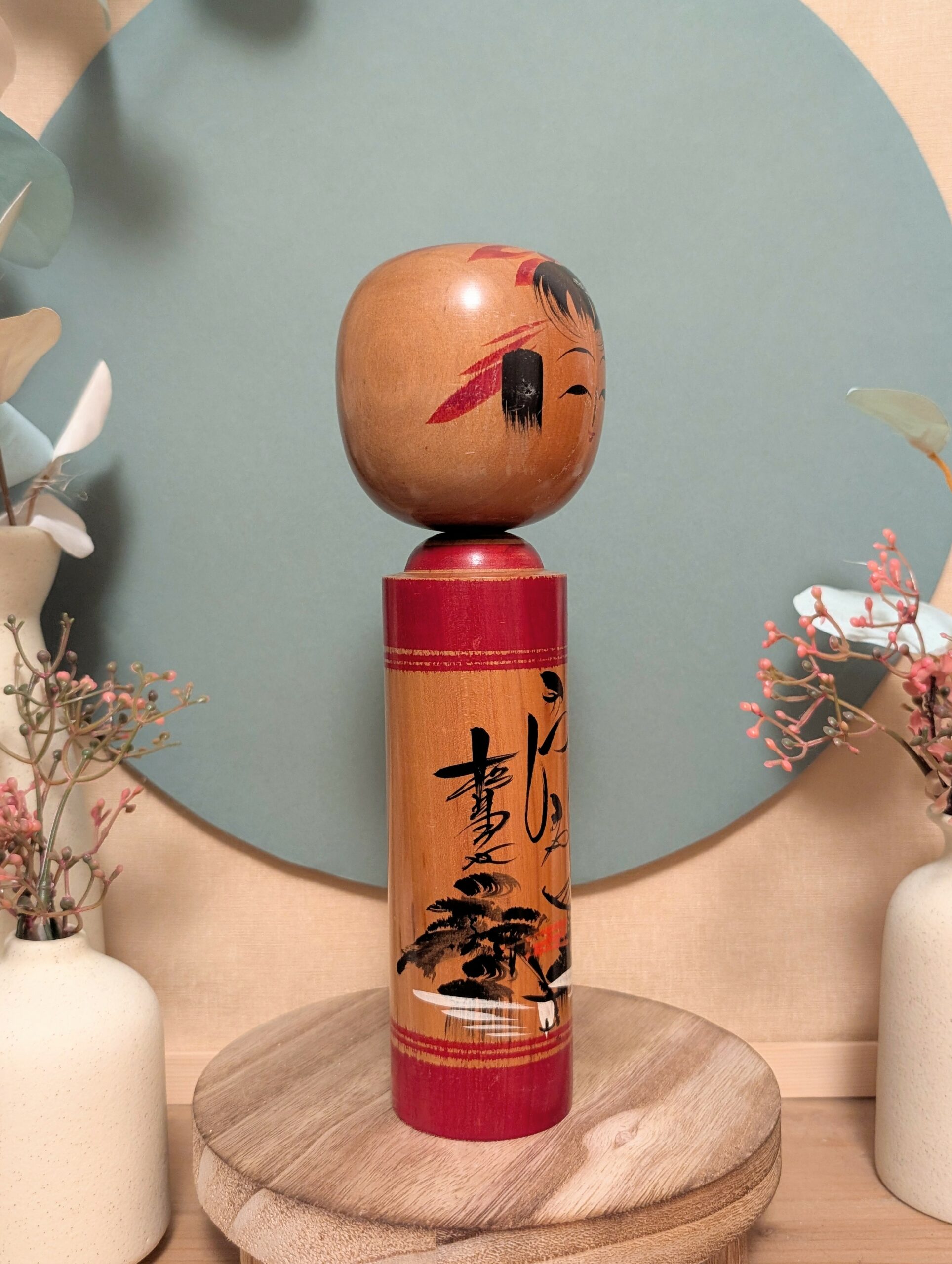 Cette Kokeshi Shingata japonaise séduit par son équilibre entre tradition et expression picturale.