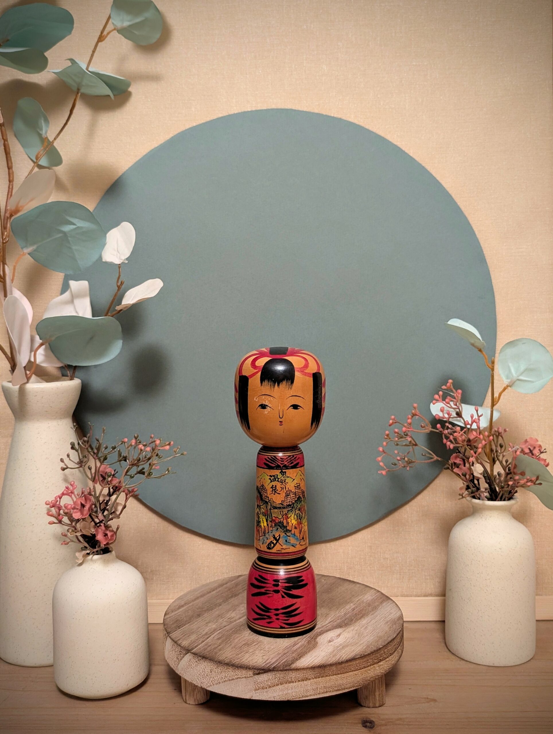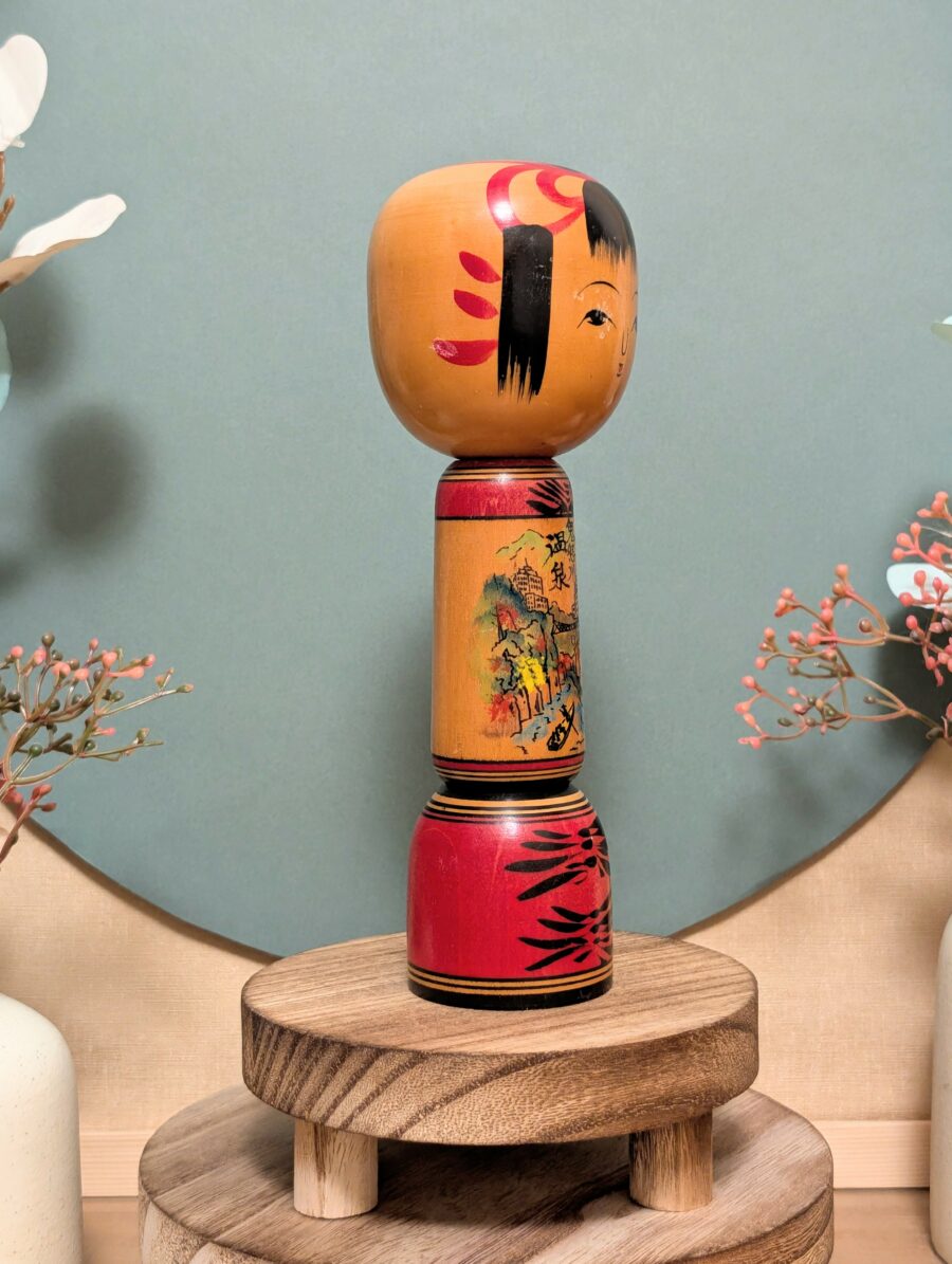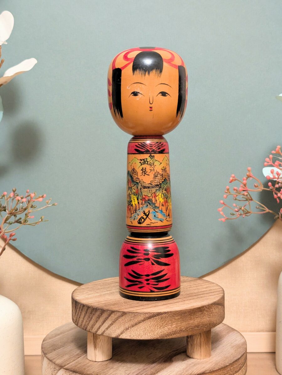Un bel exemple de kokeshi-souvenir des années 1960-70, à la fois décorative et témoin d’une époque où ces poupées étaient offertes comme mémoire de voyage.