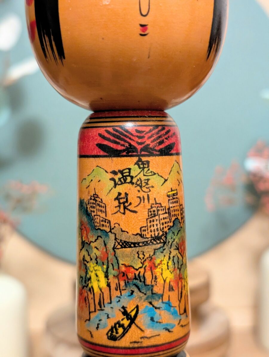 Magnifique Kokeshi Shingata décorée d’un magnifique paysage représentant les gorges de Kinugawa, une station thermale réputée pour ses sources chaudes et ses couleurs flamboyantes d’automne.
