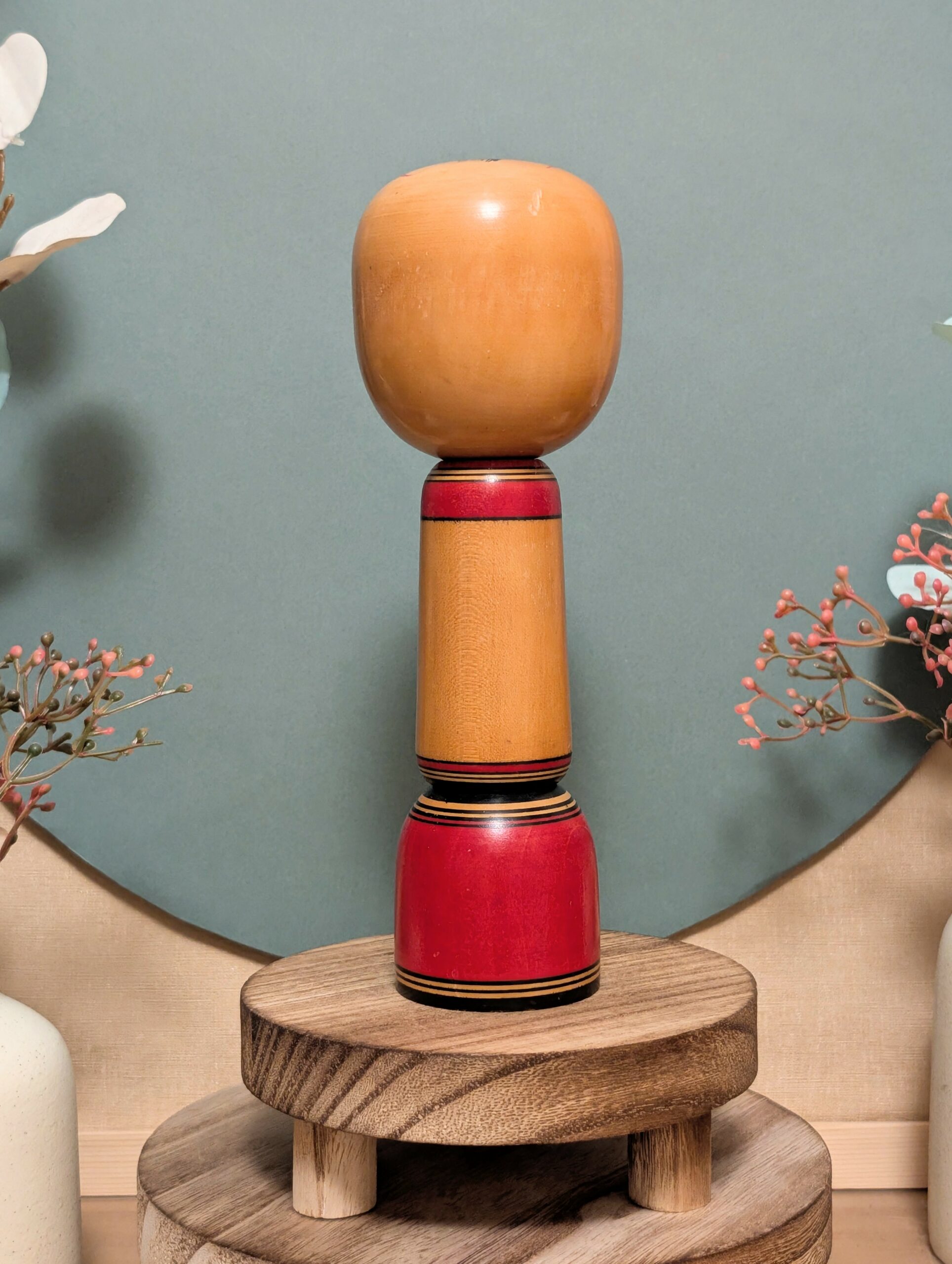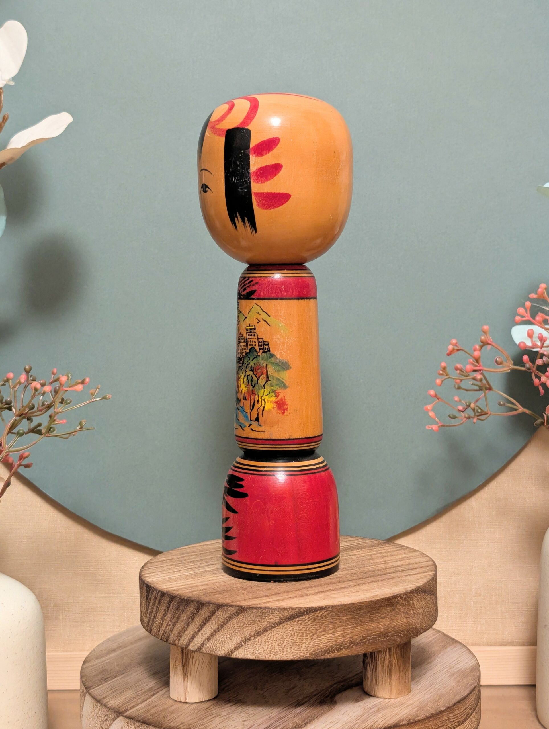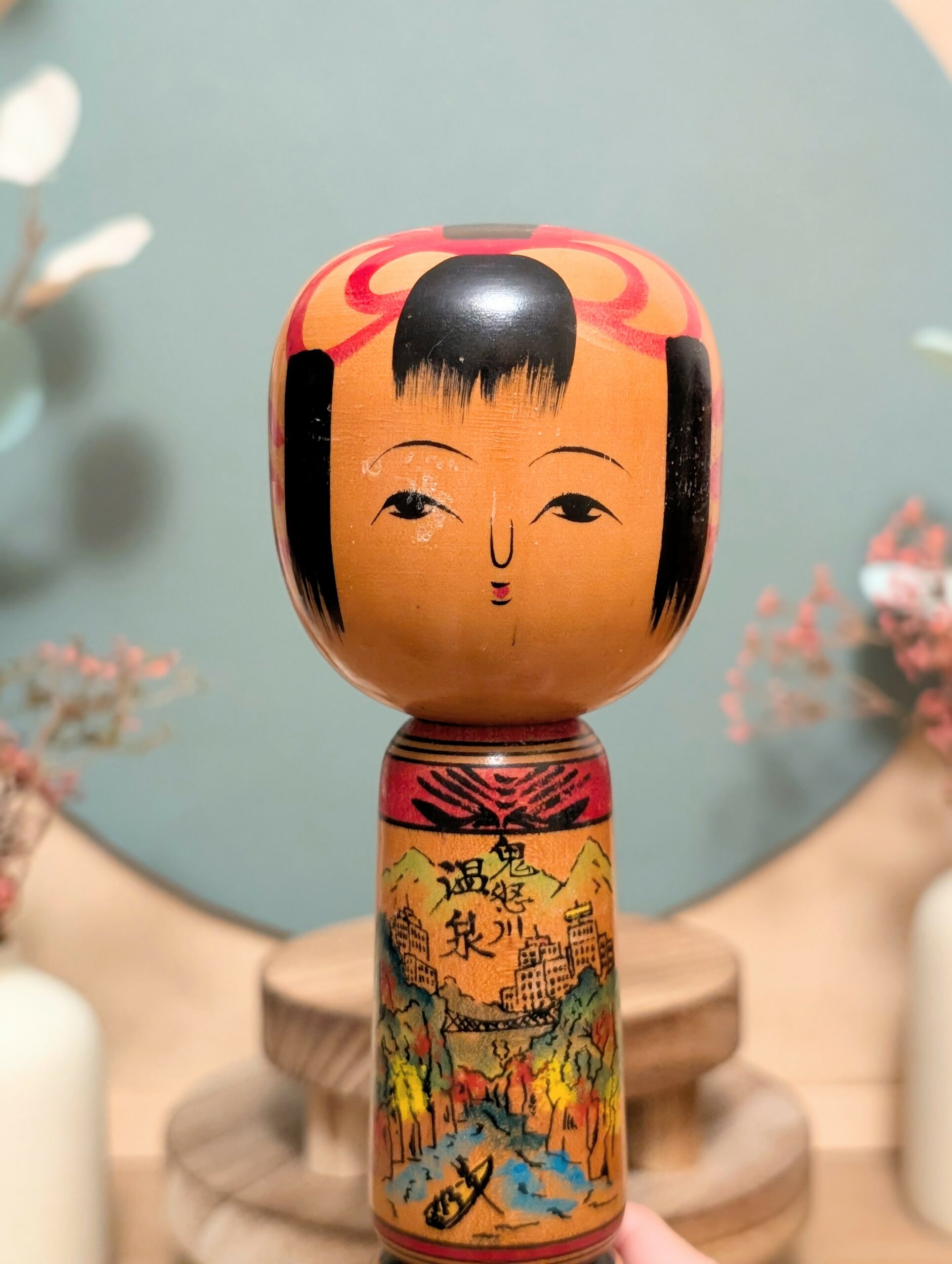 Un bel exemple de kokeshi-souvenir des années 1960-70, à la fois décorative et témoin d’une époque où ces poupées étaient offertes comme mémoire de voyage.