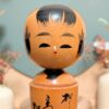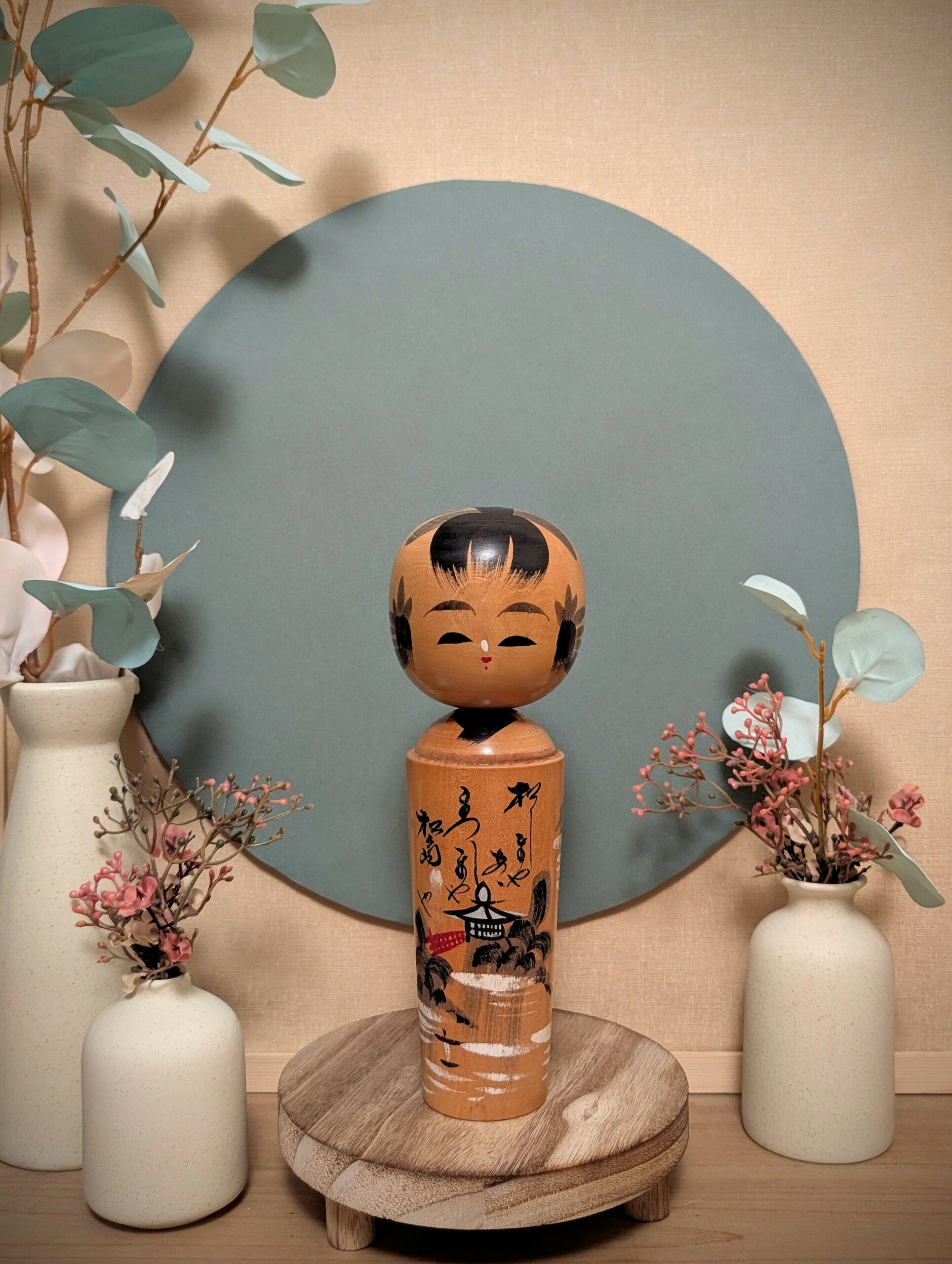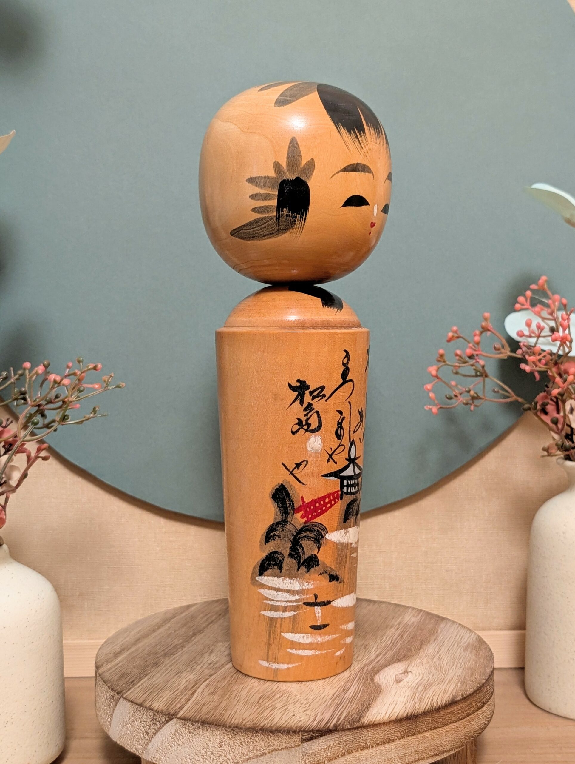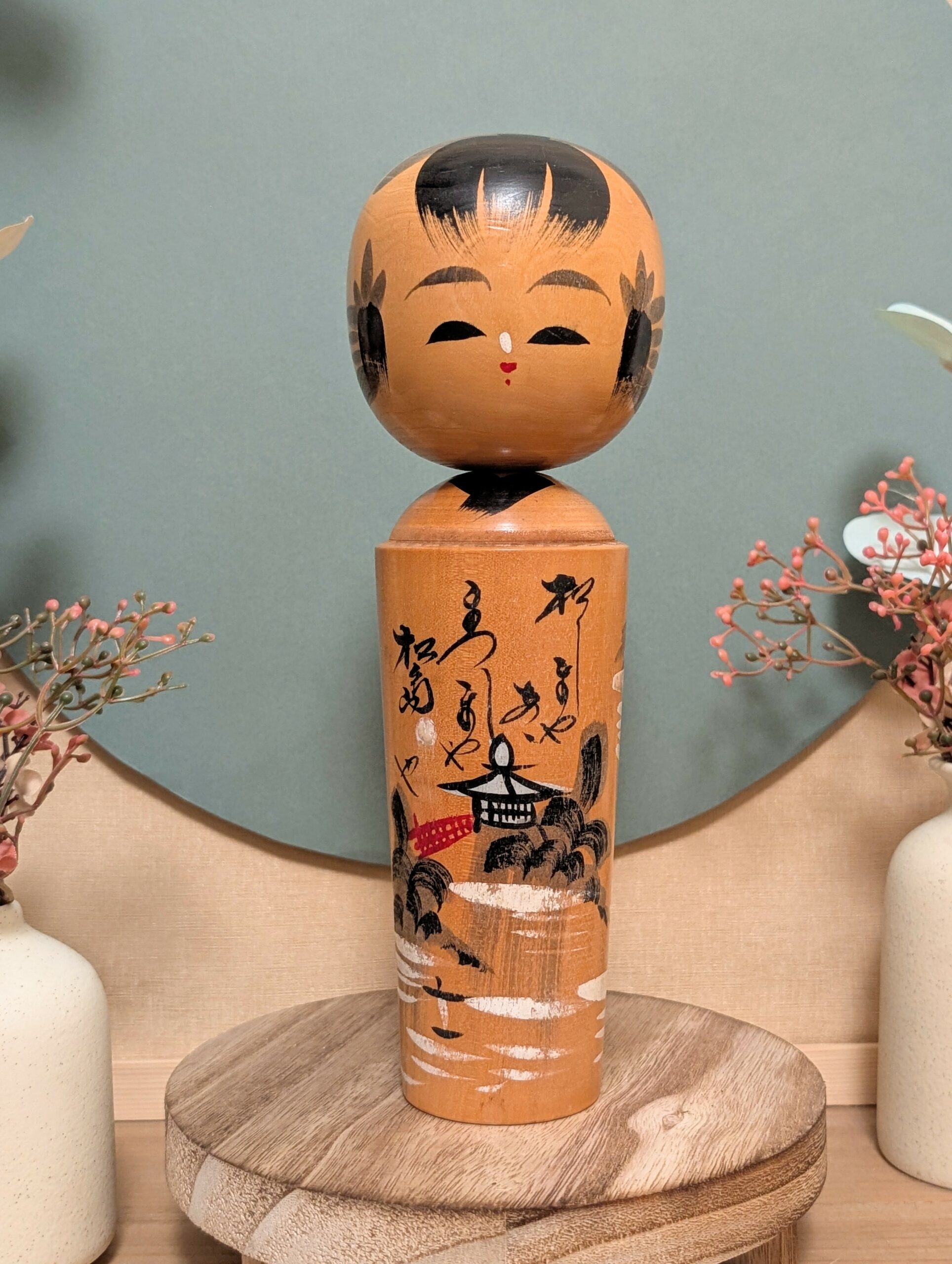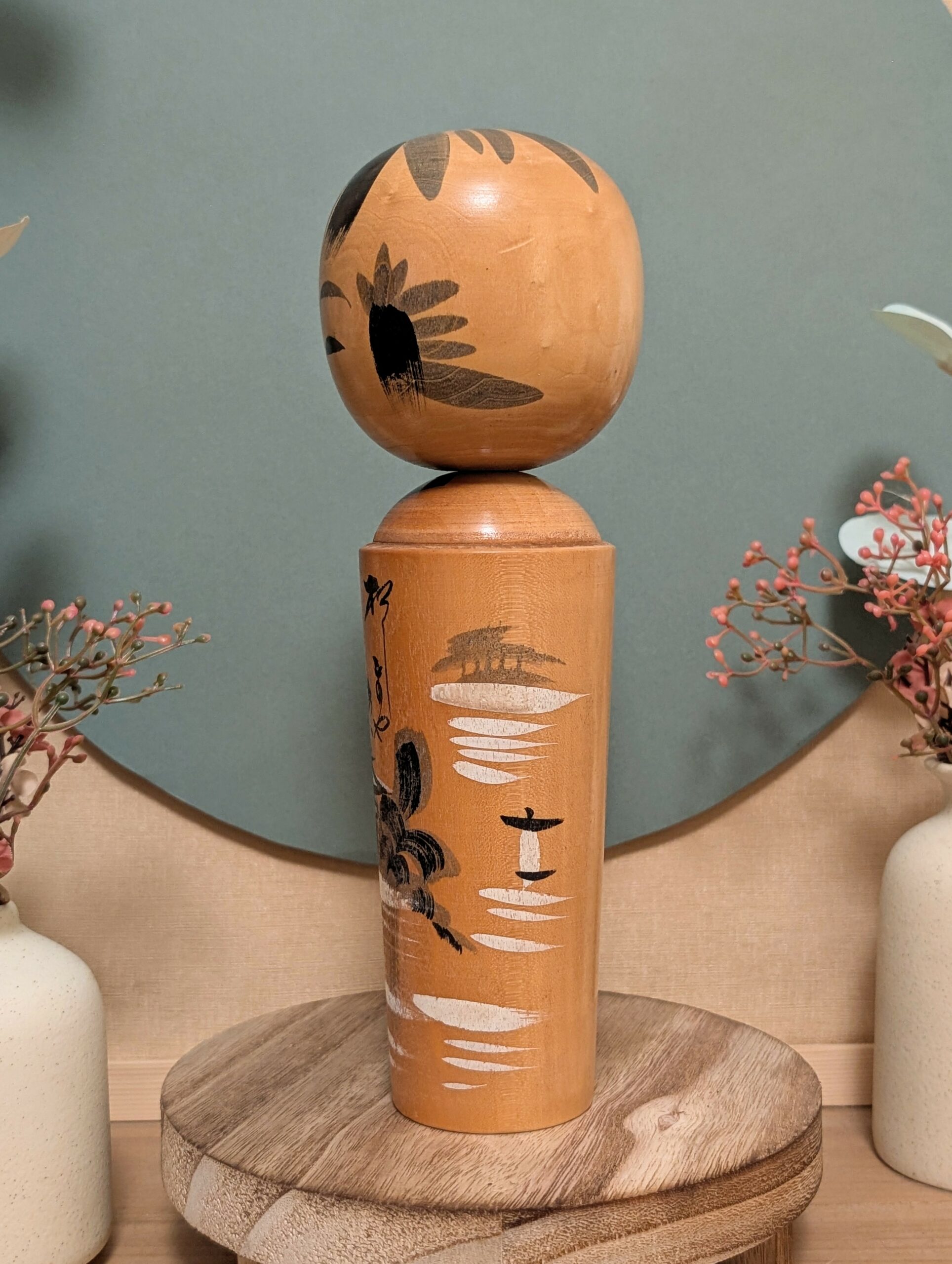 Un bel exemple de kokeshi d’artiste moderne, à la fois décorative et représentative des créations de l’ère Shōwa.