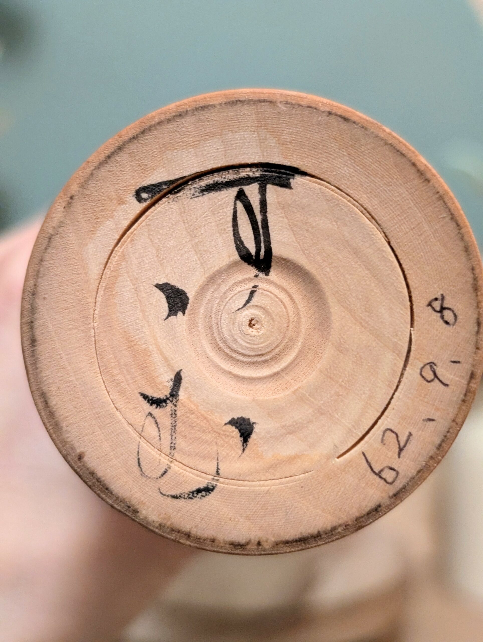 Très belle Kokeshi Shingata datant de l’année Shōwa 62 (1987), signée sous la base.