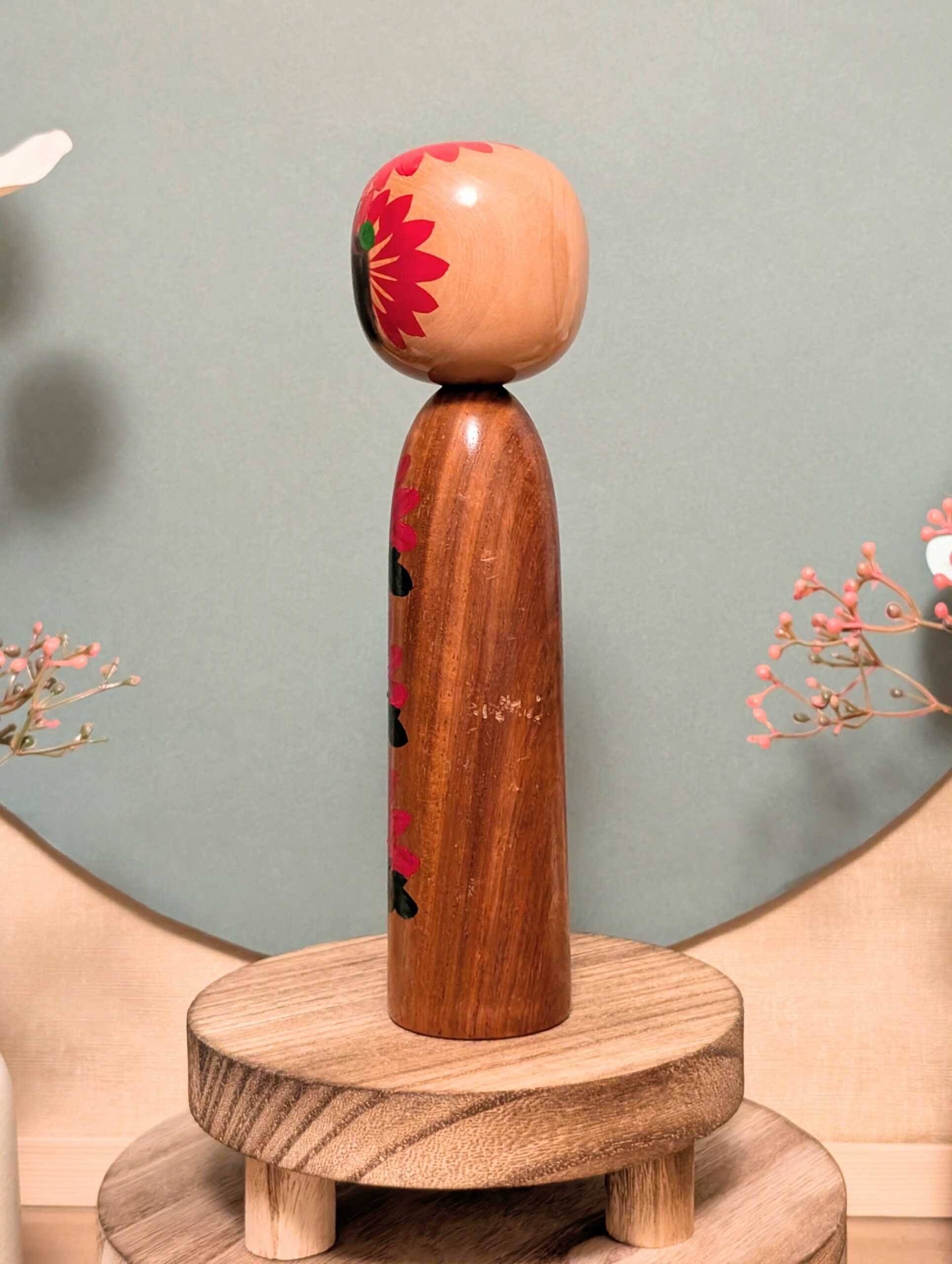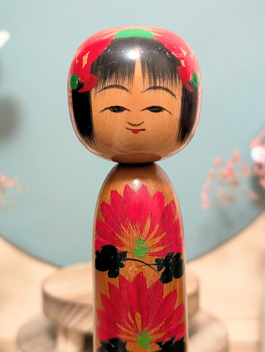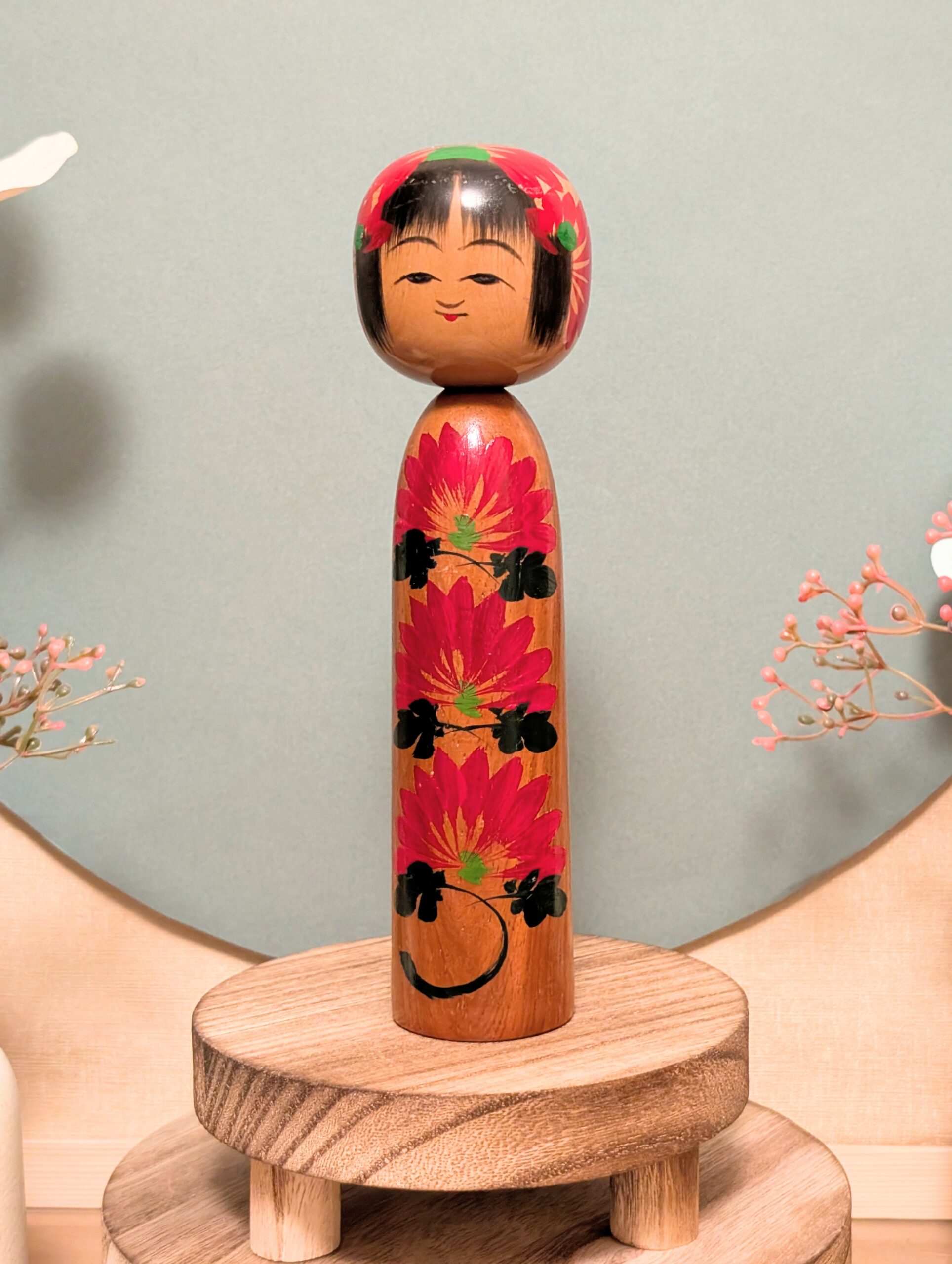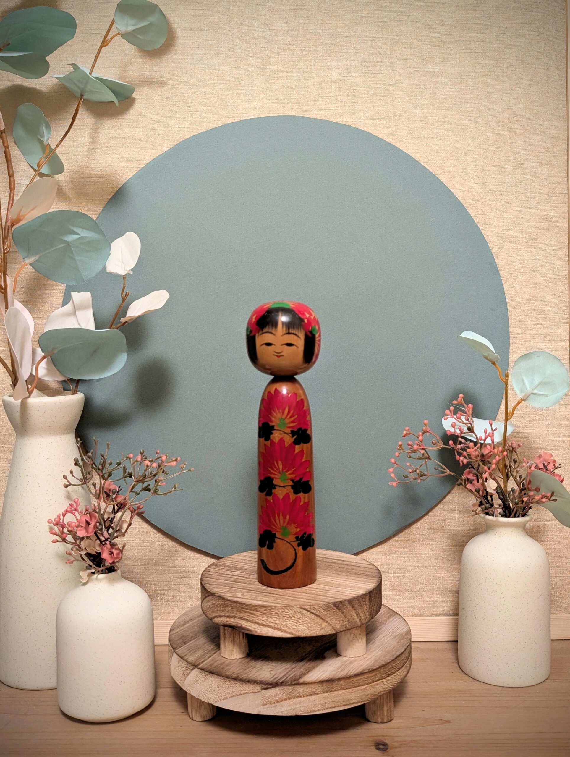 🔹Le corps est orné de grandes fleurs rouges éclatantes, probablement des chrysanthèmes, symboles de longévité et de renouveau au Japon. Ces fleurs, réalisées au pinceau contrastent joliment avec la teinte naturelle du bois , qui révèle un beau grain chaud.