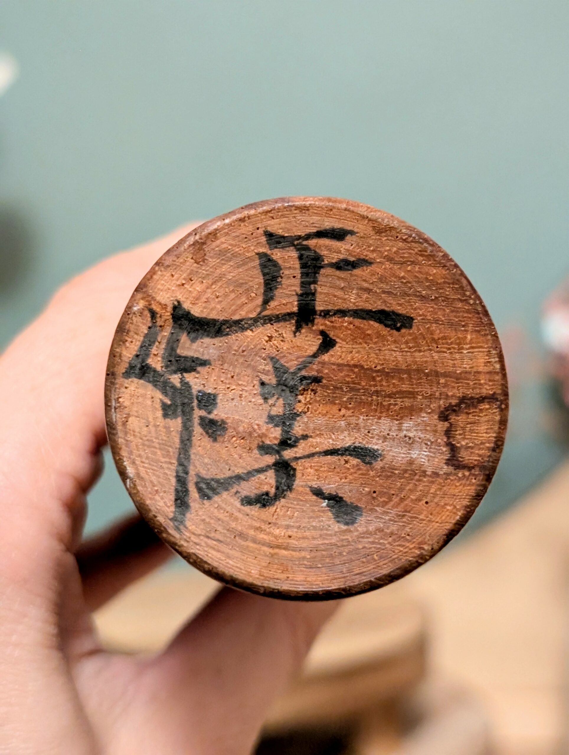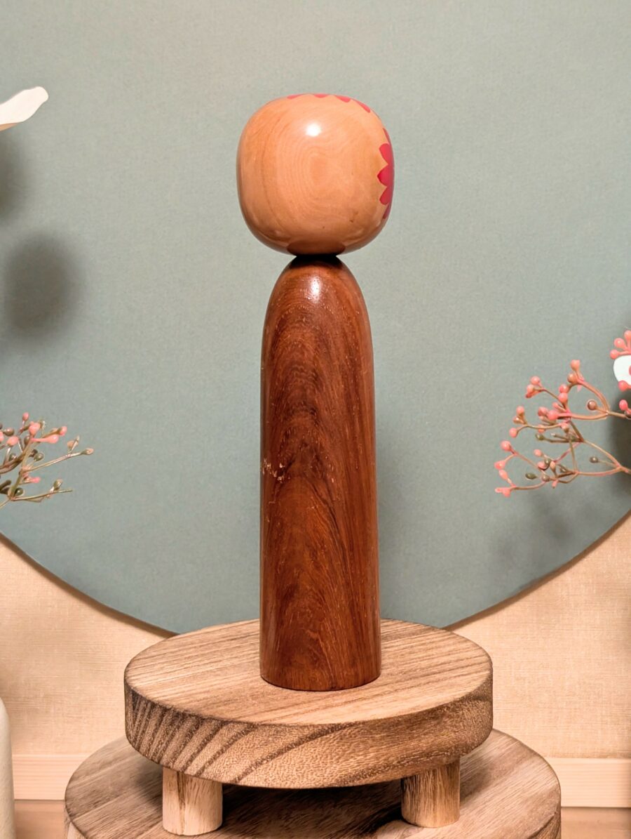 Cette Kokeshi est signée à la base, mais l’artiste n’a pas encore été identifié. Il s’agit d’une pièce artisanale d’après-guerre, réalisée sans doute entre les années 1960 et 1980, période où de nombreux créateurs ont modernisé les formes traditionnelles pour en faire de véritables objets décoratifs.