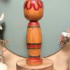 Cette élégante Kokeshi japonaise appartient au style Shingata, une forme modernisée des Kokeshi traditionnelles apparue au début du XXe siècle.