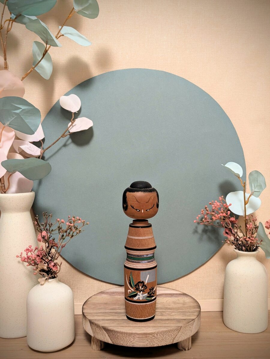 🔹 Le visage arbore une expression assez marquée : des sourcils noirs donnant un air concentré ou sévère. Des yeux obliques, peints également en noir, accentuant ce regard intense qui s’éloigne de la douceur habituelle des kokeshi traditionnelles. C’est un indice fort d’une approche plus « artistique » ou « fantaisiste ».