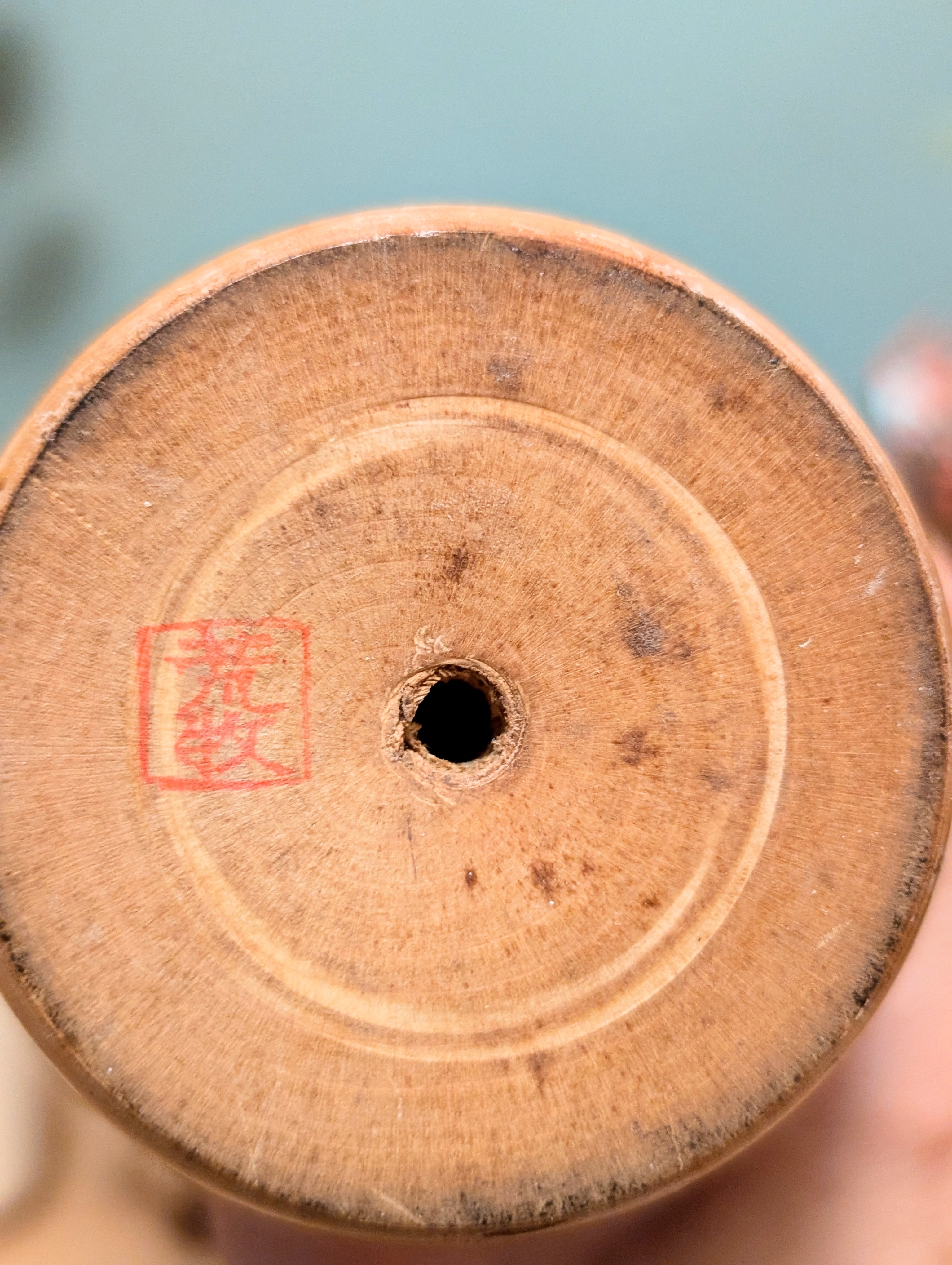 🔹 Sur son corps est peinte une scène rare et subtile : une femme vêtue d’un kimono noir à motifs floraux est représentée de profil ou de dos, plongée dans un moment de concentration. Assise devant ce qui semble être une table basse, elle tient un livre ou un carnet bleu ouvert, suggérant qu’elle est en train d’écrire ou de lire. Ce motif évoque une figure féminine cultivée, peut-être une artiste ou une poétesse, saisie dans un instant de calme créatif.