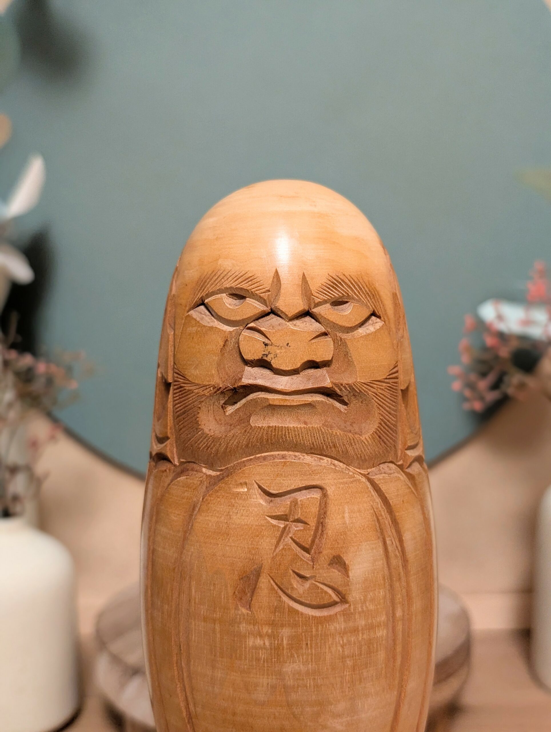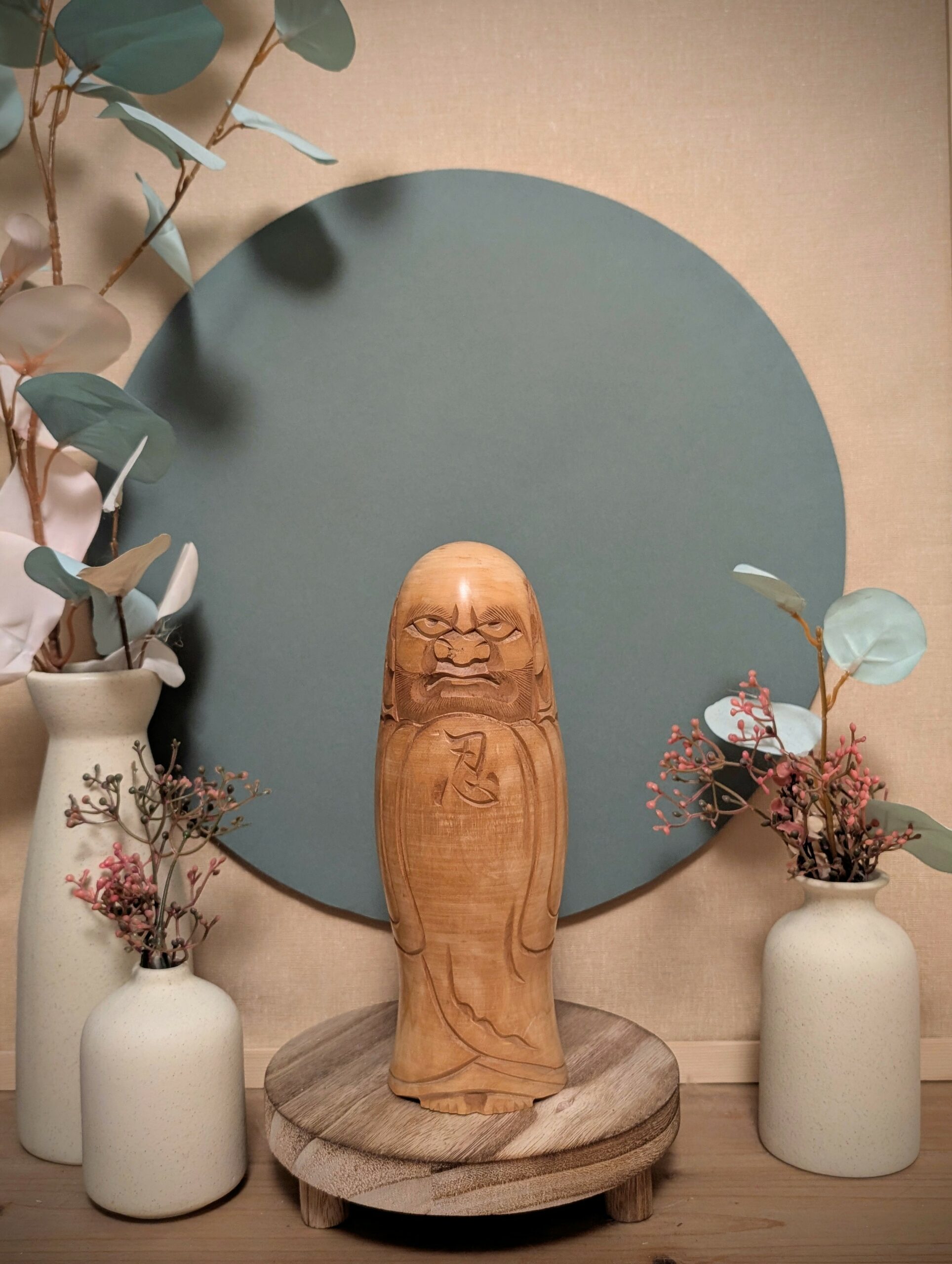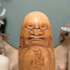 Kokeshi japonaise sculptée en bois massif, œuvre de Suizan, également connu sous le nom de Yokuzan, représentant un Daruma, figure puissante et profondément symbolique du bouddhisme zen.