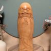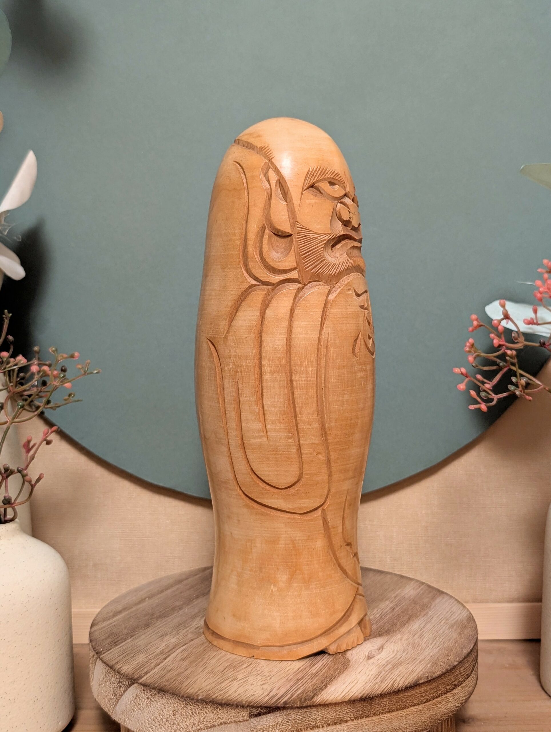 🔹Entièrement sculptée dans un bois naturel non peint, cette Kokeshi se distingue par une sculpture expressive et minutieuse : le visage sévère, aux sourcils marqués et au regard intense, contraste avec la douceur satinée du bois patiné par le temps.