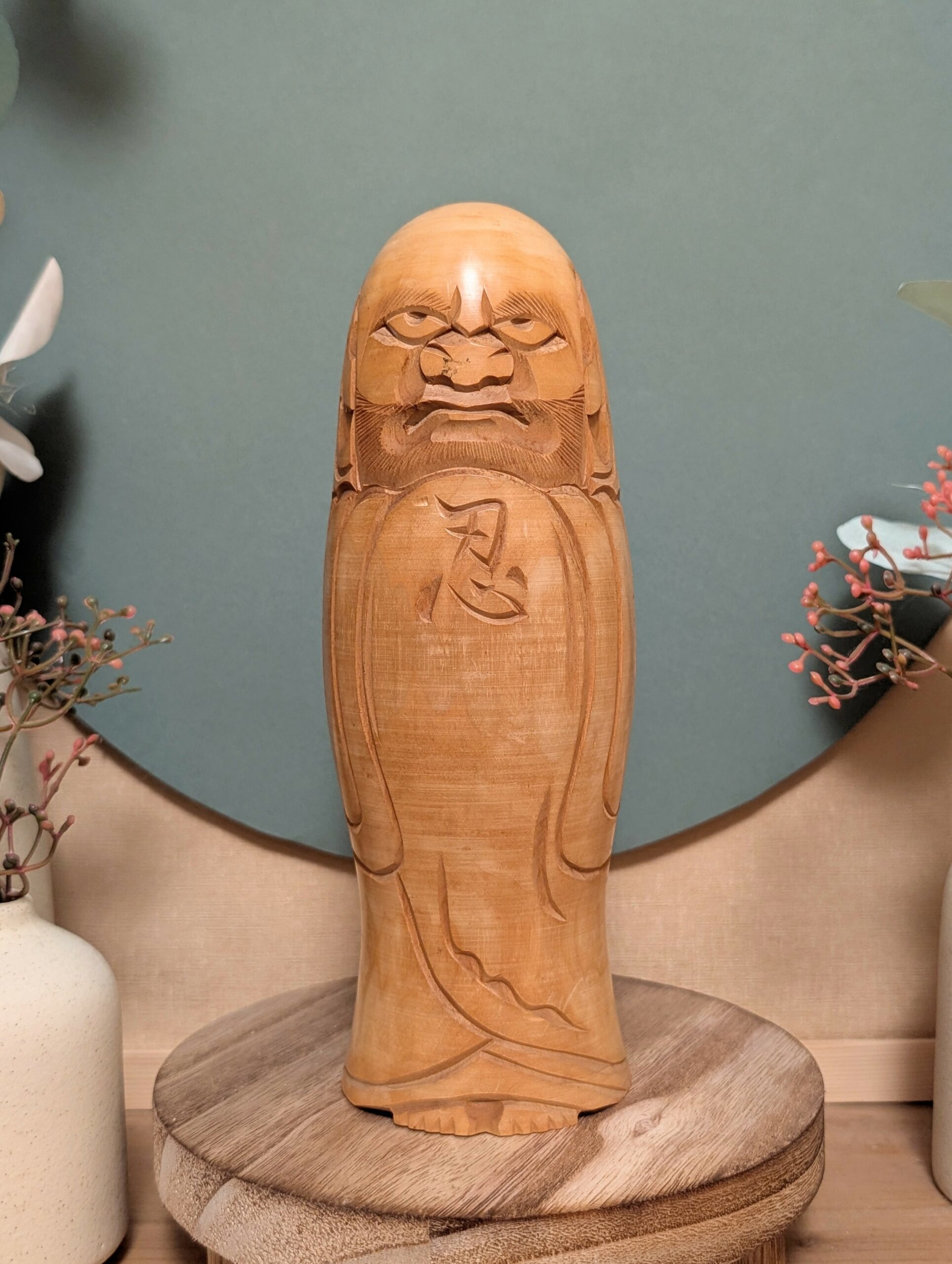 🔹 Sur le torse figure un kanji sculpté, accentuant la dimension spirituelle de l’œuvre.