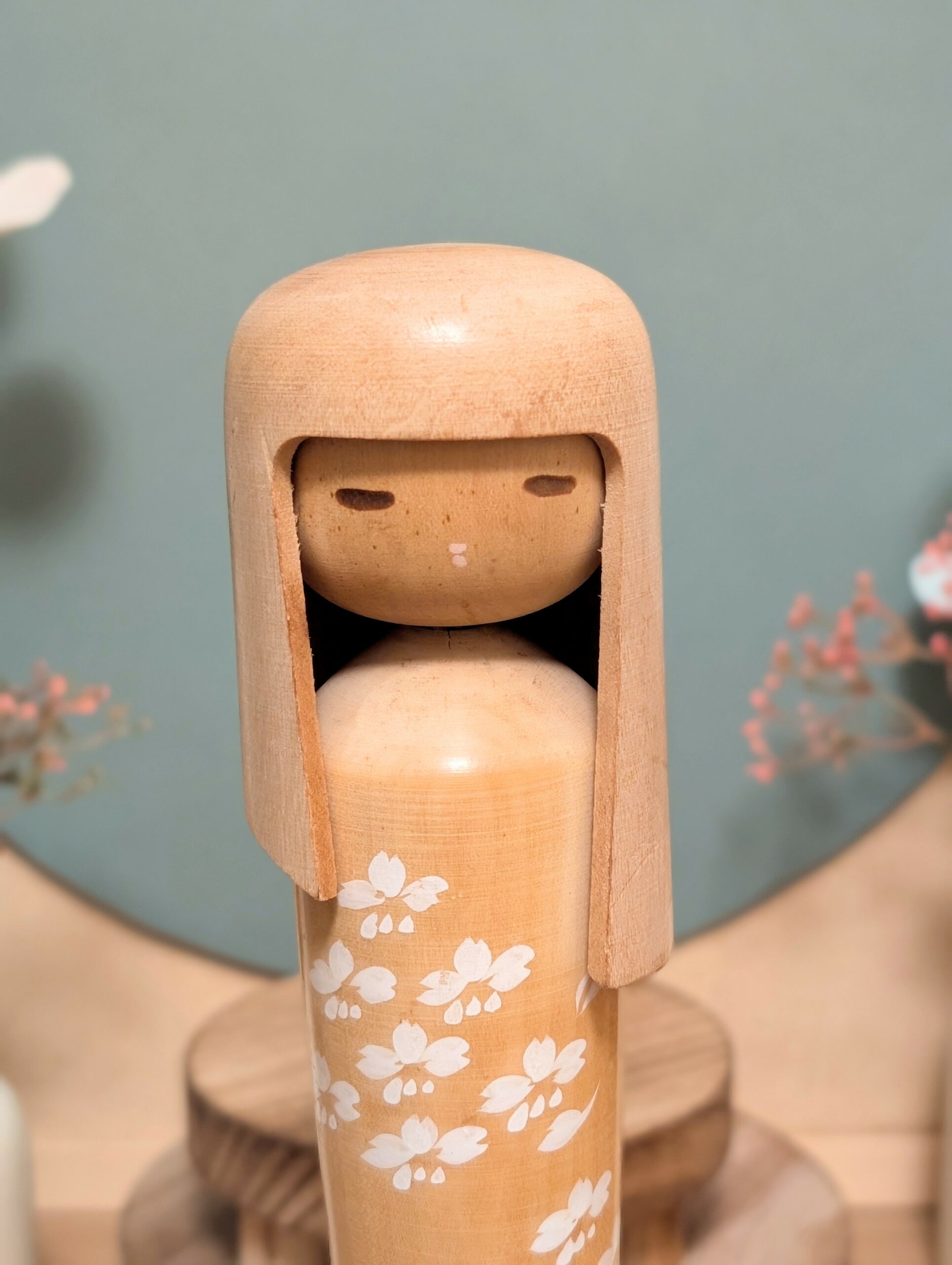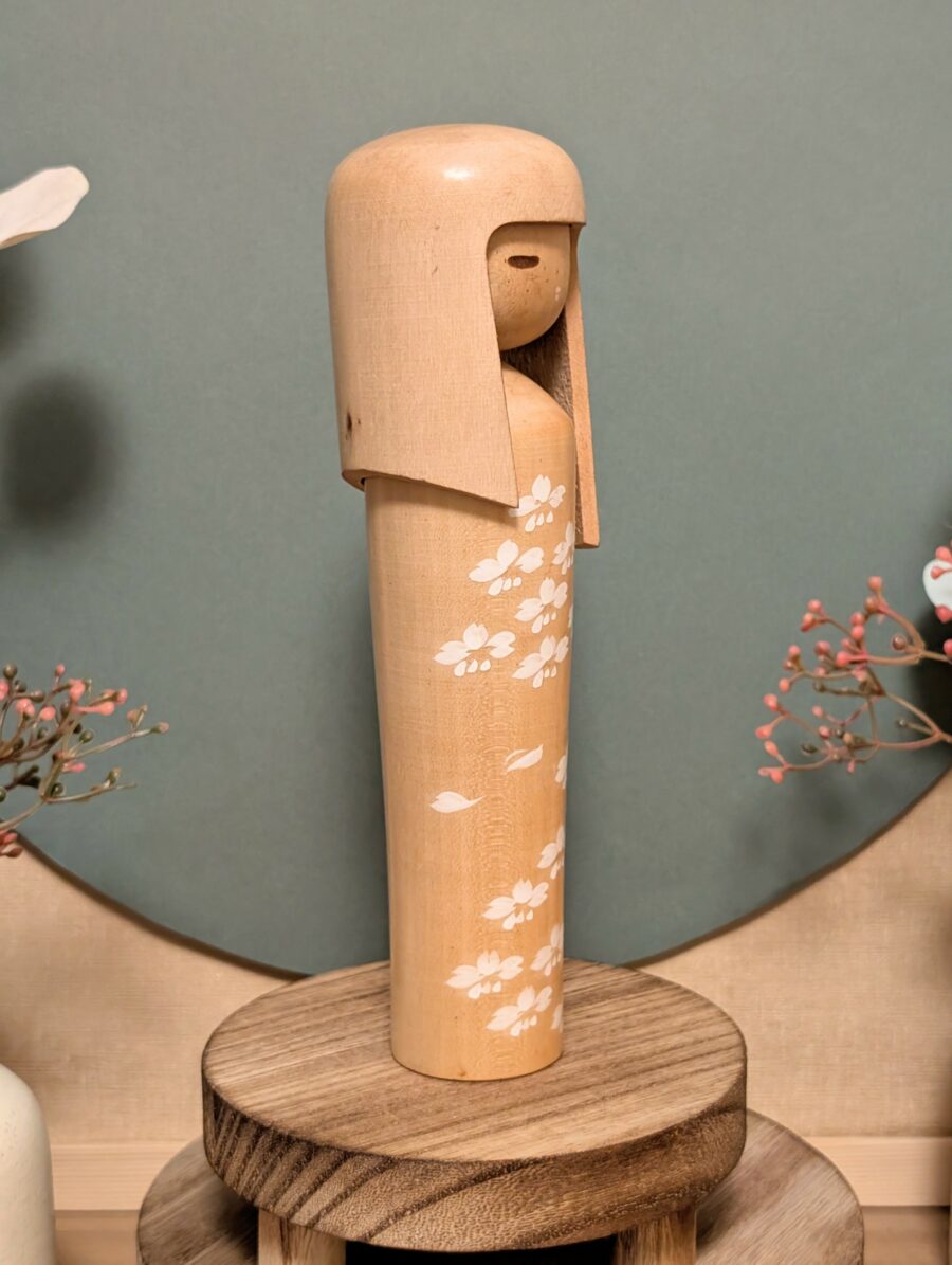🔹Cette pièce illustre parfaitement son style : un corps élancé, des lignes simples et harmonieuses, un visage délicatement peint sous une longue chevelure sculptée, et un décor de fleurs blanches qui rappelle les cerisiers en fleurs.